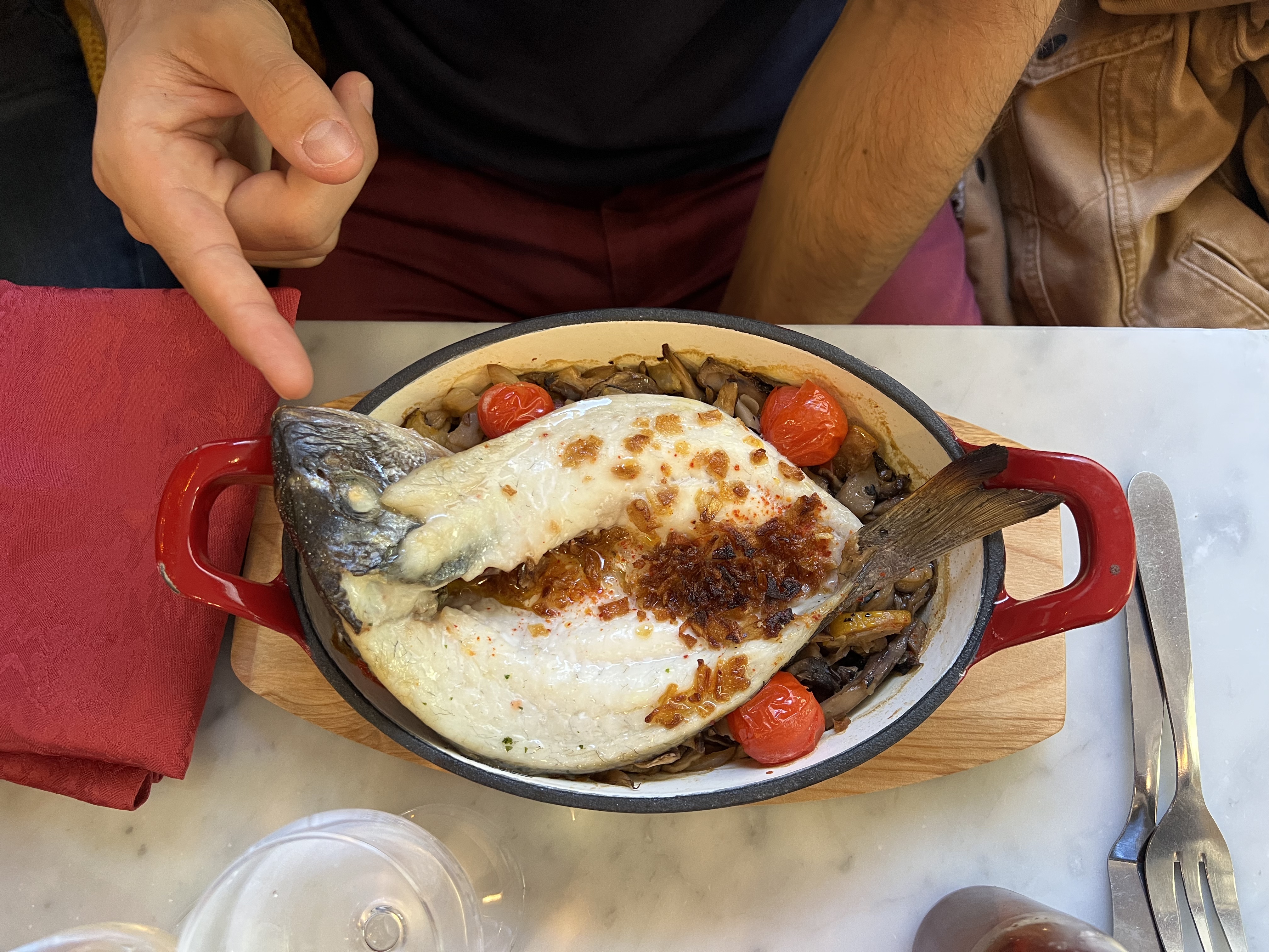 Chaleur étouffante, bruit, promiscuité et cuisine décevante. La dorade baigne dans un jus qui pollue les champignons. On a juste envie de partir. Dommage.
