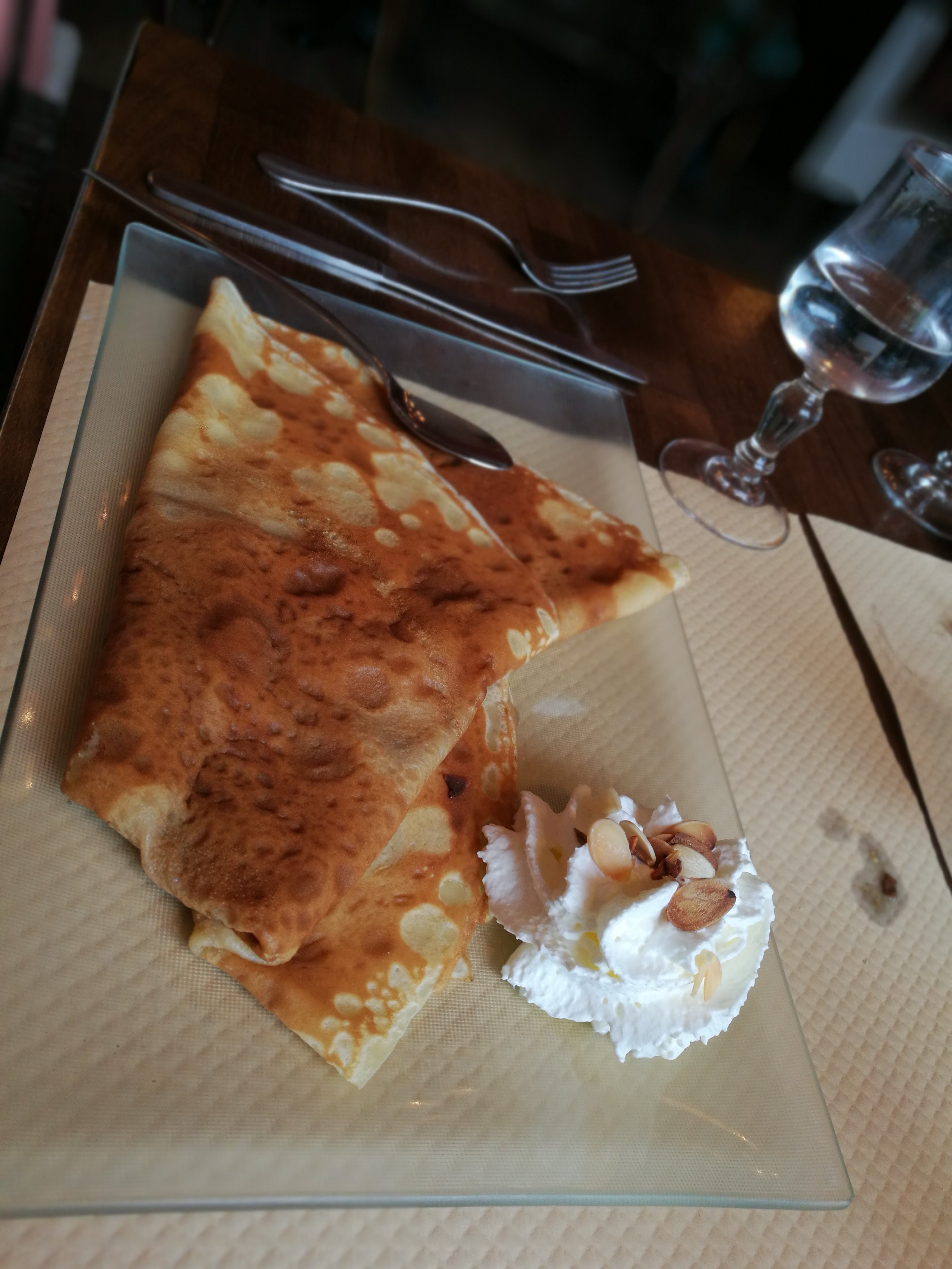 Crêpe délicieuse Vers 18h30, nous avons décidé de manger une crêpe au chocolat. Et nous nous sommes arrêté au « les galets bleu ». Je recommande vivement, pâte à crêpe onctueuse accompagnée de sa crème chantilly maison. Je conseille au plus gourmand d’entre vous !!