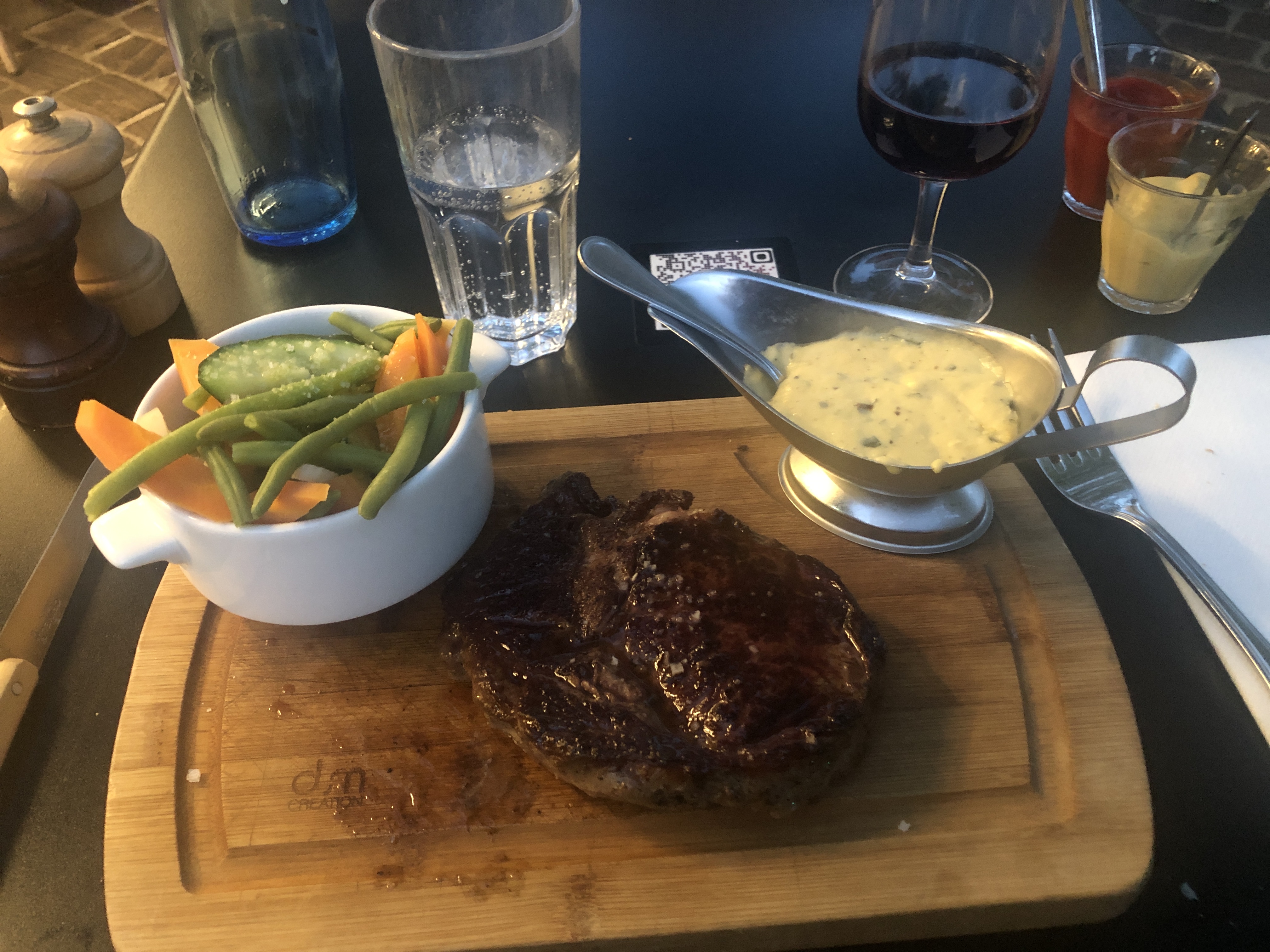Une découverte pour ma part et je recommande, les menus sont bons et honnêtement les portions sont généreuses. Pour ma part j'ai pris la pièce du boucher avec des frites et des légumes et une sauce à l'oignon, j'ai adoré. Le personnel est agréable