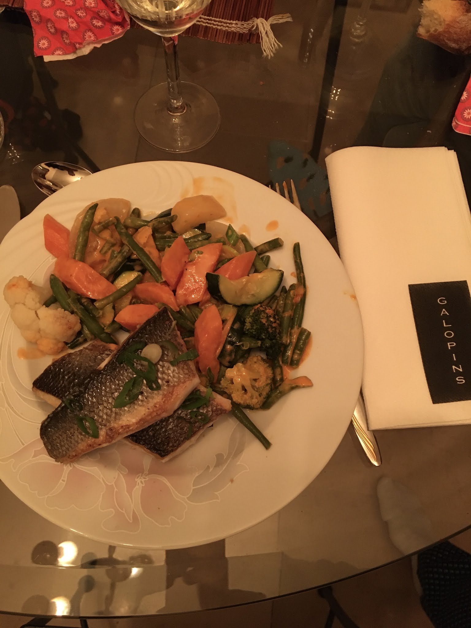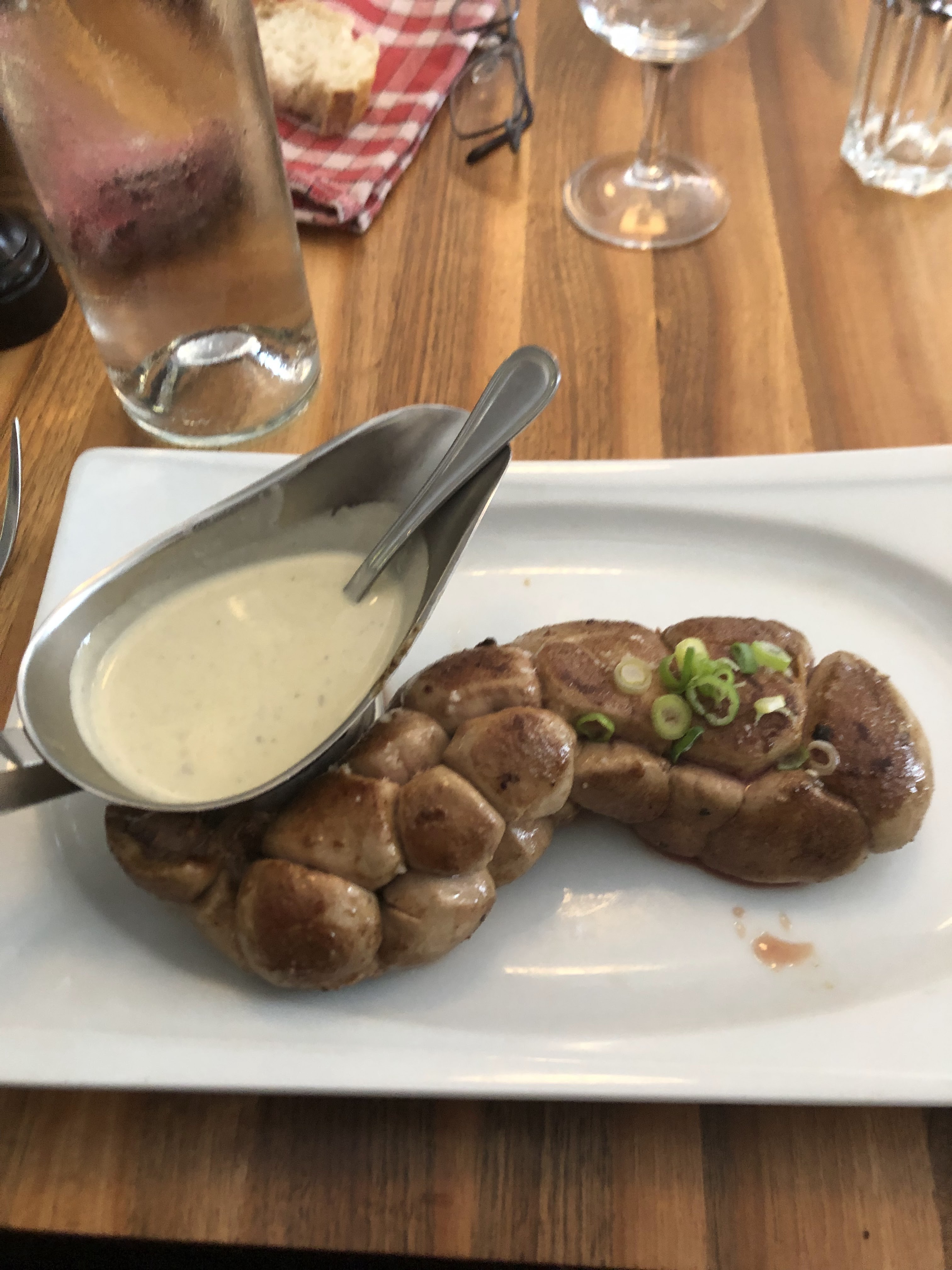 La nourriture était incroyable. Assiette de viande et raviolis aux crevettes pour les applications. Pour les plats principaux ; Poulet à la sauce béarnaise pour ma femme et linguini aux palourdes pour moi. Dimanche du chocolat en dessert. Je suis stupéfait de voir à quel point la nourriture était bonne !! Retour à Boston demain. La cuisine française va nous manquer !!