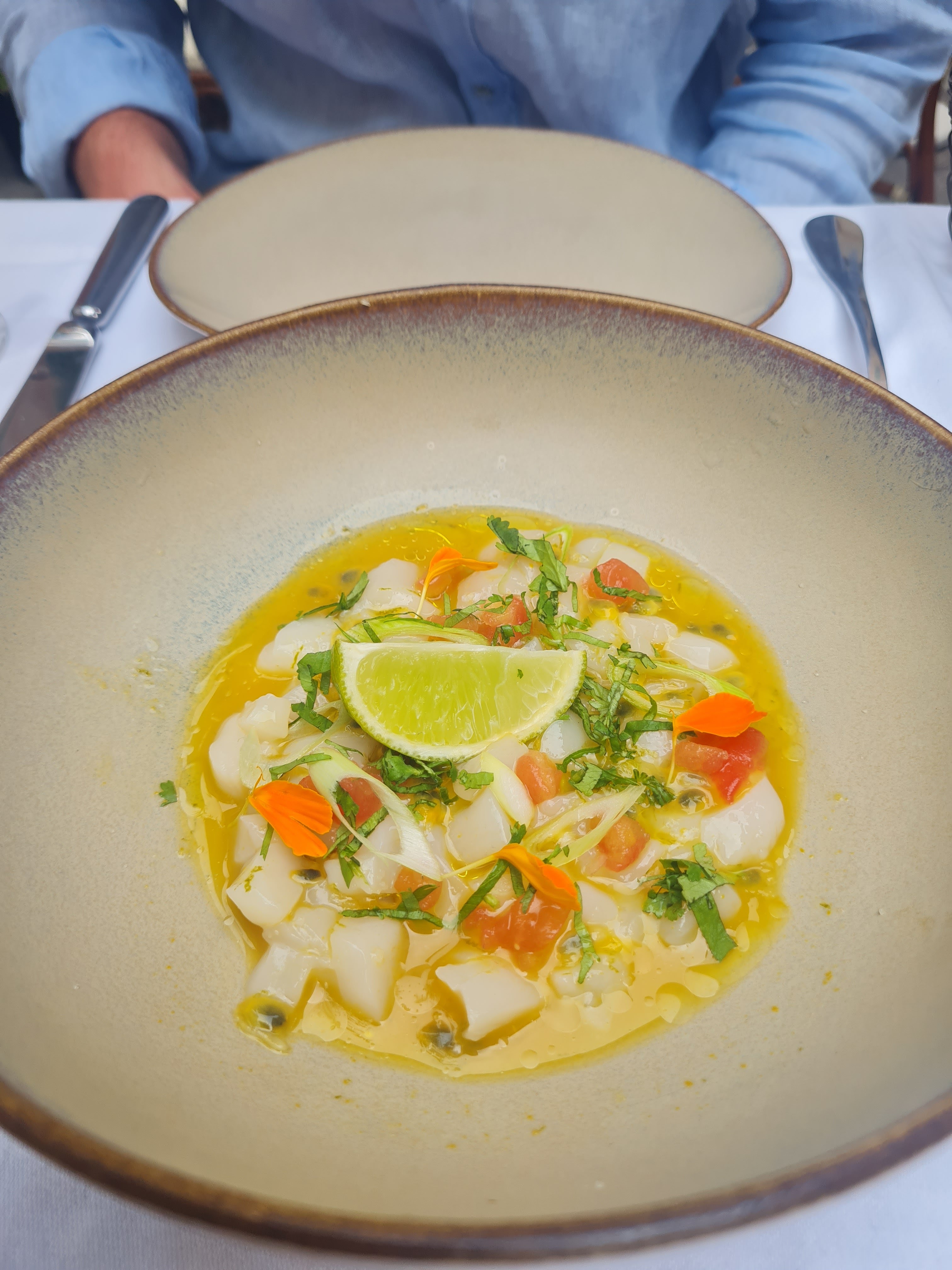 Nous n'avions pas de réservation et avons attendu environ 10 à 15 minutes pour avoir une table. Il faisait très chaud et nous avons demandé de l'eau du robinet avec de la glace. Ils ont dit qu’ils ne donnaient pas de glace avec l’eau du robinet… c’est la première fois que j’entends ça. Il a ensuite fallu 15 minutes pour obtenir un menu, après quoi nous sommes retournés 10 minutes plus tard. Donc, de s'asseoir à la commande de nourriture, il a fallu près de 30 minutes. Nous avons commandé du ceviche et de la salade de calamars pour commencer, les deux étaient excellents, surtout le ceviche était un équilibre parfait entre les épices et les agrumes. Plats principaux, nous avons essayé le porc d'agneau et le risotto aux pétoncles. Le porc était notre préféré. Il n’y a pas de brise là-bas donc il fait très chaud quand on s’assoit dehors en été Ça vaut le détour!