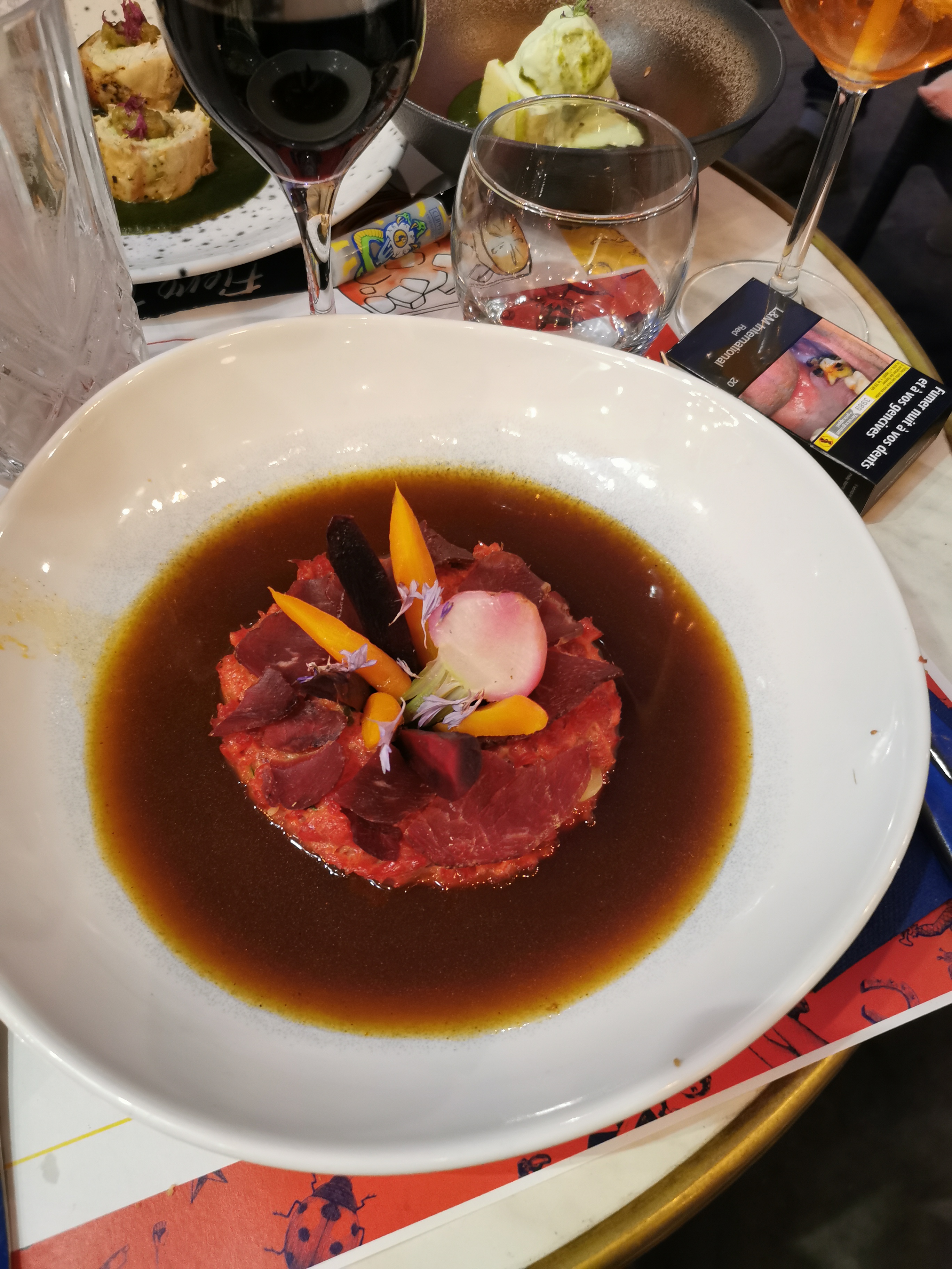 Joli restaurant qui propose des plats revisités avec des mariages audacieux comme ce tartare se boeuf avec son jus asiatique : un régal ! J'aime aussi beaucoup la proposition du verre de vin associé avec le plat.