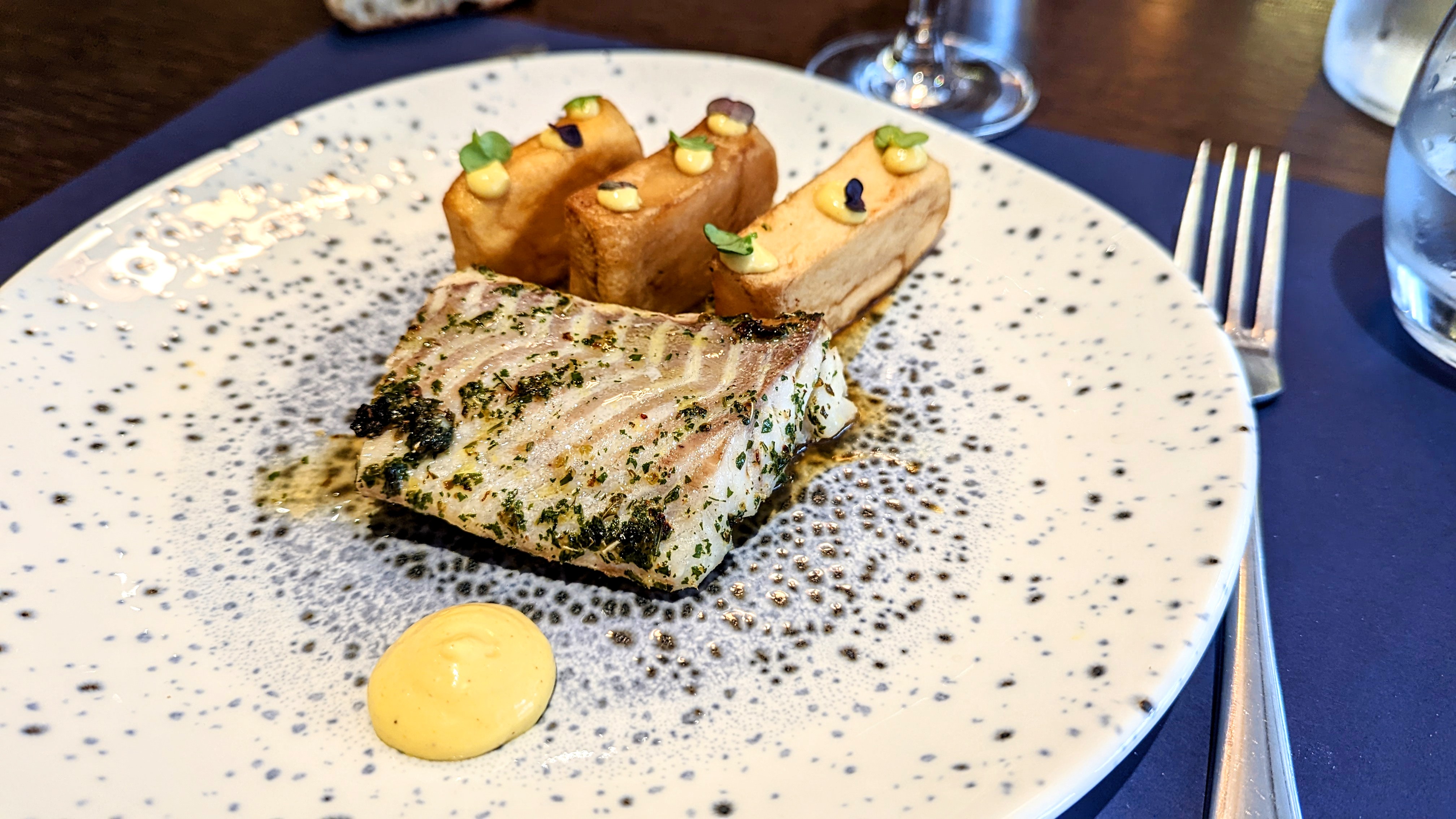 Belle salle. Equipe jeune, sympathique et professionnelle. Les plats montrent une certaine audace ce qui est positif, avec des accords inattendus mais le revers de la médaille est qu'il y a trop d'ingrédients et on s'y perd dans les saveurs. D'ailleurs il y a toujours à côté de l'assiette un accompagenement en plus, signe que tout ne peut pas tenir dans un seul plat. Une simplification permettrait de se recentrer et de gagner en efficacité. Mais ce n'est que mon humble avis.