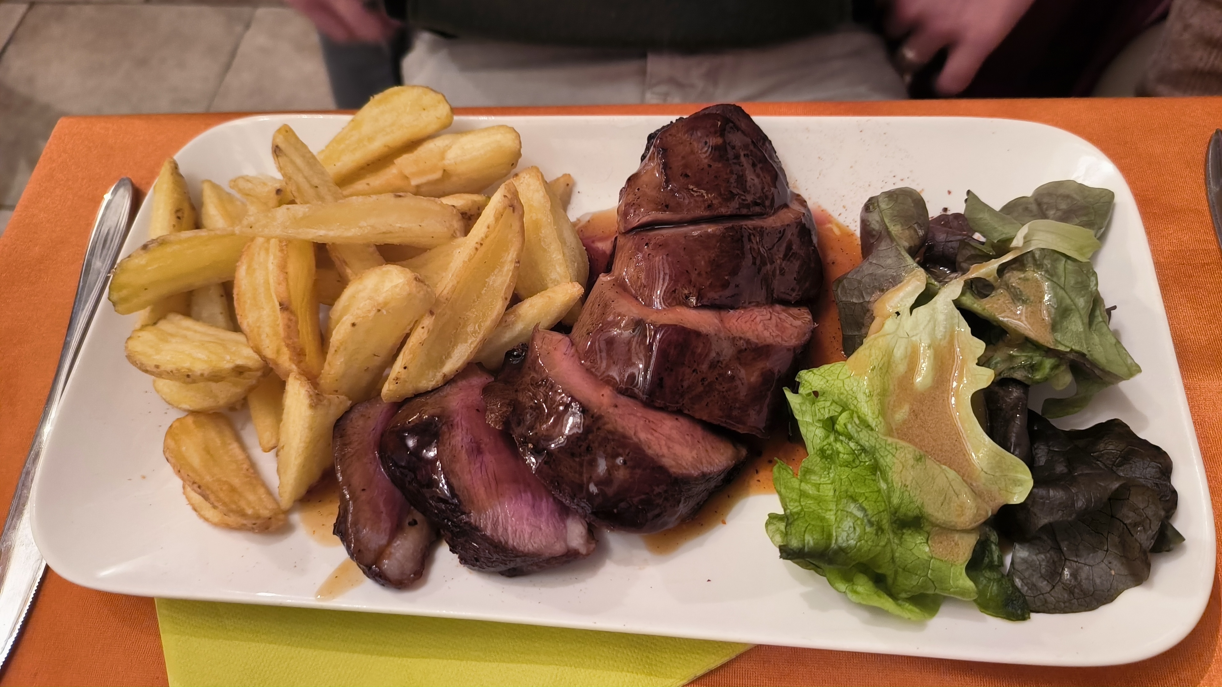 Salle de restauration à l'étage un peu vieillote, et un peu plus cher qu'ailleurs avec le même nombre de menu mais cuisine très bonne. Camembert servi avec quelques tranches de pommes de terre j'ai redemandé une pomme de terre pour pouvoir le terminer et charcuterie servie avec en petite quantité. Magret de canard délicieux et menu enfant copieux. Je recommande cependant.
