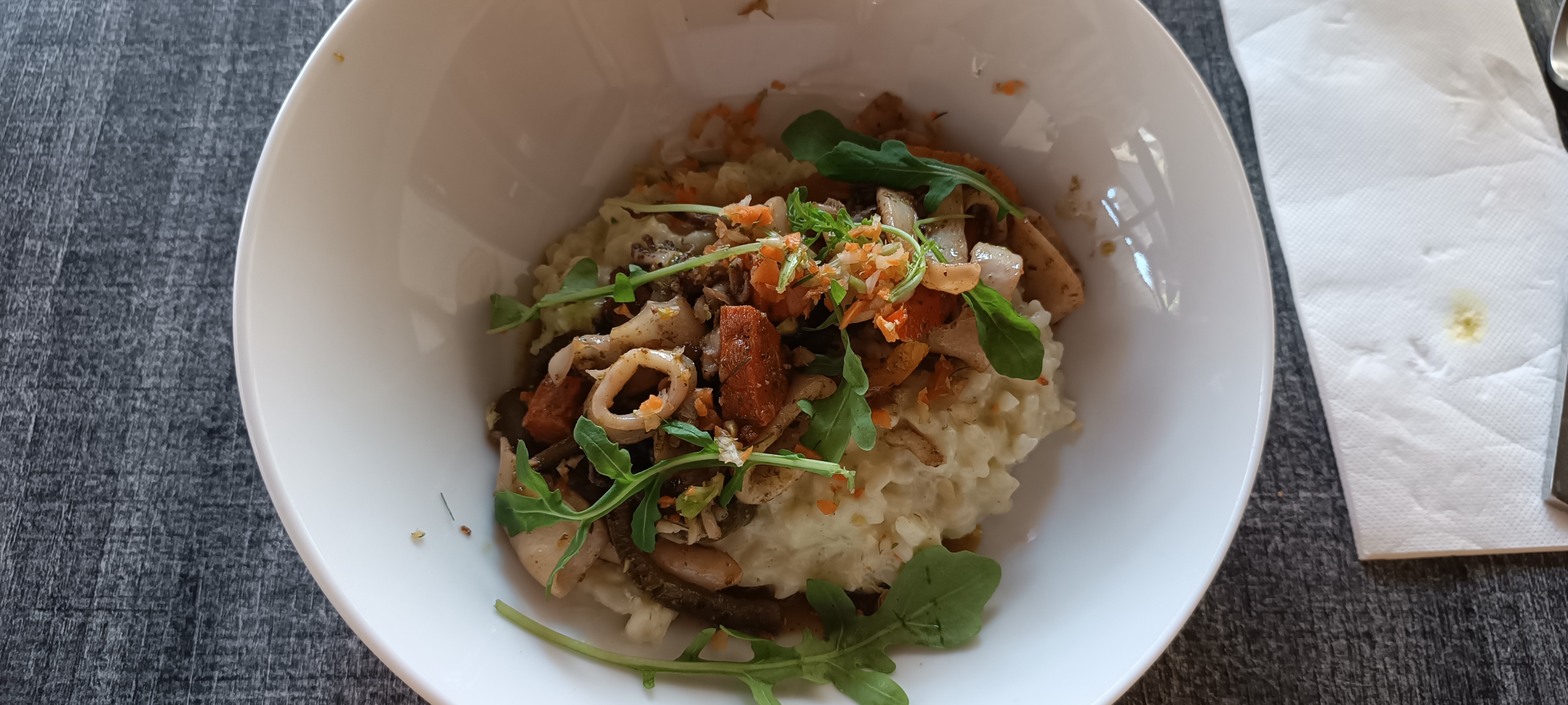 Pas génial. Les calamars croustillants au chorizo et aux poivrons étaient… un mauvais risotto avec quelques morceaux de chorizo. Le steak était trop gras. Je ne le recommanderais pas. Pour un déjeuner décontracté, je recommande l'une des crêperies
