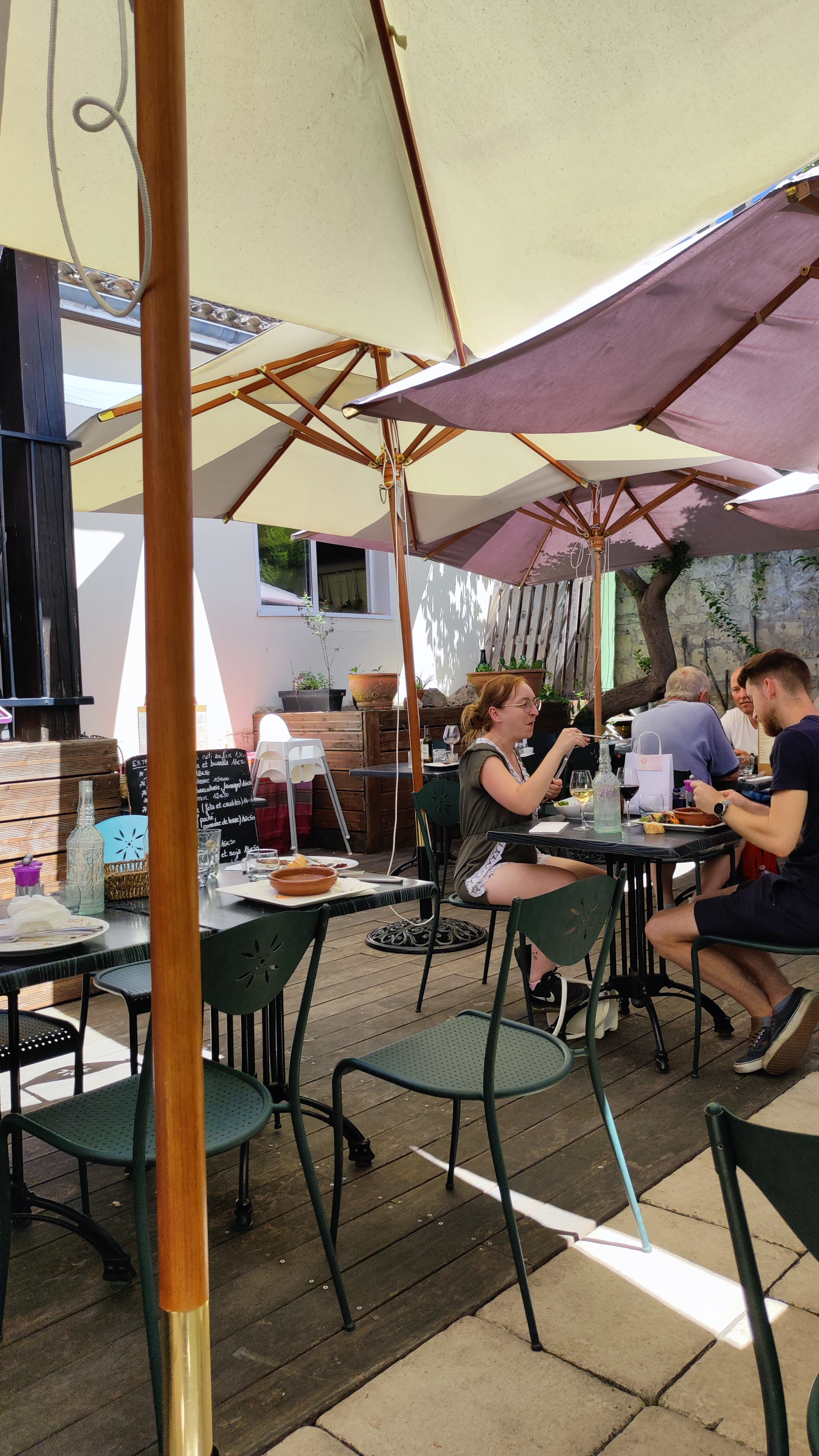 La nourriture était bonne. Le service un peu lent. C'était une belle journée pour s'asseoir dehors et déguster un verre de vin.¹