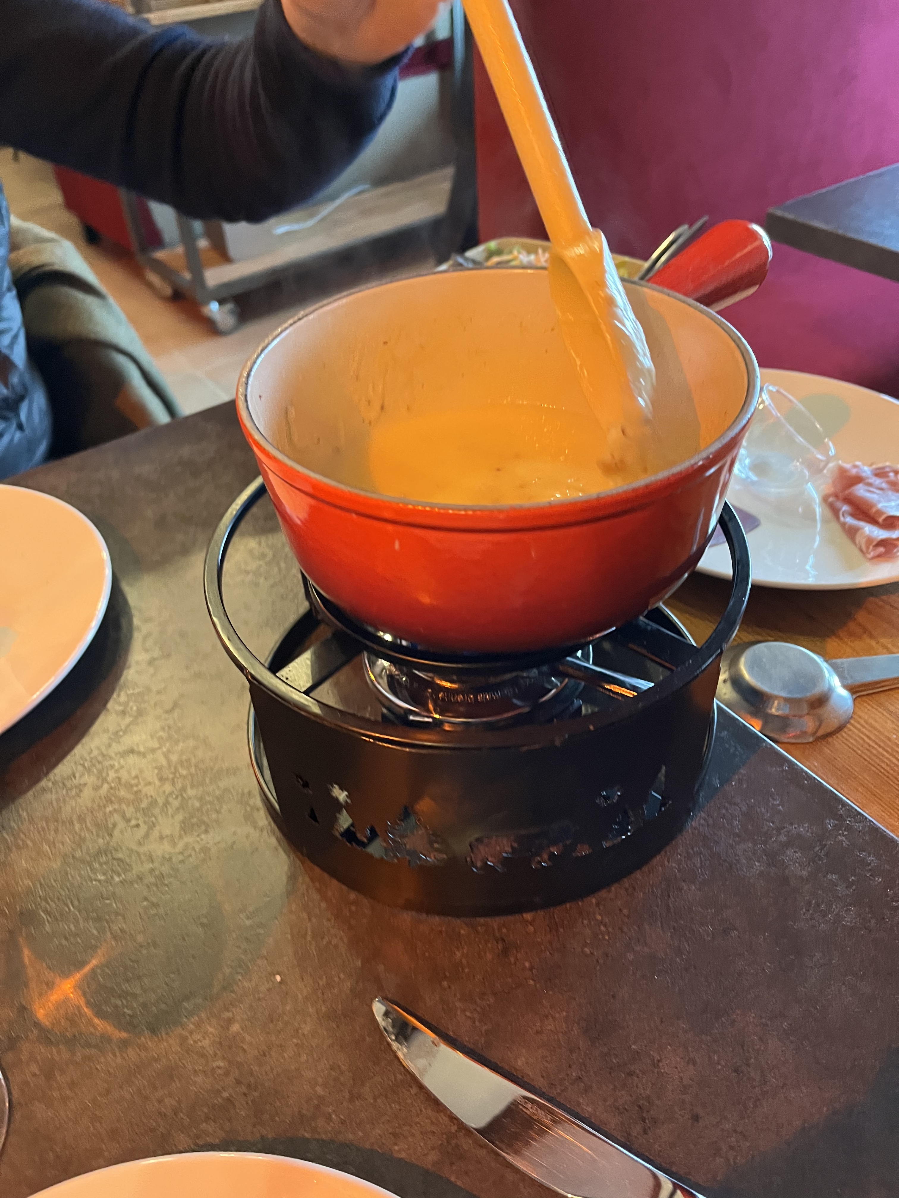 La surprise de se retrouver en haut des pistes en rentrant de la plage 😄 Parfaite quantité de fondue et délicieux vin blanc pour un déjeuner d’hiver