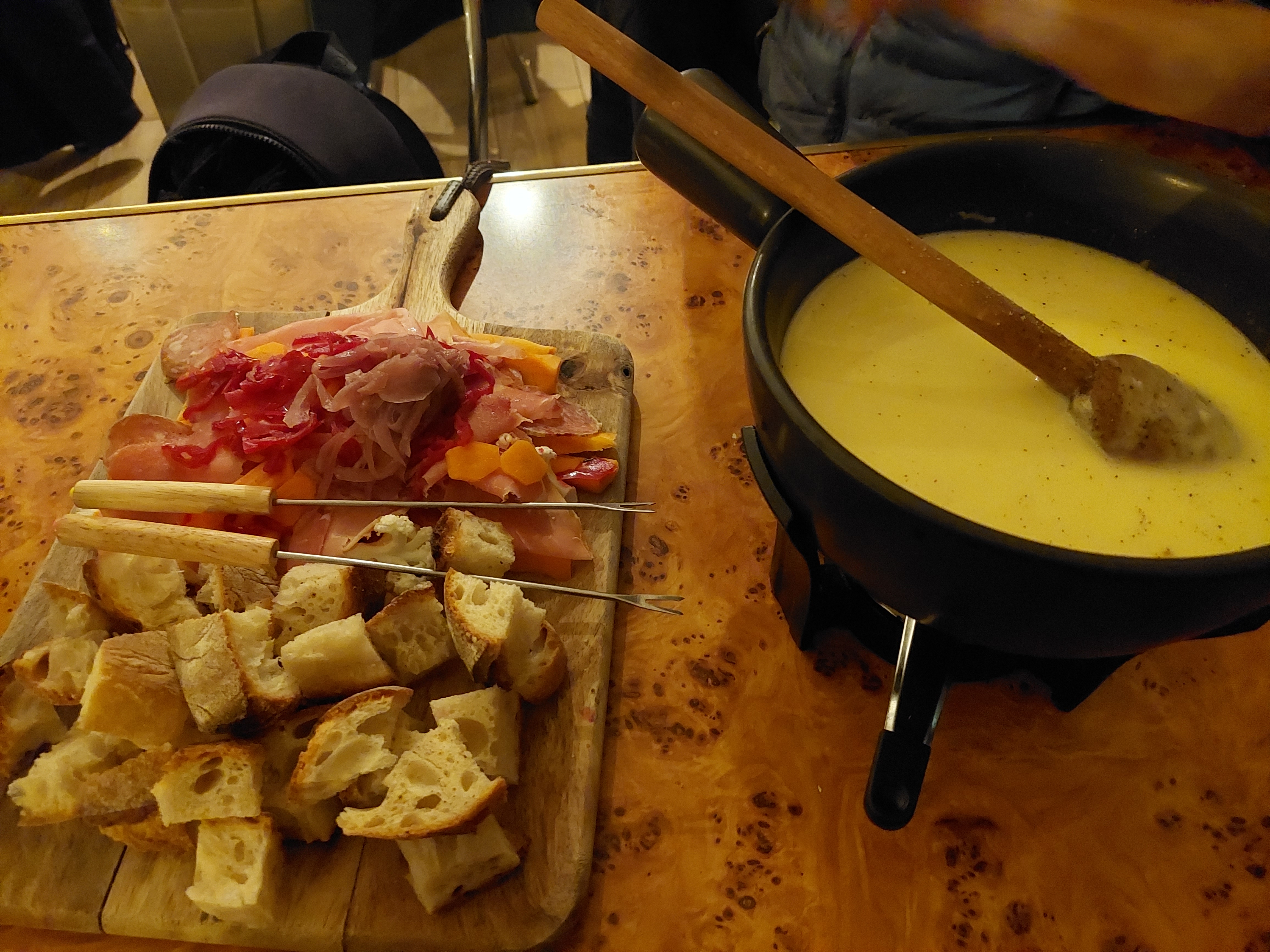 Prix assez élevé. Mais Très bon acceuil. Nous avons pris la fondue et une bouteille de crément pour environ 75 ou 76 euros. Le fromage de la fondue était très bonne. Le service très aimable et attentionné. Une ambiance chaleureuse. On reviendra mais pour goûter les plats 👌🏾👌🏾👌🏾