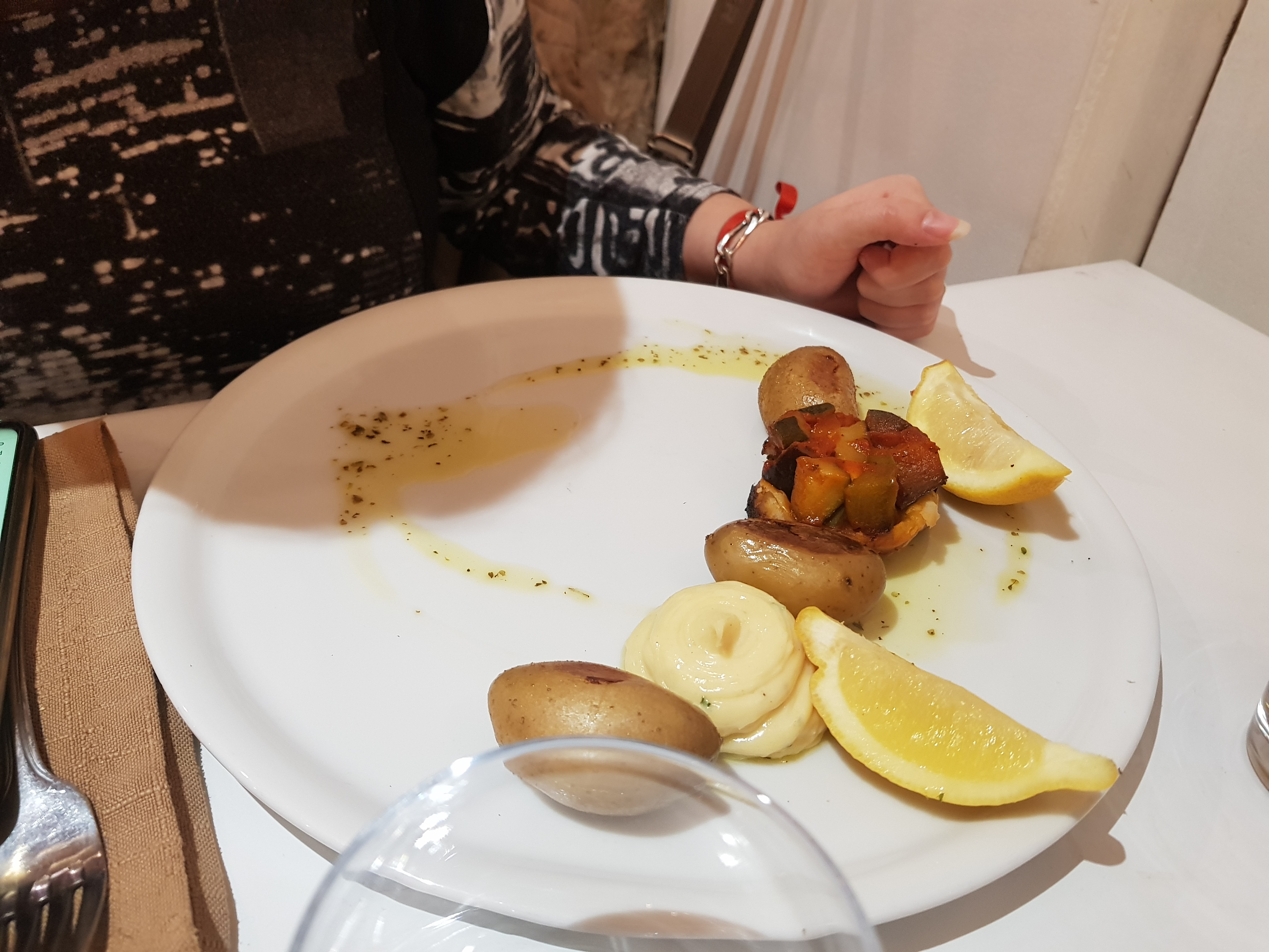 Beaucoup d'attente mais bon le patron nous avait prévenu. Sinon à part le filet de poisson dans l'assiette, juste 2 petits traits de purée en garnitures et 1 tout petit flan. Vraiment léger. Soupe de poisson bonne mais la rouillé moyenne.