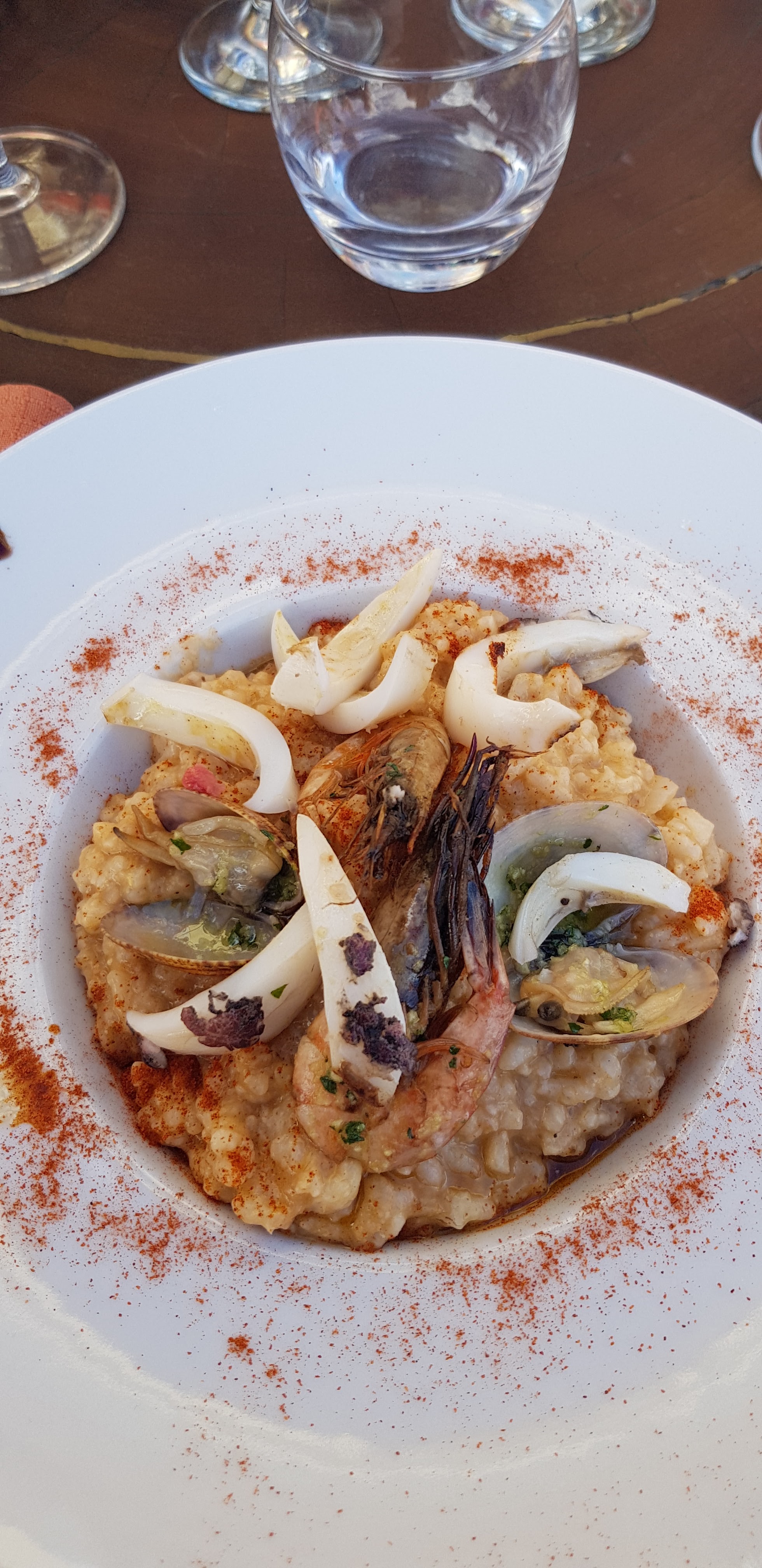 Risotto très décevant : riz trop cuit, garniture congrue (2 palourdes, 2 crevettes. 6 morceau de sèche), le tout servi tiède à 23 € ! A éviter.