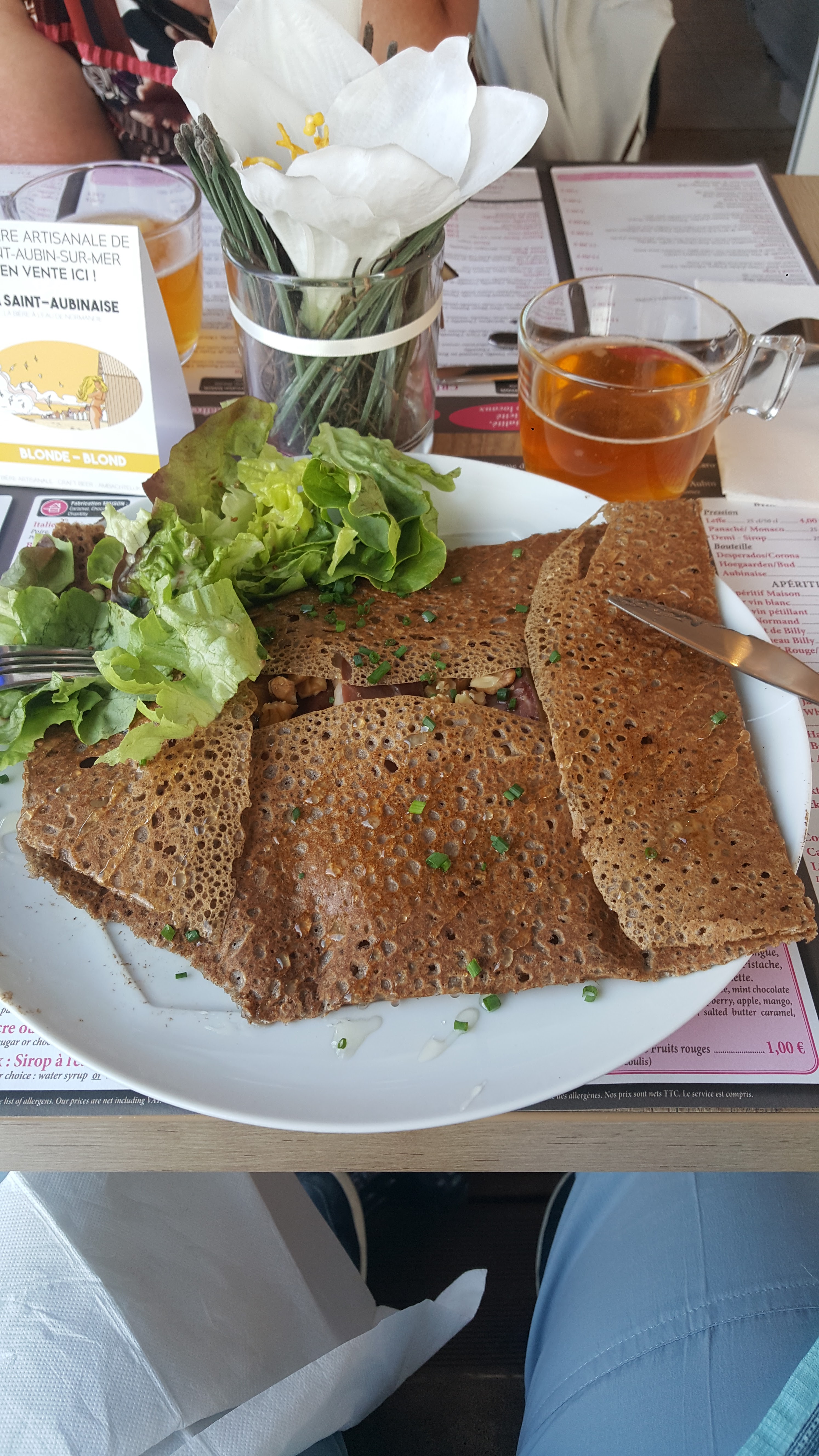 Petite crêpes Normande ,ils ont eu un souci donc on a mangé en décalé mais c était pas quand nous avons réglé l' addition surprise 1 bouteille de jus de pomme nous a été offerte. Voilà un endroit qui a du savoir vivre et d' une gentillesse . Bonne fin de saison.