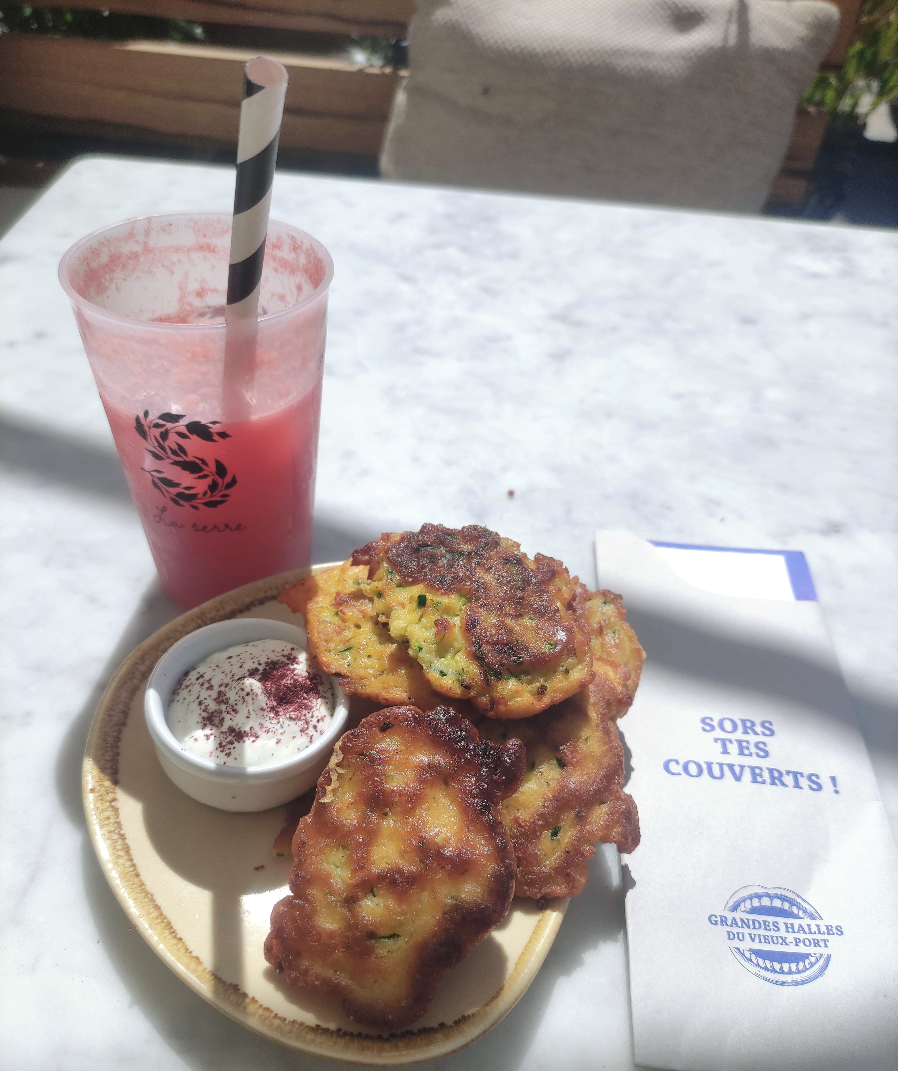 J ai adoré ce nouveau lieu de partages gustatifs implanté près du Vieux Port qui dispose de plusieurs restaurants au choix : crustacés, hamburgers, spécialités Libanaises... Spéciale mention pour l'enseigne La Serre pour son concept végétarien, produits régionaux et légumes saisonniers ... En image beignets de courgettes à la menthe et inoubliable cocktail sans alcool (pastèque, concombres, menthe) Nombreuses places disponibles en Terrasse. Hâte de redécouvrir ce lieu à l installation du Marché pour plus de plaisir 🥰