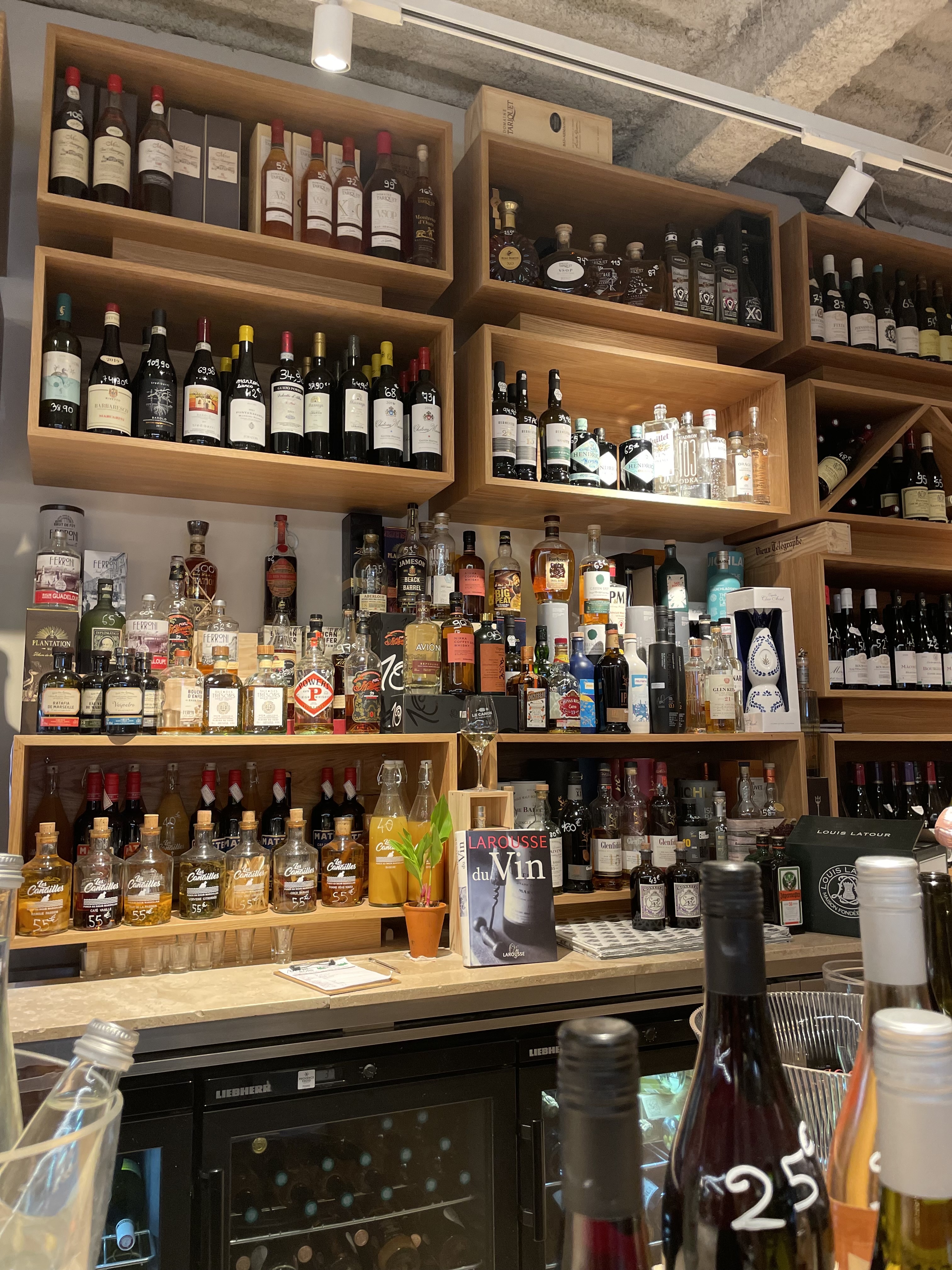 Joli endroit mais déception pour commander et s’installer. Pas assez de places, on se fait chasser du comptoir pour que les serveurs puissent y débarrasser les verres. Pratique quand on a commandé des bouteilles de vin et de quoi manger... En revanche, ça laisse traîner des gens à table sans consommation. Si les gens qui commandent ne peuvent pas s’installer, il faut limiter le nombre de personnes qui entrent. Fraîcheur des aliments à revoir, première fois de ma vie que je vomis après avoir grignoté un plateau charcut/fromages.