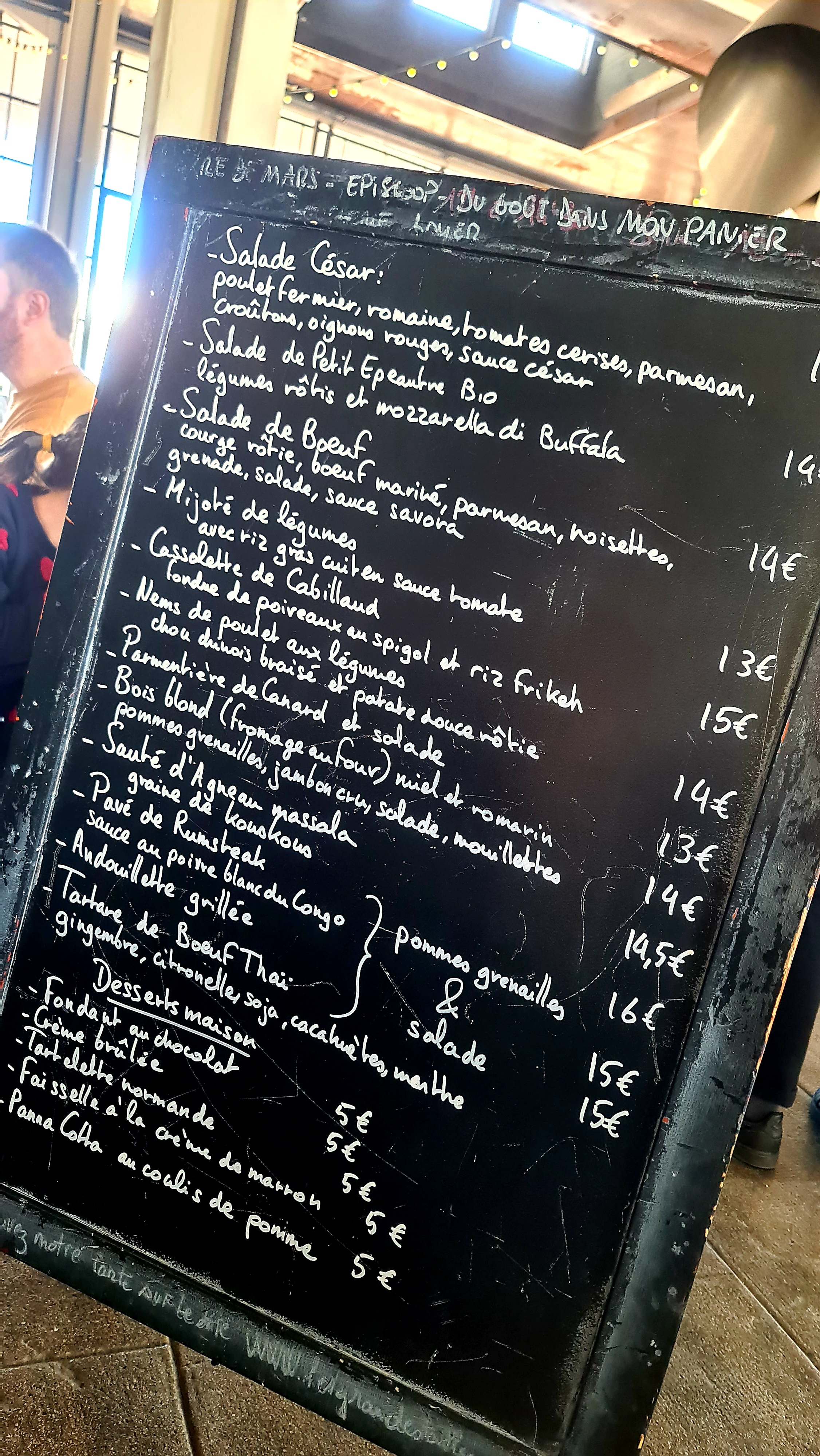 J apprecie le cadre exterieur vaste degagee. La vue sur les voies ferrees, les trains contribue a de l l'originalité sans que cela soit genant. C est ombrage. Par contre je ne dejeune jamais a l interieur. C est tres tres bruyant. Aucun cloisonnement pour absorber les conversations, les bruits de cuisine. La nourriture est correcte. A prix correct. Entre 12 et 25 e selon le choix du plat avec 1 boisson et 1 cafe. Mais par moment c est trop salé ( exemple le rizotto au citron ). Le lundi s y tient le marché bio.