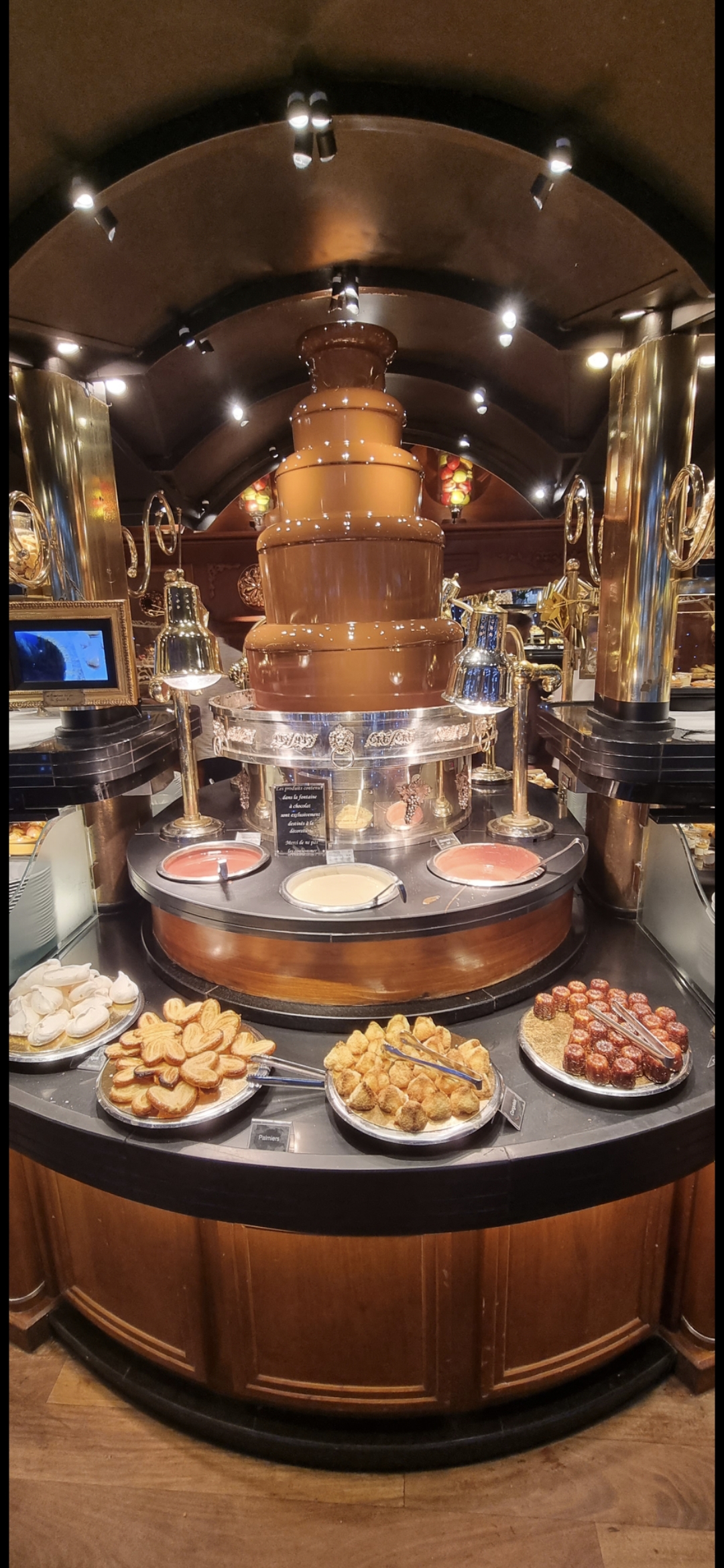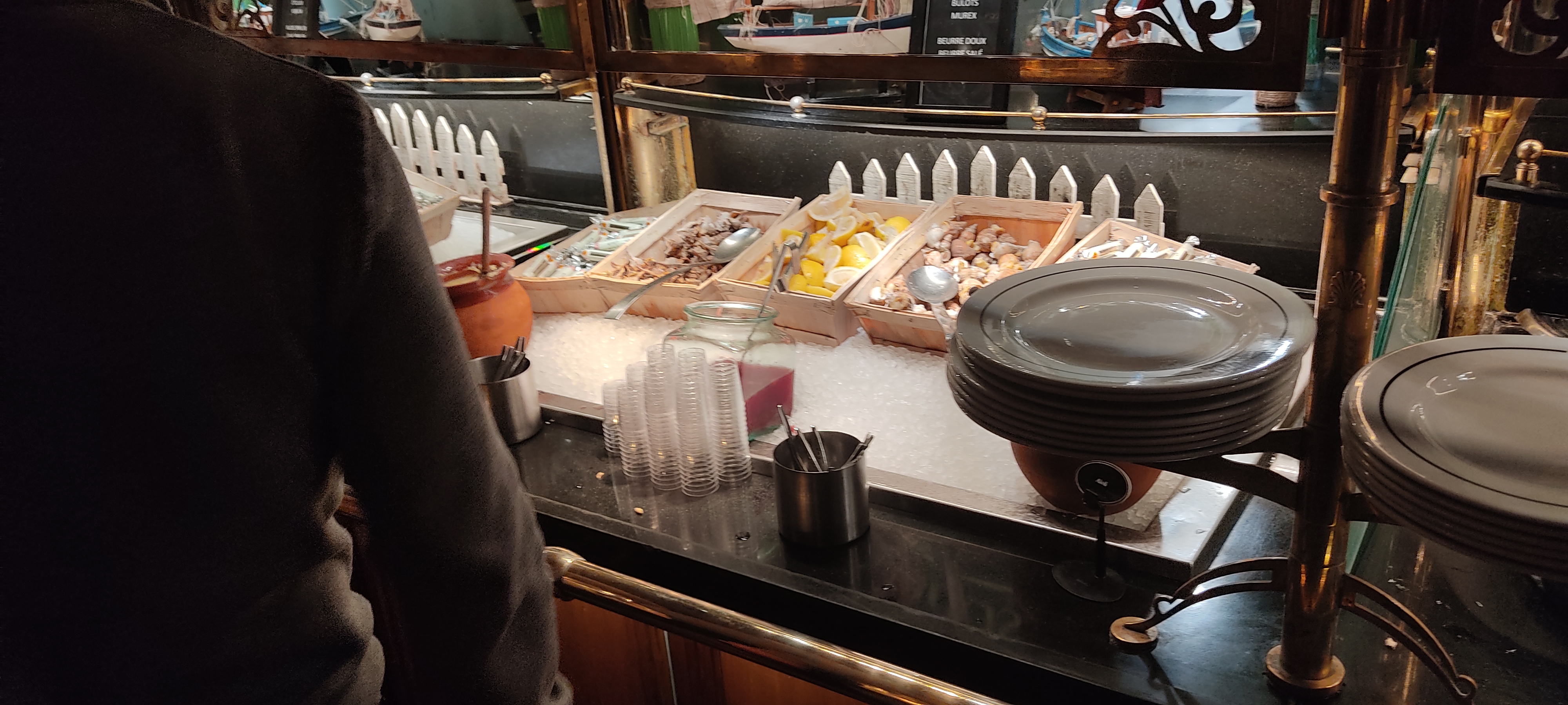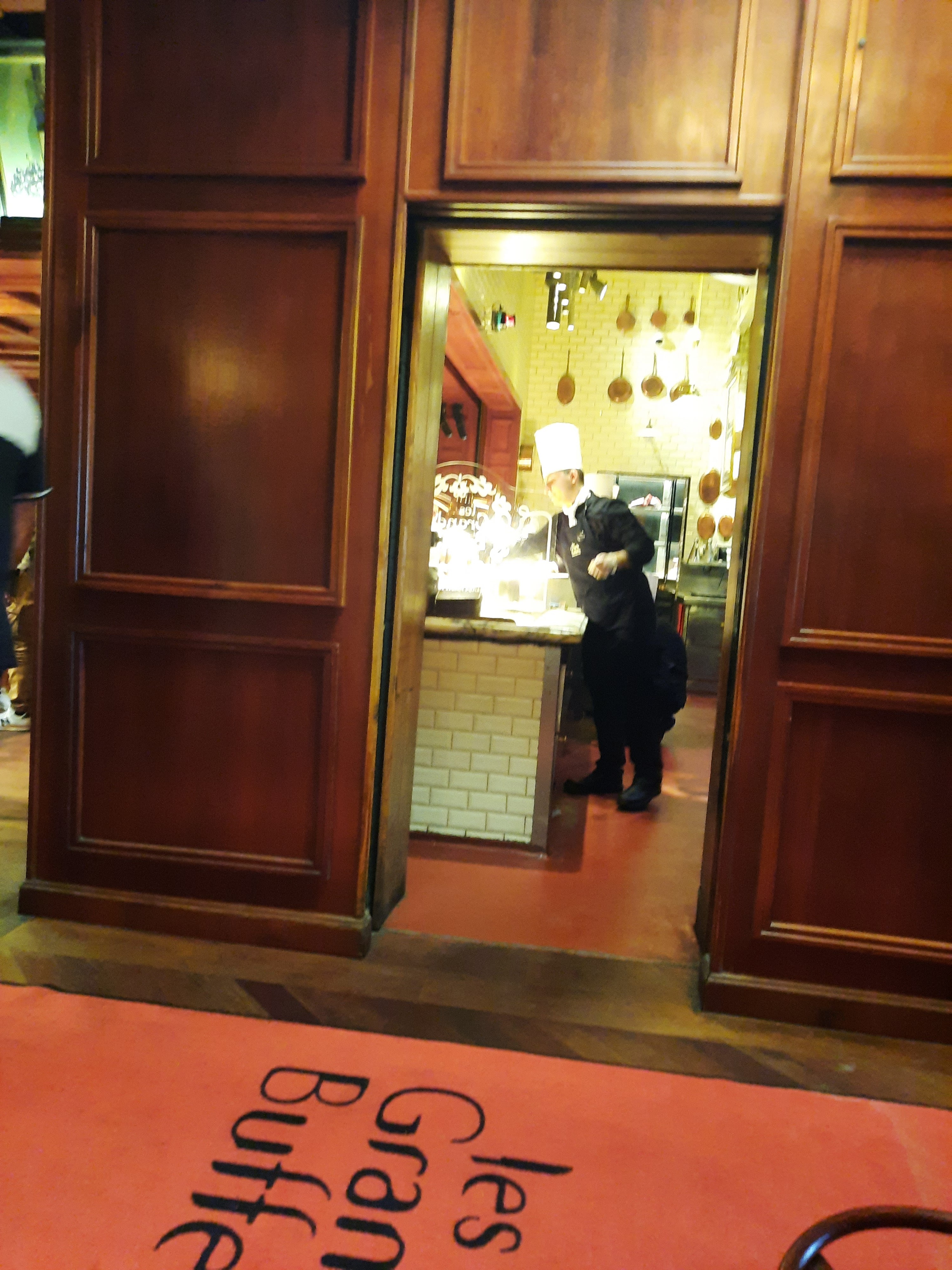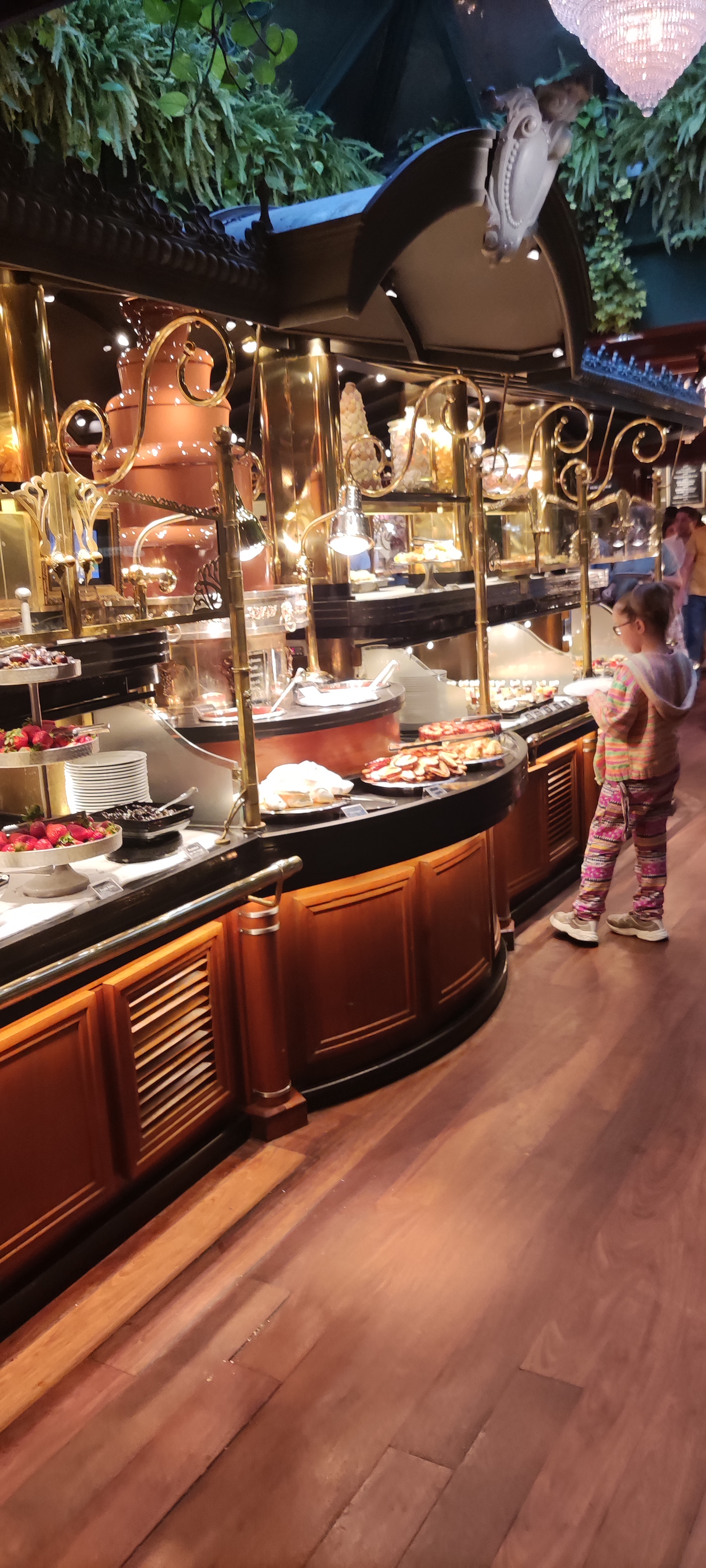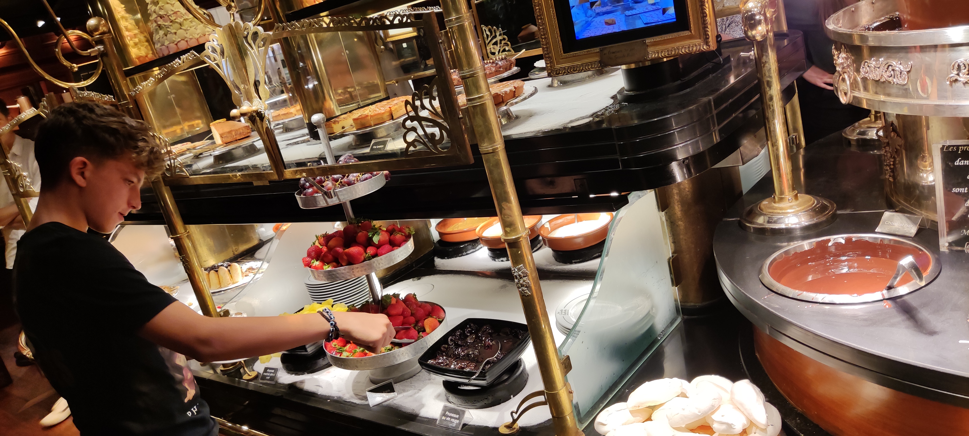 Que dire de ce lieu? Tout a été dit, mais l'expérience est encore le meilleur moyen de se rendre compte. C'est extraordinaire, grandiose, merveilleux. À notre arrivée nous sommes reçus par un jeune homme qui nous dirige dans notre file horaire. A l'heure dite nous rentrons dans ce lieu déjà magique, une femme vérifie notre réservation et Ambre nous conduit à notre table. Nappe et serviettes en tissu, une cheffe de rang nous installe (j'ai pas retenu son nom désolé) et nous présente notre serveuse Sandy. Ensuite nous sommes au Paradis de la gastronomie parce que contrairement à un restaurant classique ou nous devons manger un menu imposé, là c'est à volonté. Mais ça ne serait pas complet si on ne parlait pas du personnel. Tout le personnel y compris le directeur que nous avons côtoyé est souriant, serviable, compétent ( les buffets sont toujours remplis). Même les anniversaires sont souhaités. Un dernier point, vous ne pourrez pas tout manger, alors ne gaspillez pas.
