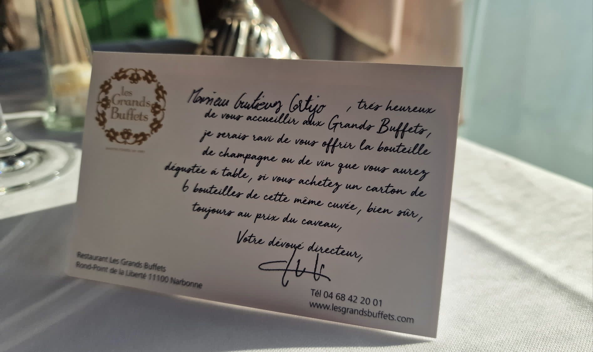Petite escapade à Narbonne et passage au grand buffet Accueil impeccable, les buffets sont grandiose avec un choix plus que varié que se soit en (fruits de mer, jambon, foie gras, plats chauds, fromages, glaces, desserts....) Nous avons juste été déçu par quelques mets soit trop cuit soit trop froid mais vraiment pas grand chose, les vins sont bien conseillés pas chers et de très bonne qualité, le personnel de salle et aux buffets vraiment top de top Il est a noté car ça devient rare dans un restaurant le litre d'eau pétillante est à 1.5 € Un vrai bon moment passé avec des amis