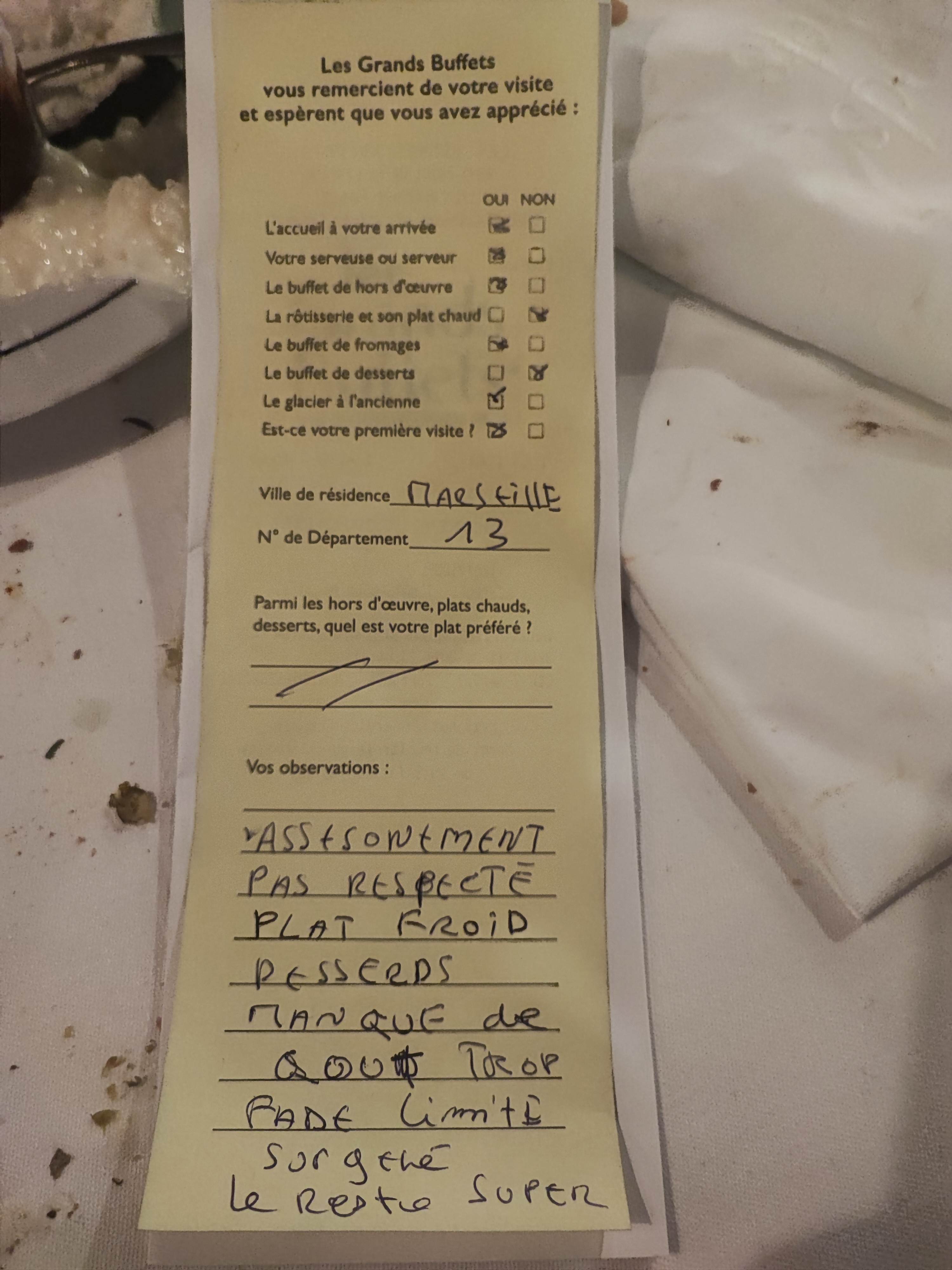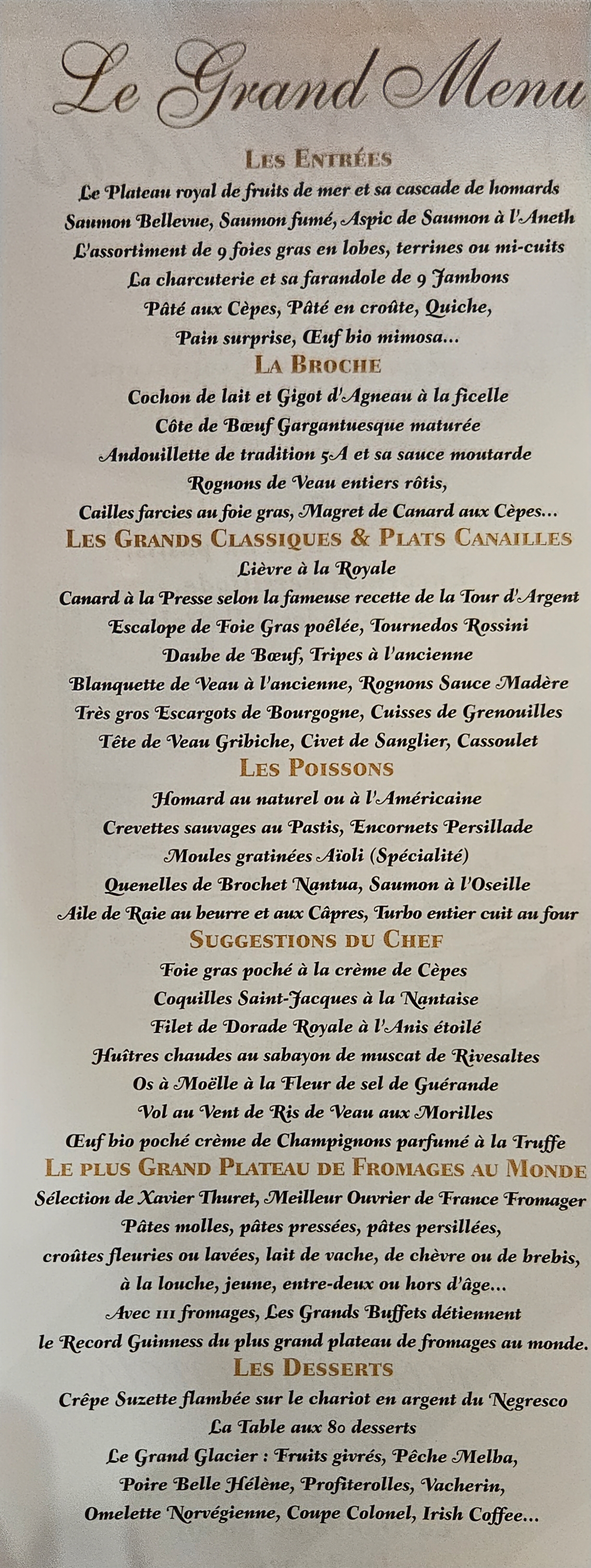JE RECOMMANDE !!! Cet endroit est magique, c'est un restaurant mais aussi un musée !!! Les serveurs/es font leur job à merveille ! La diversité et la qualité des mets sont au rendez-vous ! (57,90€ le buffet à Volonté, mise en bouche, entrées, plats,desserts et digestifs) Le vin (a prix producteur 26€!) était divin !!! Le champagne (25€!) Les eaux minérale plate ou pétillante (1,50€) [Les commentaires à 1 étoiles me font franchement rire! Les gens se plaignent du prix, du monde... Vous avez réservé Aux Grands Buffets!!!!!! Alors oui avec 1000 couverts/ jour , il y a du monde ! et vous mangez ,homard, foie gras, filet de bœuf rossini....et le digestif 🥰..]