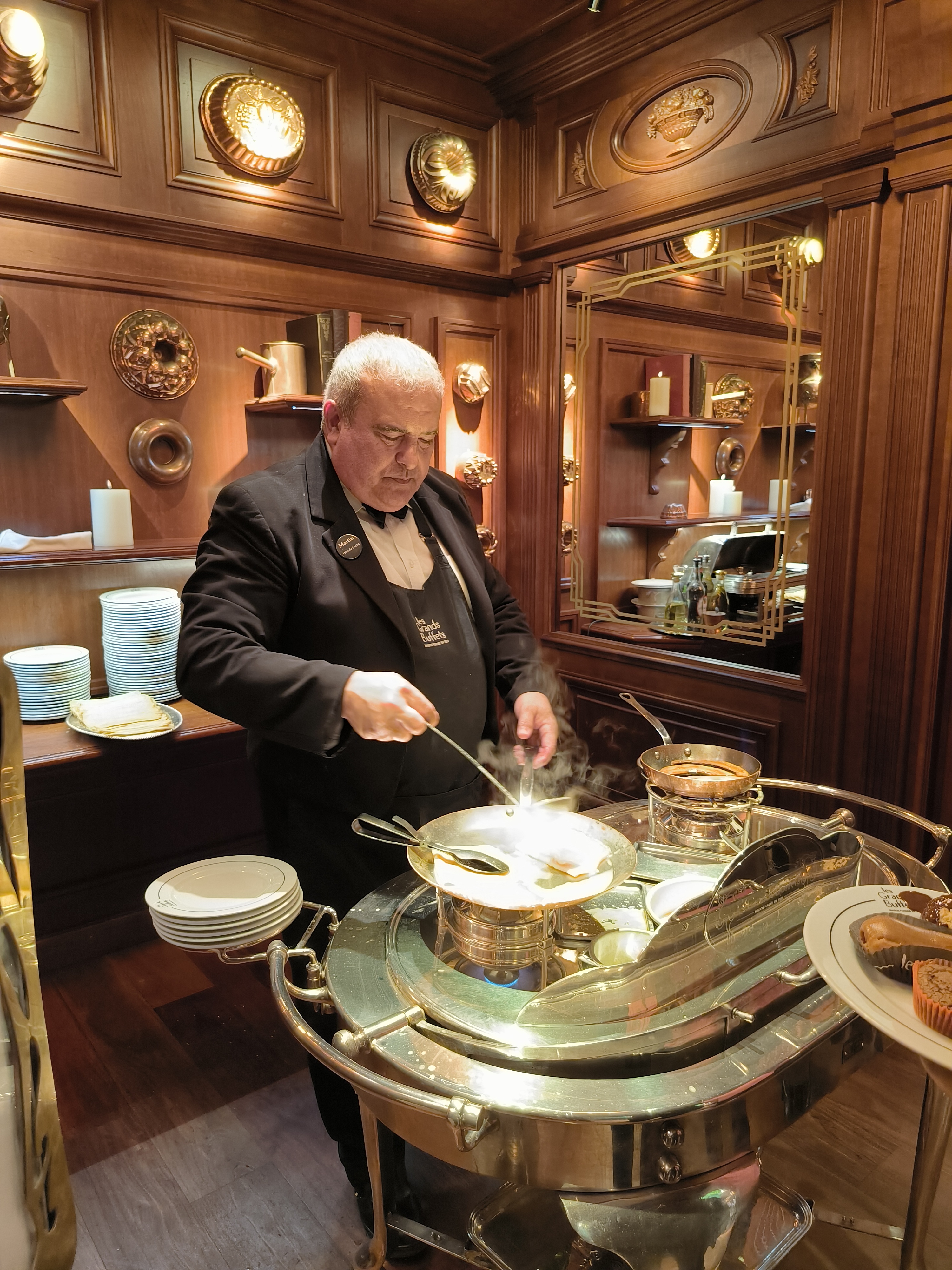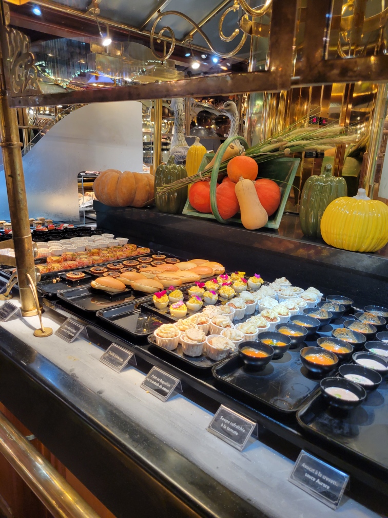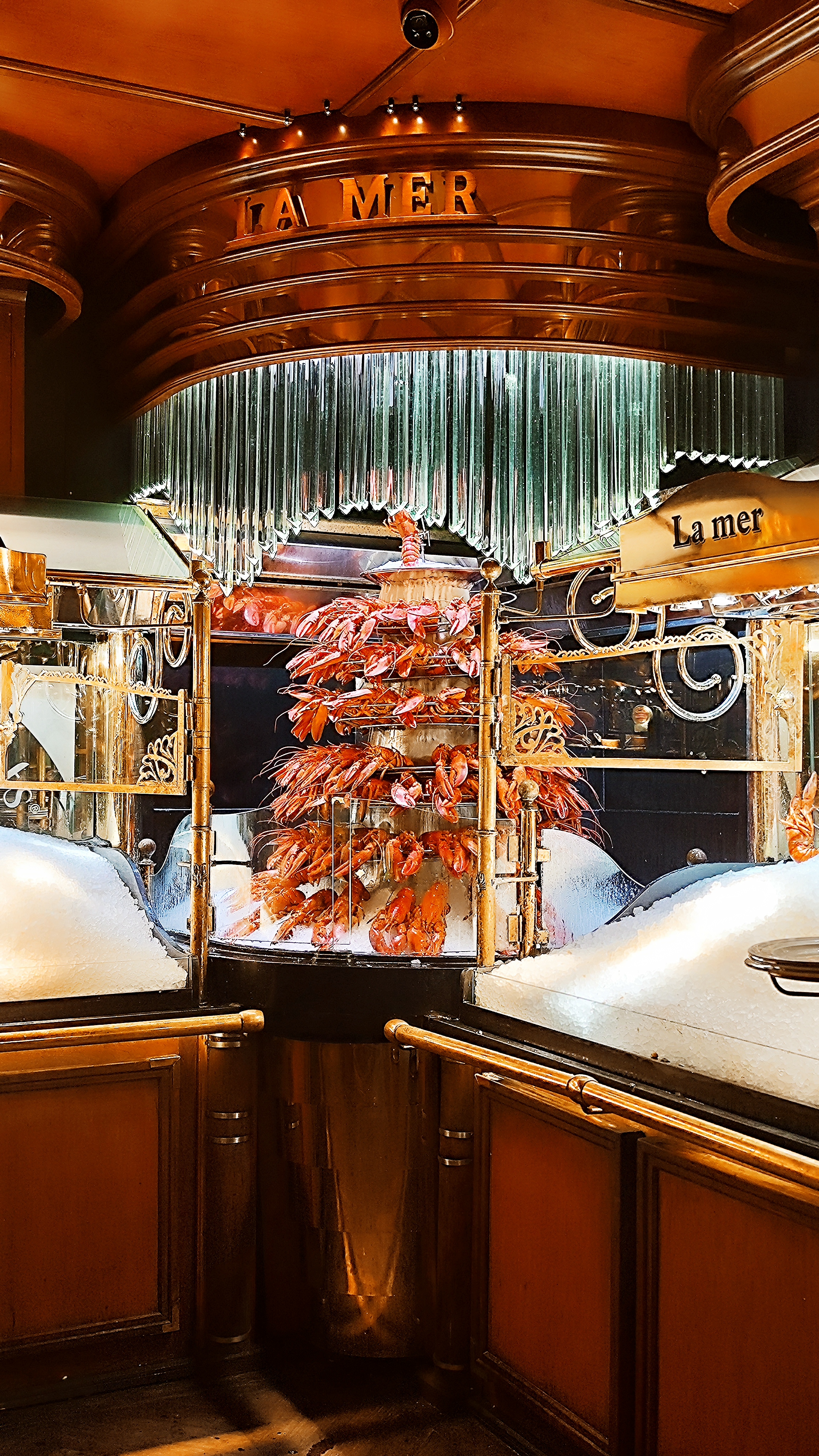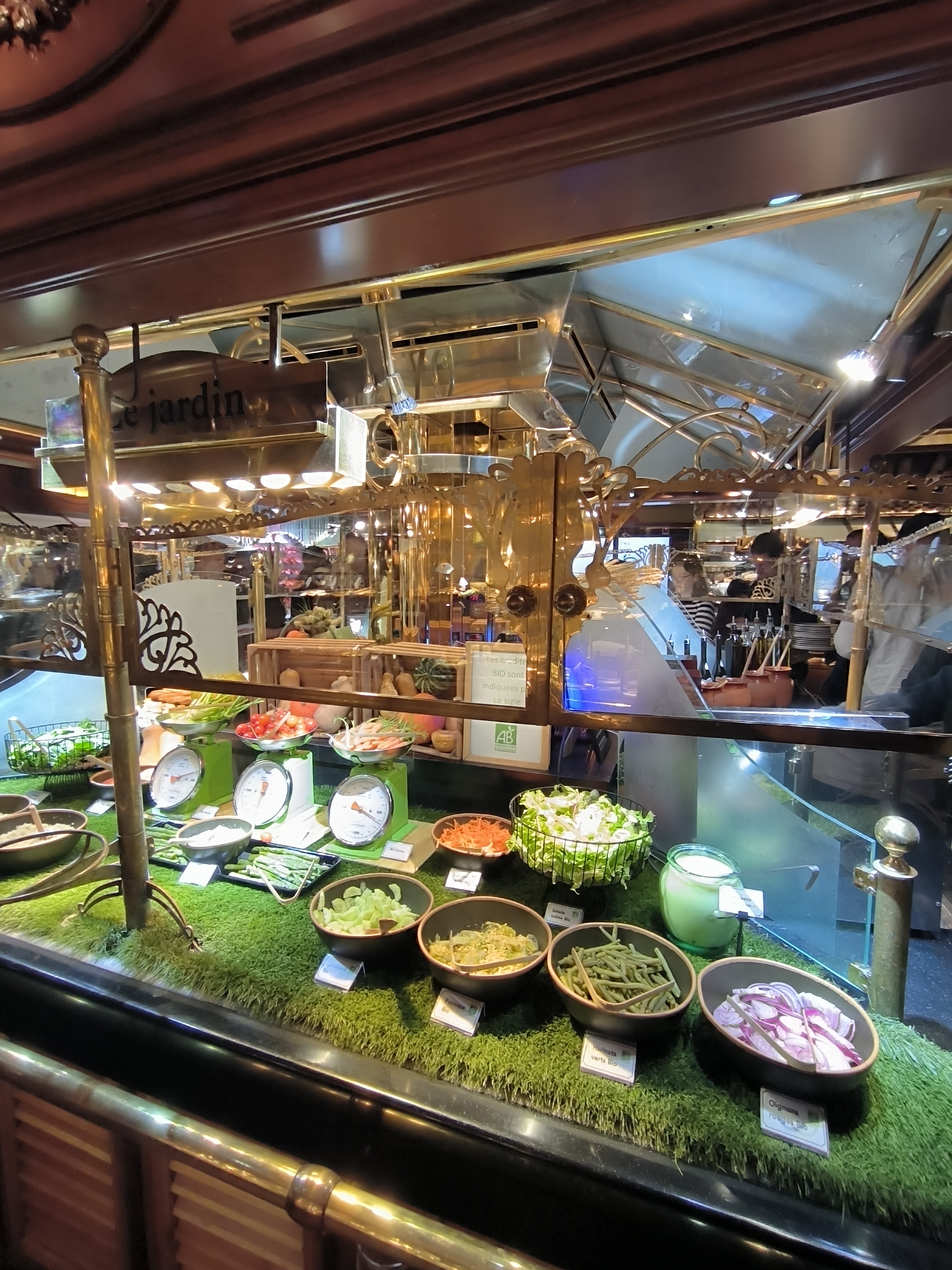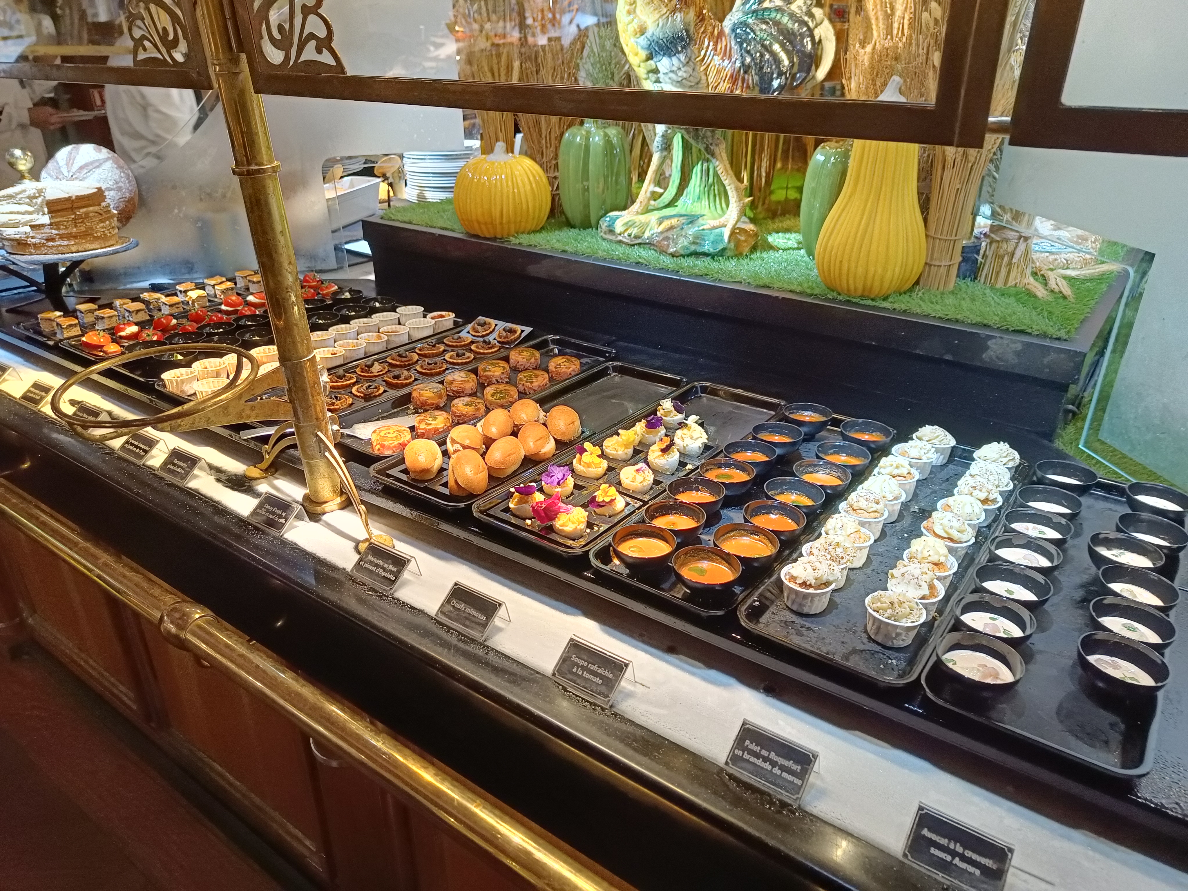 Ce buffet est une expérience unique, qui n'a rien à voir avec les habituels buffets à volonté. C'est le meilleur buffet que j'ai pu tester jusqu'à présent. Les décors sont magnifiques, et on se sent immédiatement immergés dans une ambiance distinguée et de raffinement (pensez d'ailleurs à venir habillés de manière correcte). Le personnel est à l'écoute, on a un(e) serveur(se) attribué à notre table qui nous présente les différents espaces et nous installe. Au niveau des plats, ils sont axés sur la cuisine française, avec énormément de choix, dont certains mets de luxe (foies gras, homards...). En plus des entrées, plats et desserts en libre service, certains plats sont préparées à la demande par des chefs (à volonté également). Il y a également différents stands tenus par le personnel (viandes découpées sur le moment, crêpes suzettes ou encore un glacier). Gros point positif par rapport aux buffets habituels : la qualité des aliments est au rendez vous. Pensez à réserver longtemps à l'avance et prévoyez environ 2h sur place pour avoir le temps de goûter un maximum de choses. (Il y a souvent du monde et il faut parfois faire la queue avant de pouvoir se servir).