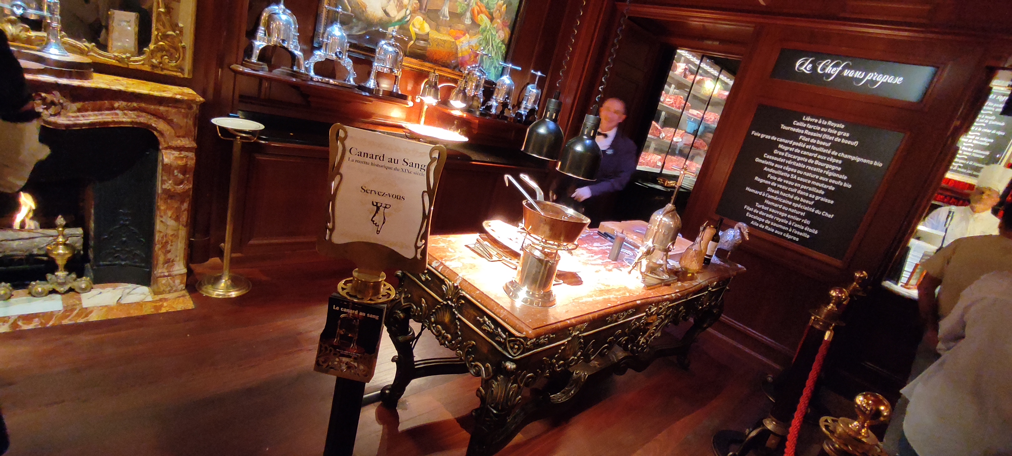 Endroit unique!! Il faut le faire au moins une fois dans sa vie. La multitude de buffets, que ce soit charcuterie, crustacés, foie gras, l'immense choix de fromage, les plats fait à la minute, le canard de sang et les petites cérémonies... Les salles aux décors différents sont assez originales aussi. Le personnel est fort sympathique. Seul bémol, malgré que les clients soient répartis sur plusieurs salles, c'est assez bruyant.