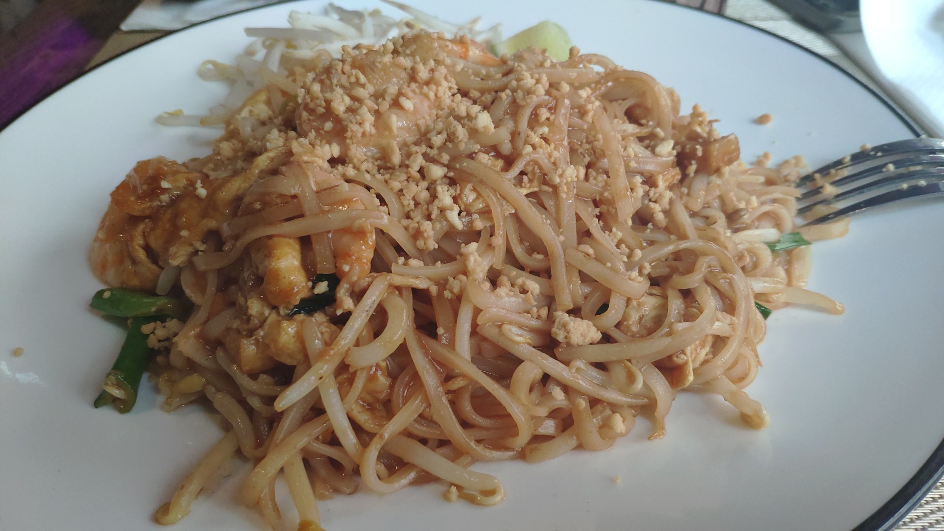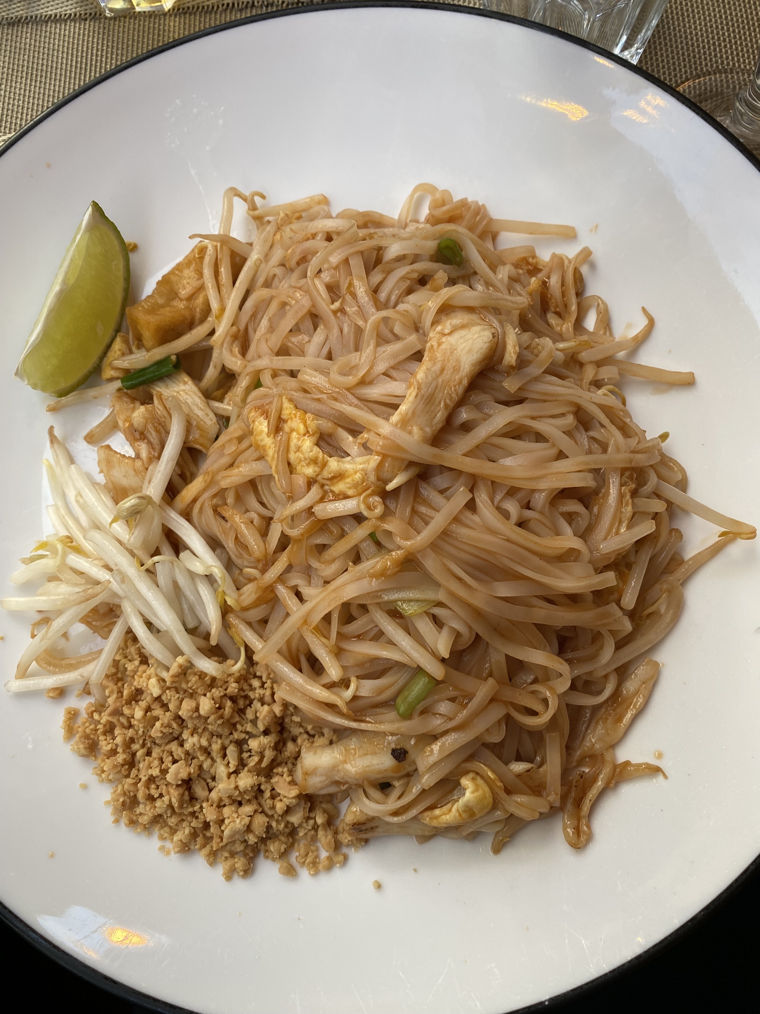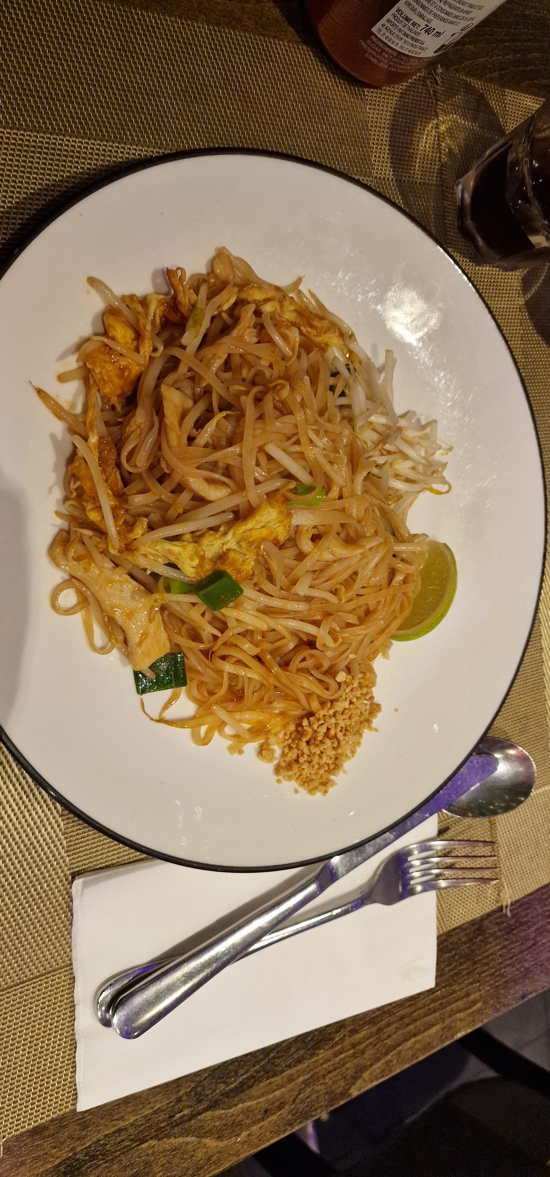 Nous avons mangé des raviolis aux crevettes, du pad thai et des litchis/glaces, tout était plutôt bon, mais pas génial et pas comme en Thaïlande 😂 Le service n'était pas bon, la serveuse vous faisait sentir comme si vous ne vouliez pas être là et toutes les tables autour de nous recevaient de l'eau gratuite, sauf nous. Comme nous savions que l'eau était gratuite, nous ne voulions rien commander à boire, mais la serveuse a insisté et n'a pas lâché et n'arrêtait pas de dire boire, boire.