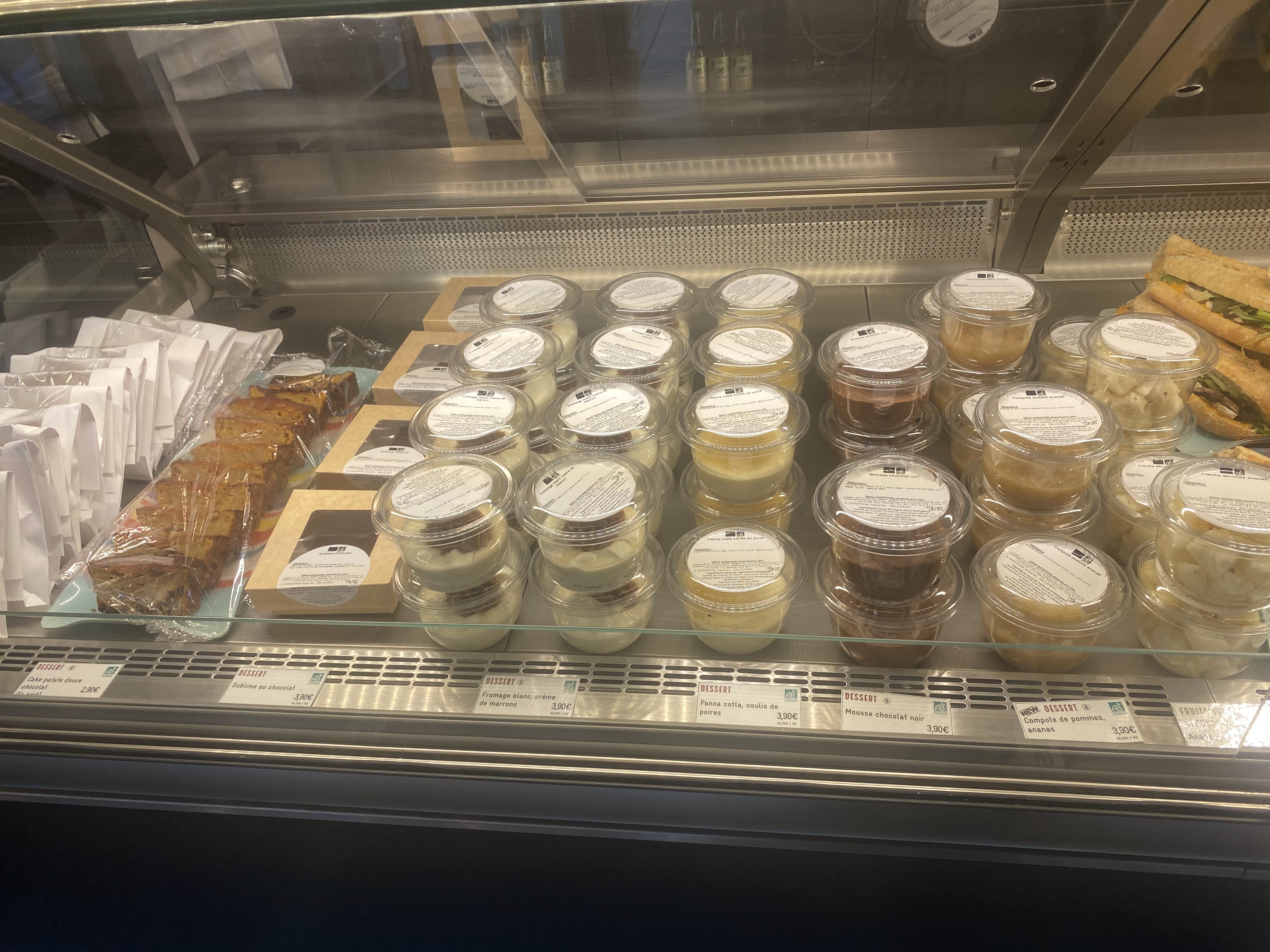 1,40€ le pain au chocolat décongelé. Des voleurs, fuyez ! 3,90€ la verrine de fromage blanc avec des tranches de pommes dessus. Foutage de gueule.