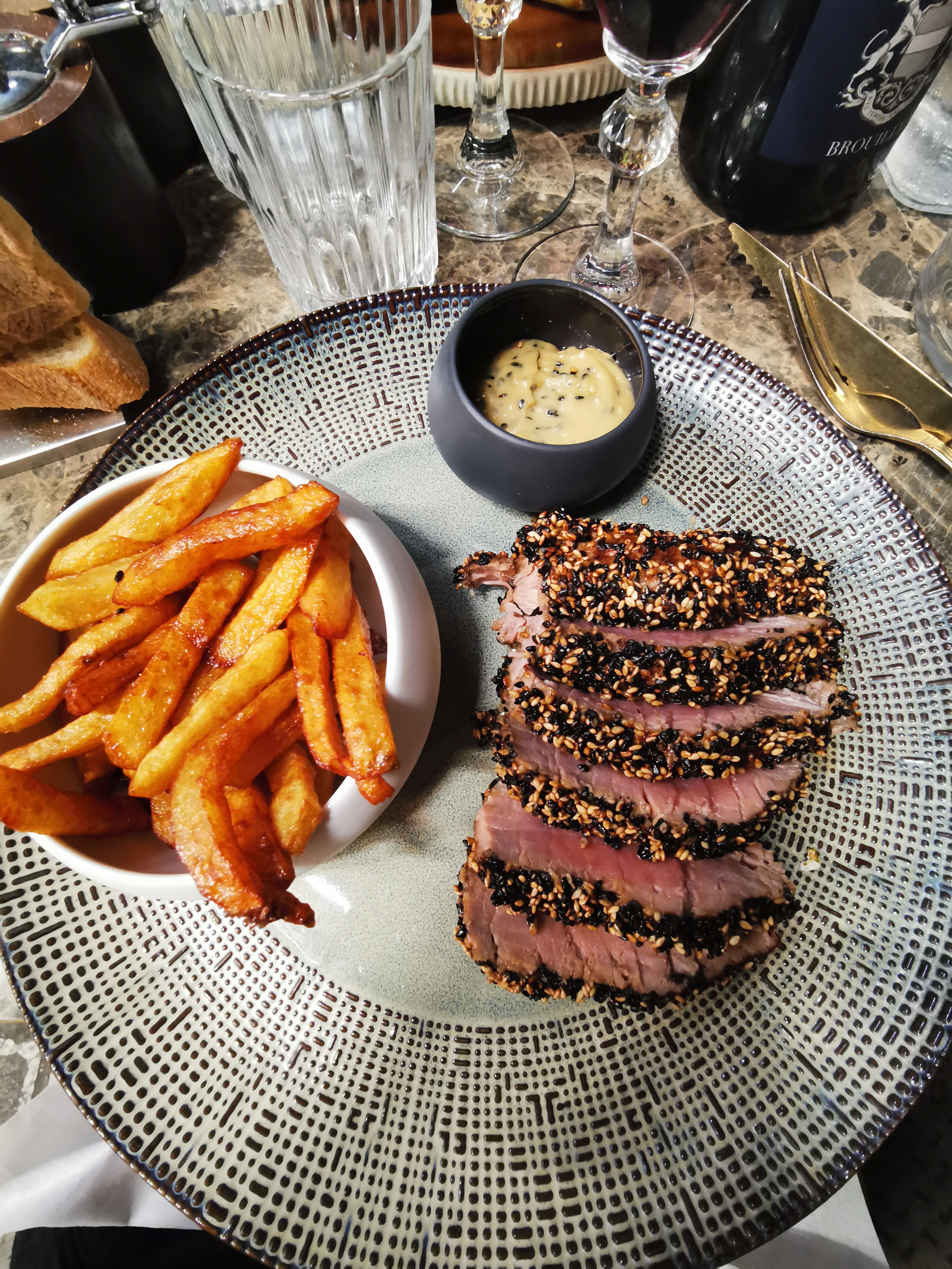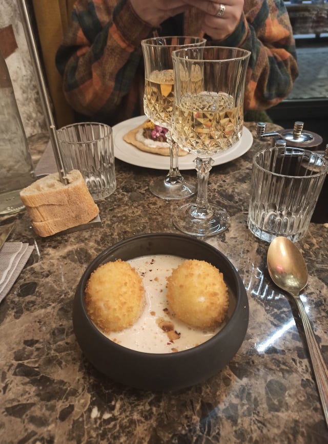 Beaux et bons plats. Service agréable. Nous avons réservé pour le premier service soir et avons pu nous installer en extérieur. Rue très passante donc éviter de réserver avec l’idée d’un dinner intime. Lieu vivant agréable avec de bons vins. Je recommande