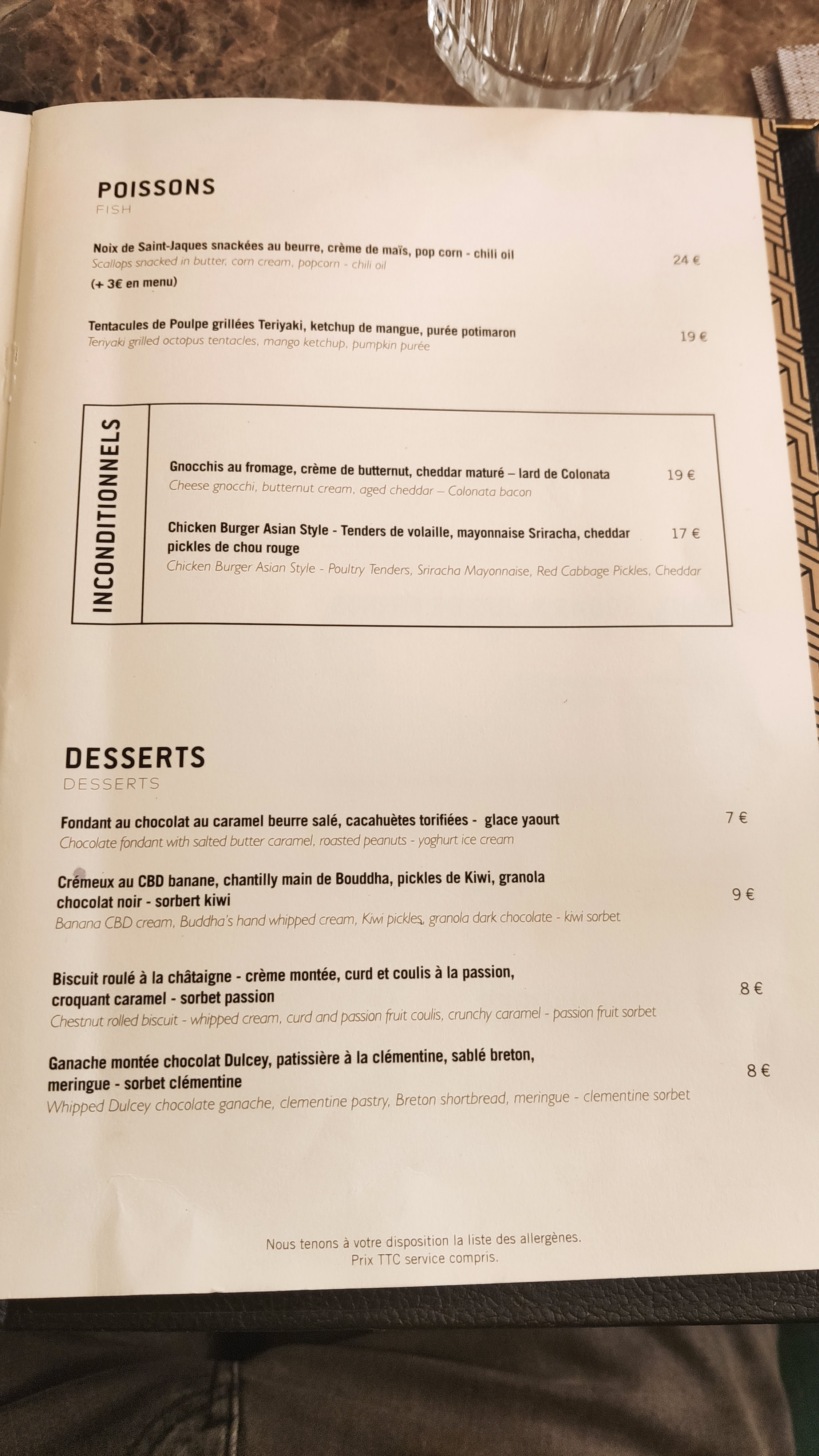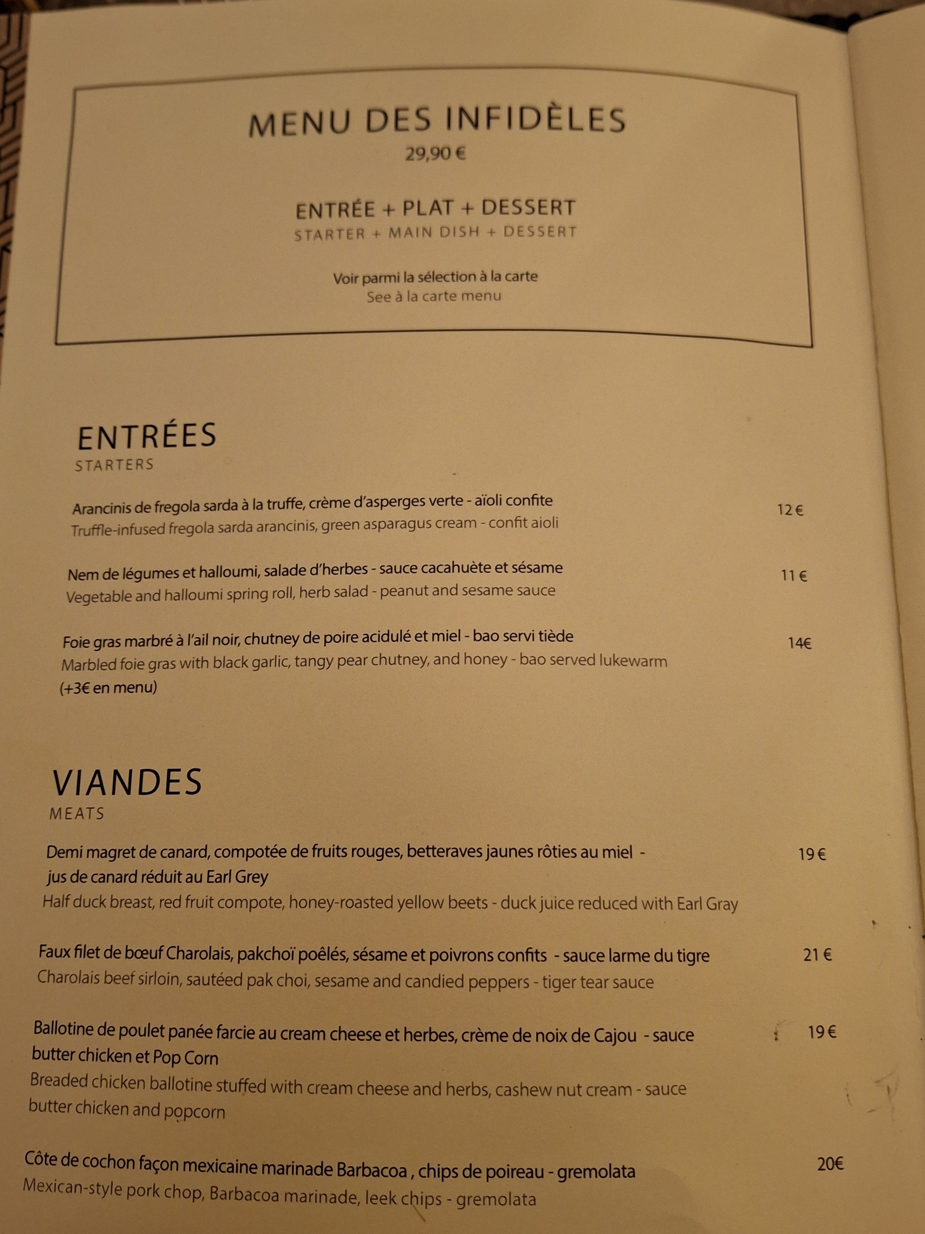 Un menu à 29,90 entrée plat dessert avec du choix, un excellent rapport qualité prix !! J'ai opté pour le poireau, le bœuf larmes du tigre, le crèmeau au CBD bananes 😂. J'ai tout aimé, j'ai trouvé les proportions généreuses par rapport au tarif, mais surtout j'ai adoré le dessert, une tuerie !!! Alors ne passez pas votre chemin et poussez la porte Les Infidèles le restaurant qui va vous fideliser 😊