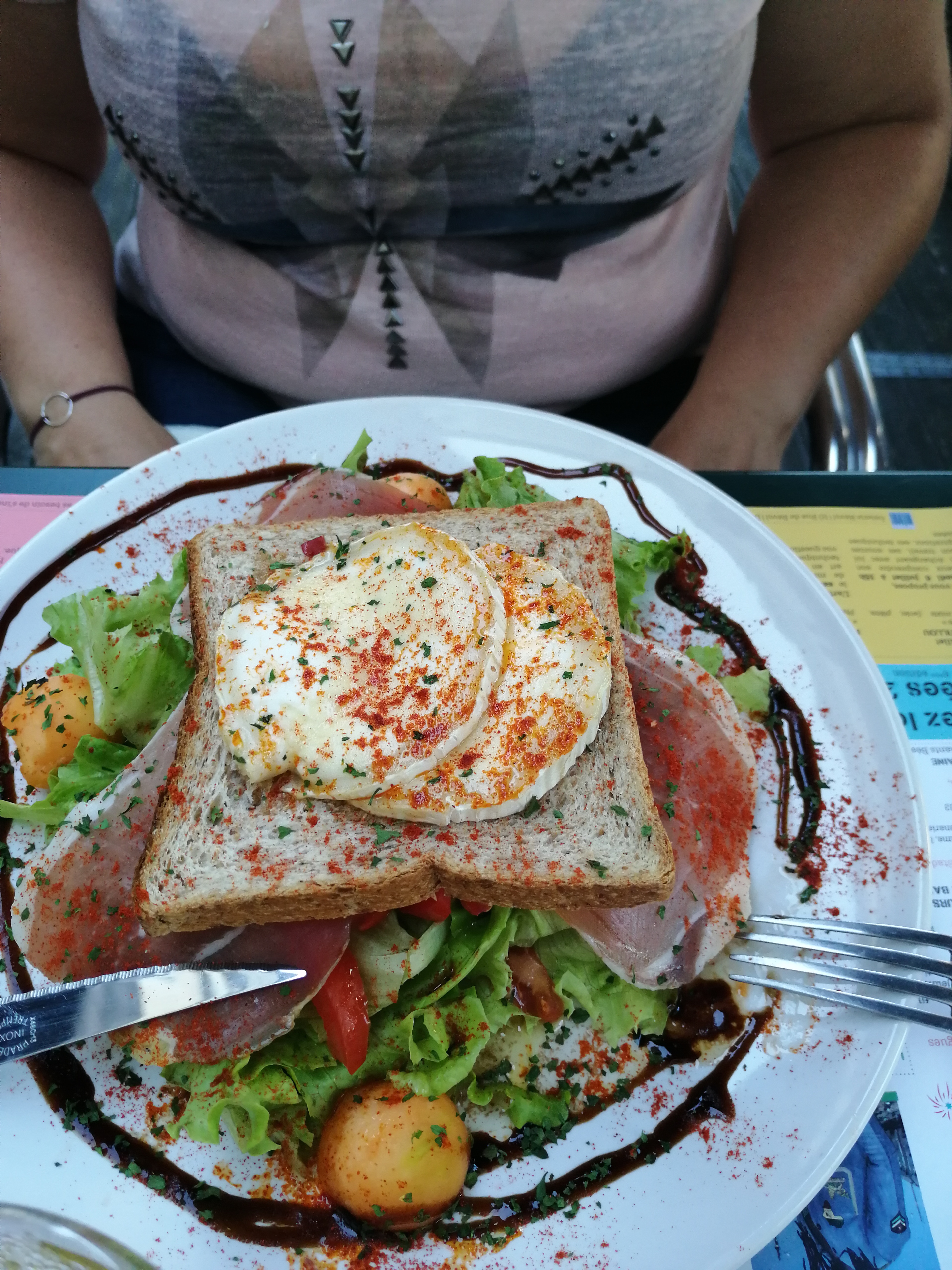Nous avons commandé au menu la salade aux ris de veau, le magret de canard aux légumes et sauce au poivre, et le plateau de fromages en dessert. Tout était délicieux et le serveur était très sympathique.