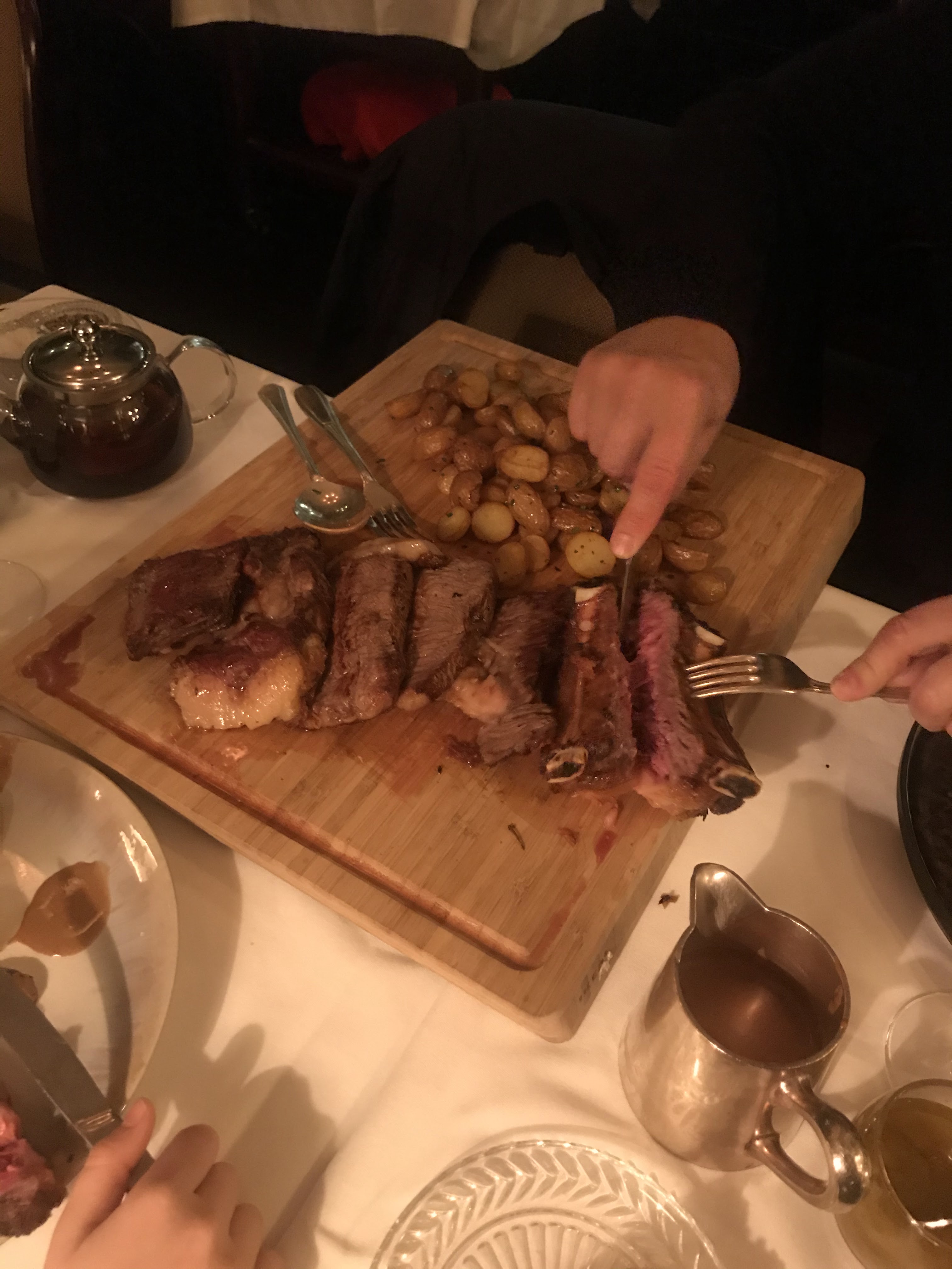 J'ai partagé un délicieux repas avec mon mari pour son anniversaire. Filet de bœuf, pommes de terre et épinards servis/tranchés à table (118 euros le filet). C'était un repas incroyable avec un service incroyable !