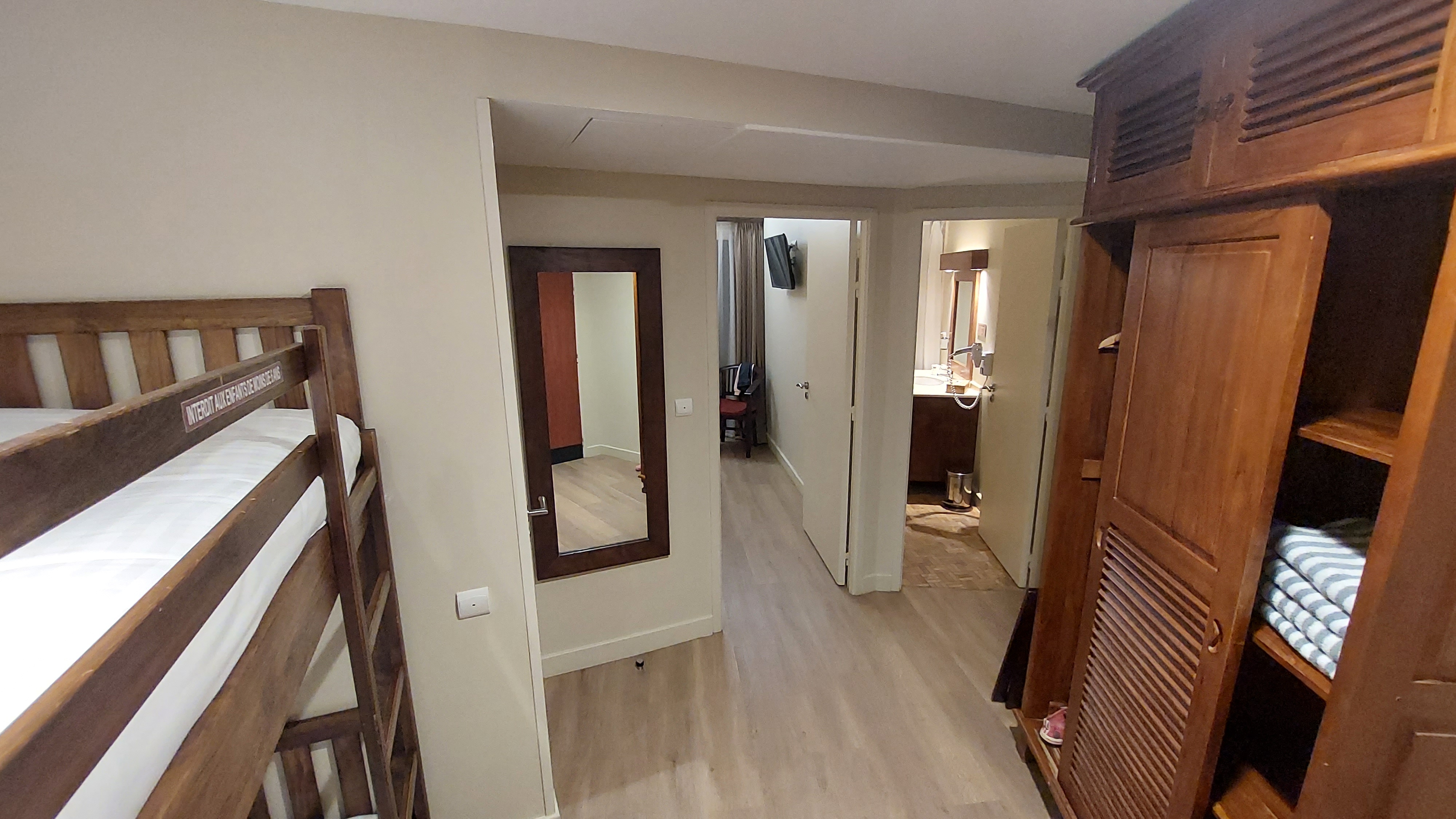 Chambre un peu petite pour une famille de 4personnes, mais pour une nuit cela est parfaitement convenable. Les enfants dorment dans des lits superposés juste à cote de l'entrée. Néanmoins le lit parental est immense ( 2x90cm) et confortable.au RdC, nous avions une grande terrasse. Le personnel de l'hôtel est aimable, serviable et souriant. L'hôtel est idéalement placé à quelques minutes à pied du parc ( juste trouvé l'astuce de couper en diagonale dans le parking) . La piscine est très agréable avec des nombreux bains de soleil, des draps de bain sont fournis dans la chambre. Petit déjeuner généreux avec bcp de choix