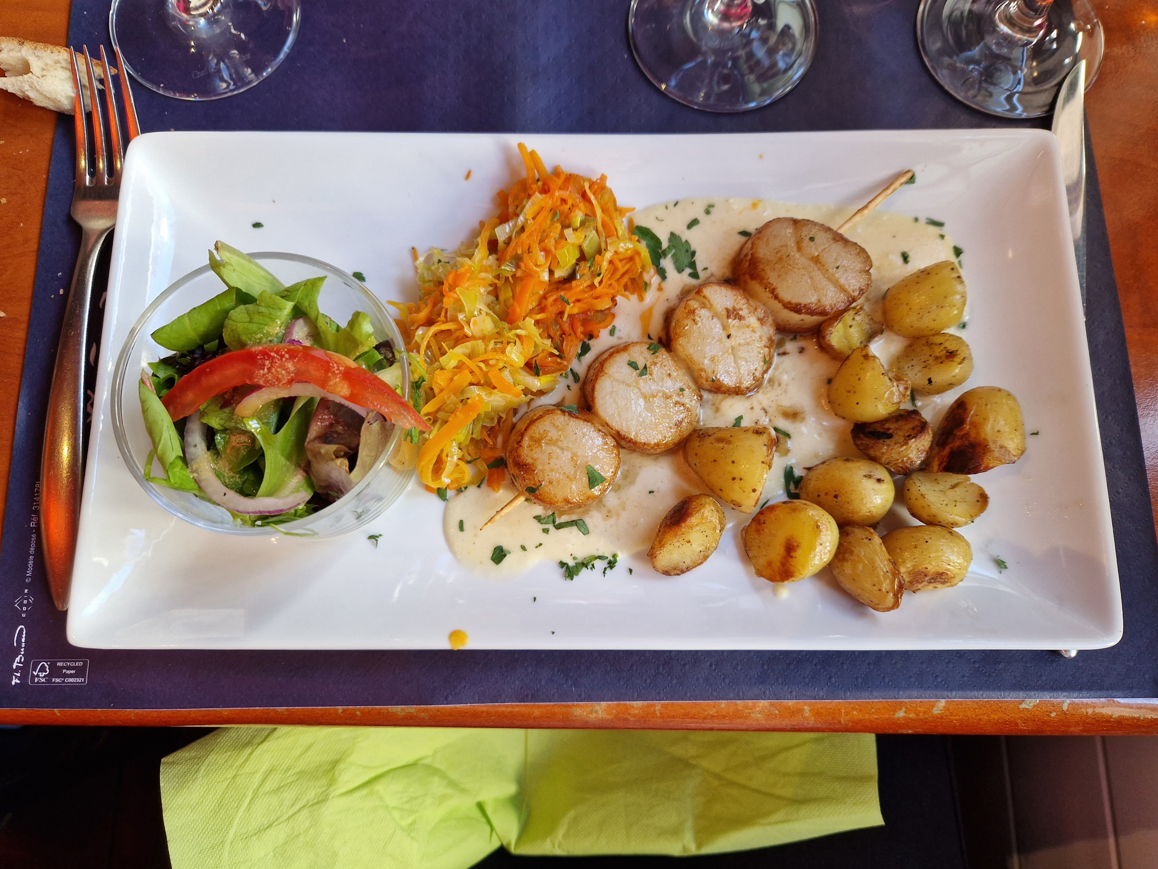 Surprise de la soirée. On y entre par une petite porte dérobée. Et la c’est génial. Le patron met l’ambiance. S´inquiète de notre bien être. La cuisine est maison. 🧑🍳 Je n avait pas réservé, il était 21h30, le restaurant était plein. Le temps de redresser et le tour était joué, dans la bonne humeur. Les st jacques sont divines. Je vous recommande cette pépite.