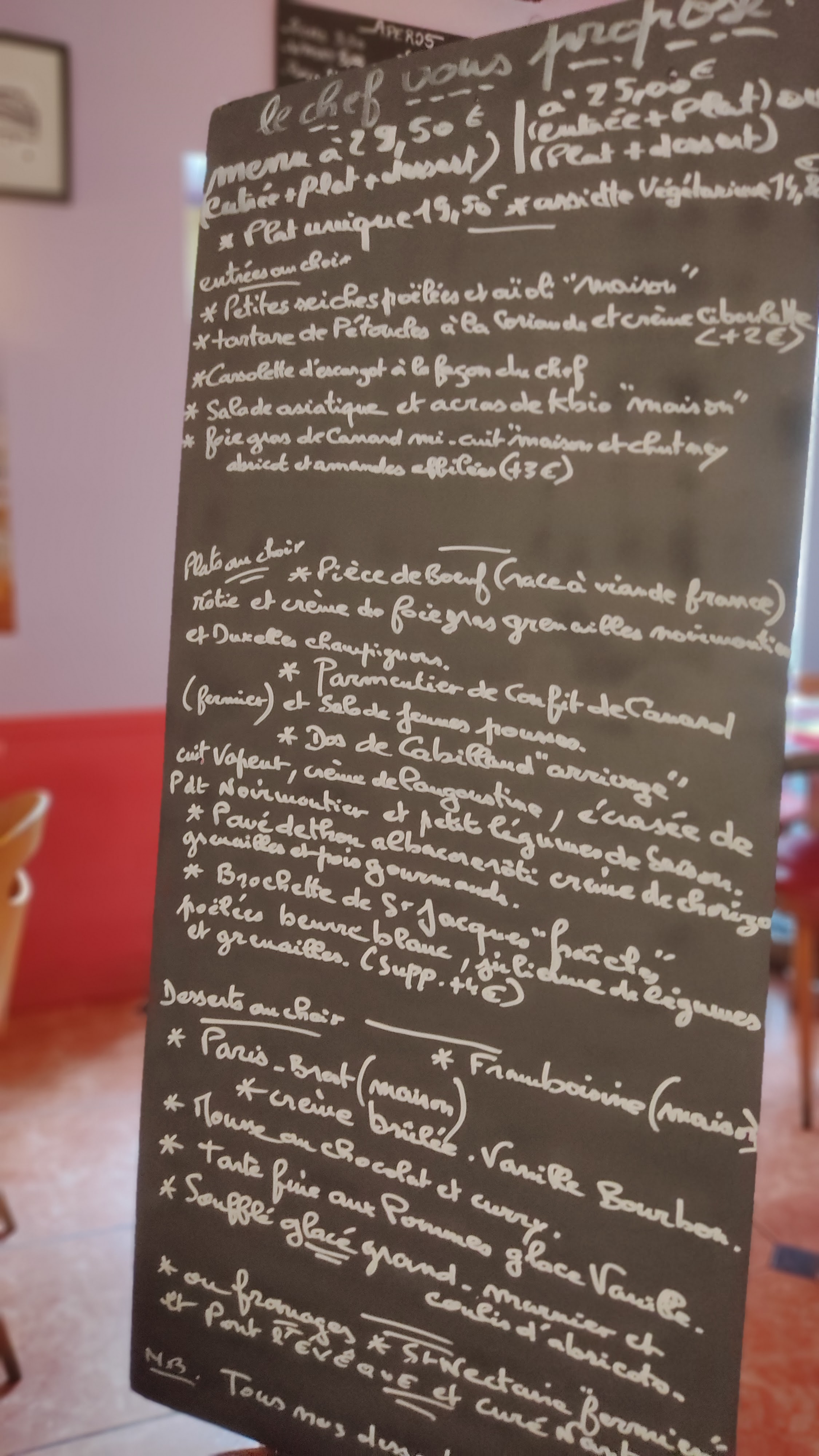 Carte uniquement à l'ardoise où on a du mal à se décider tellement tout à l'air bon, patron sympathique, un peu burlesque et fana de vins. Nous avons très bien mangé à 2 pas du port et on a qu'une envie, c'est d'y retourner.