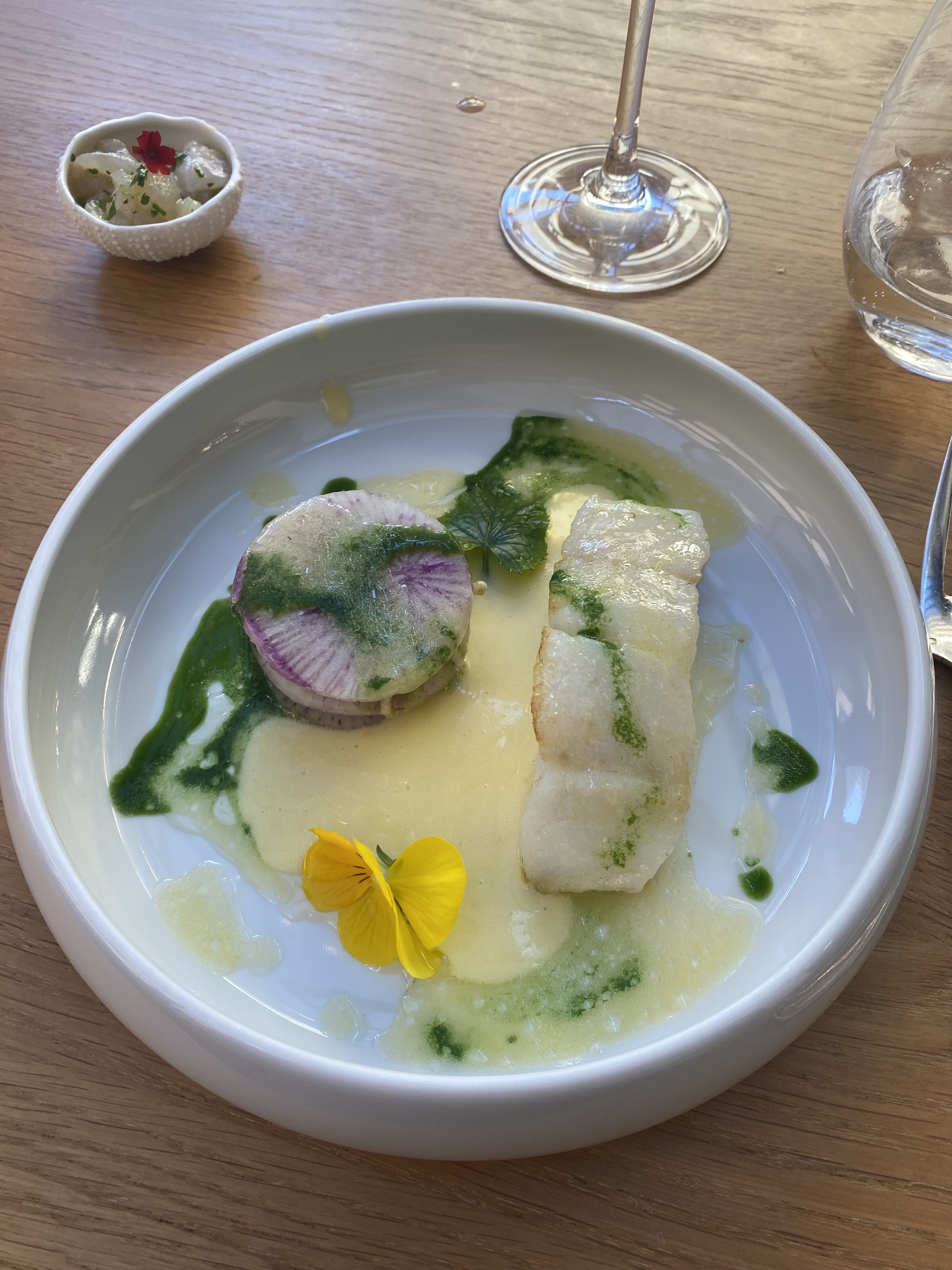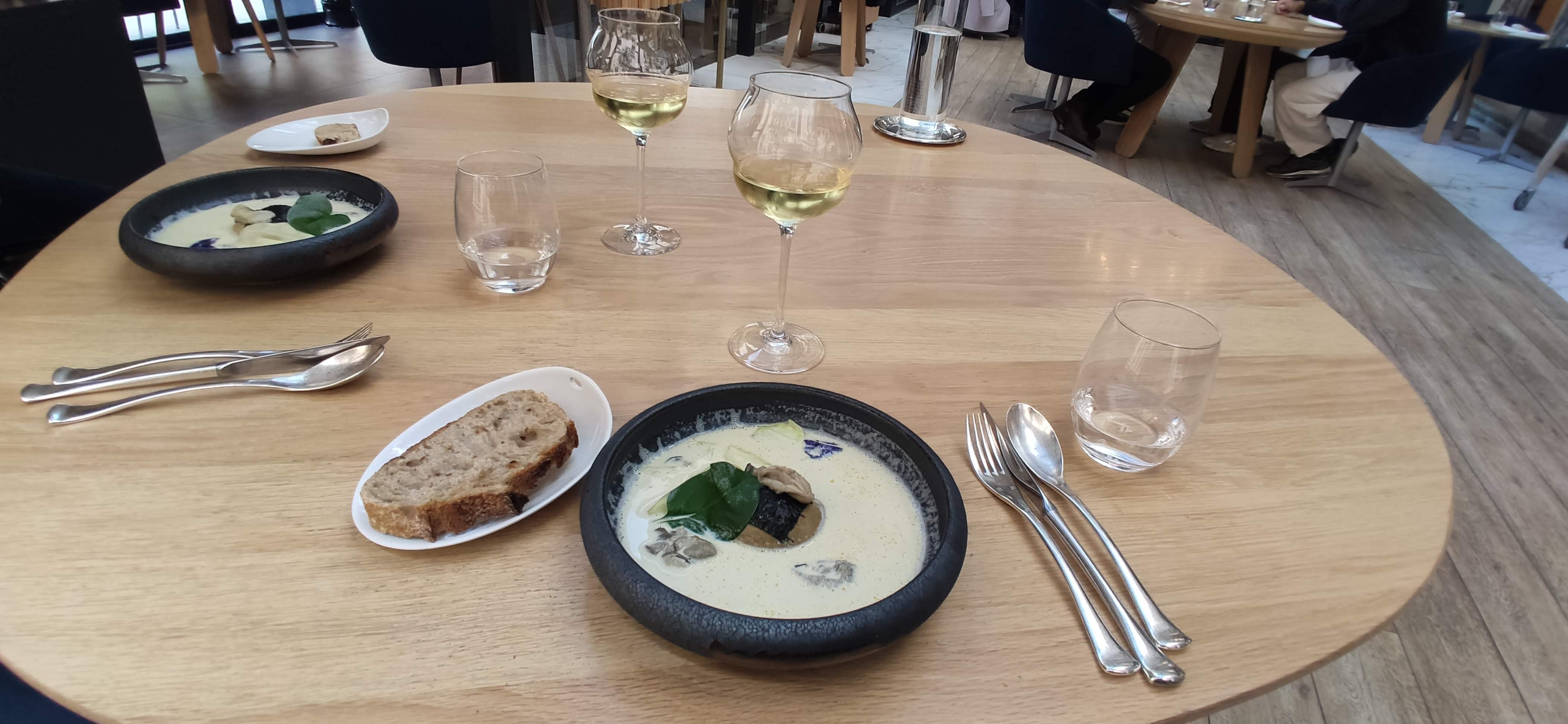Nous avons eu un bon dîner ici, mais rien d'exceptionnel. Nous avons parcouru le menu à 4 plats et nous n'avons pas été déçus car la nourriture était bonne mais plutôt ennuyeuse. Il n'y avait rien d'exceptionnel dans tout ce que nous avons mangé. C'était bien cuit et on sentait que la technique était là, mais c'est tout. Le service était bon, mais pas à la hauteur pour un tel endroit, par exemple, difficile d'attirer l'attention du vendeur de vin et de prendre un verre. J'avais l'impression d'être dans un restaurant d'hôtel classique, assez fade au final, sans âme. L'endroit est certes agréable, mais l'expérience globale est trop chère à mon humble avis.