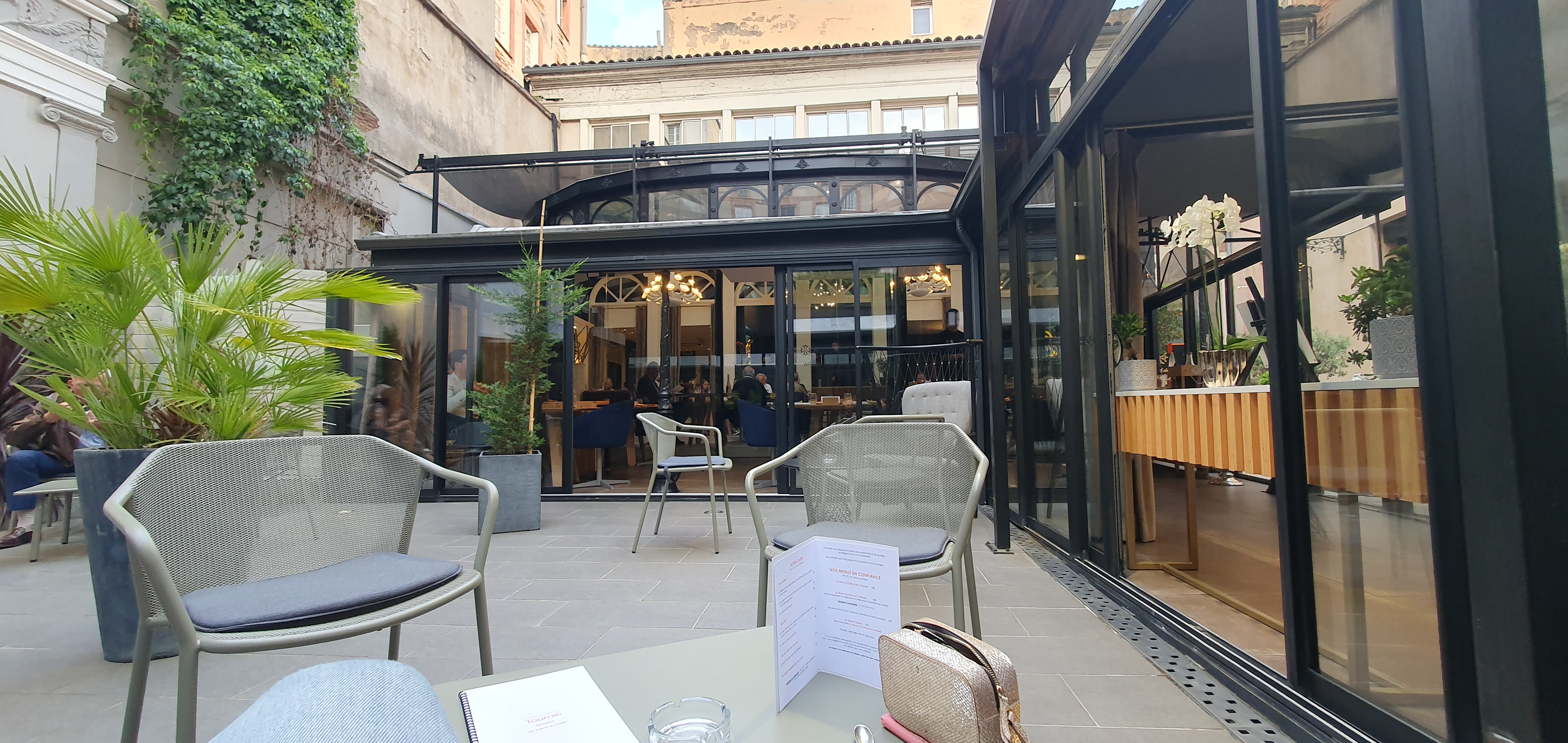 Très bonne expérience. Service fluide ambiance chaleureuse. Cadre agréable avec verrière doit être très agréable en été avec un beau soleil. Le restaurant est à côté de l'hôtel du même nom. Très joli de l'extérieur. Le dernier petit dessert permet de bien finir le repas. Les vins proposés par le sommelier s'accorde très bien avec les plats. On recommande !