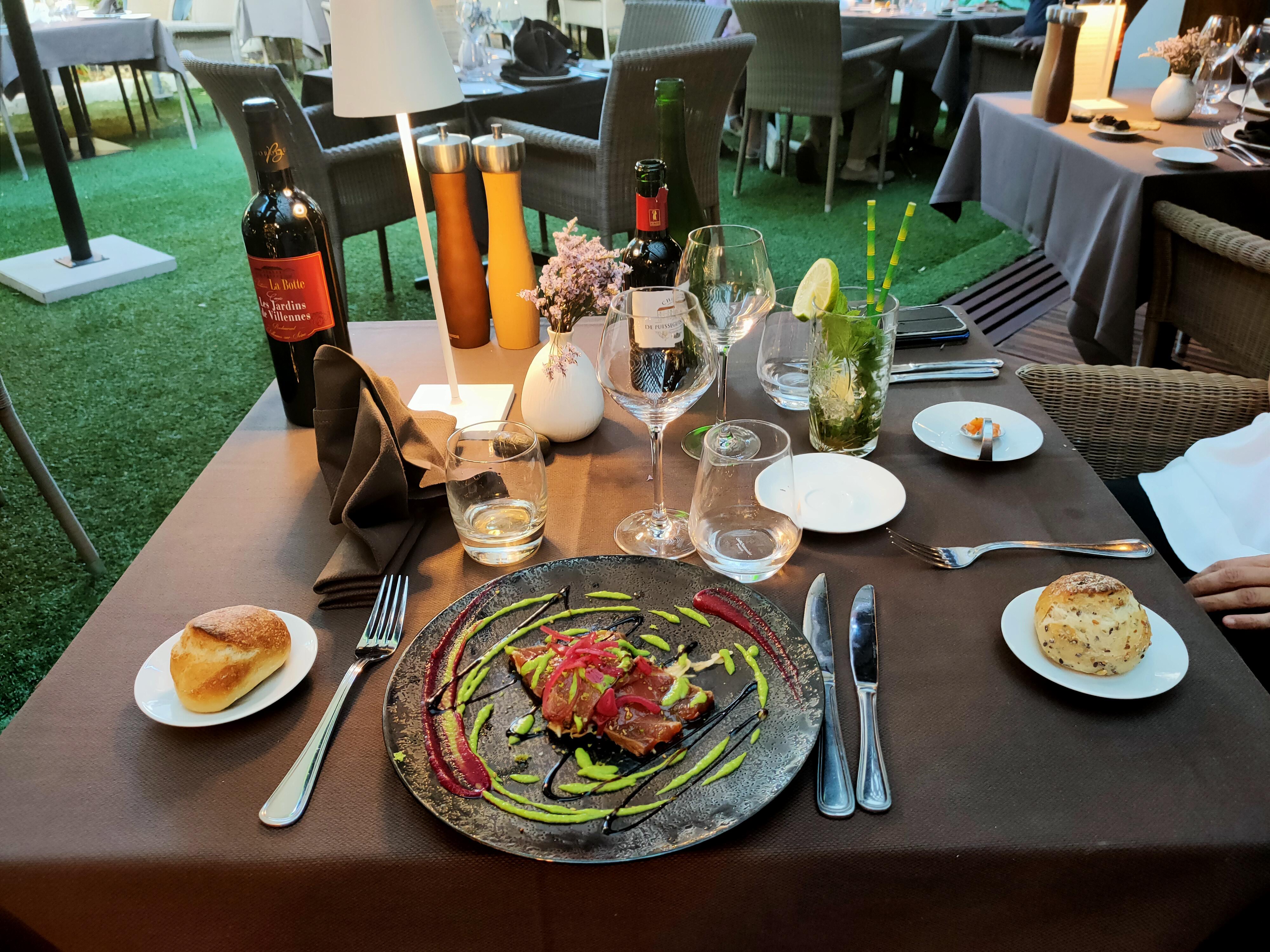 Comme d'habitude, vous le savez, ce commentaire repose sur mon expérience personnelle. Verdict sans appel : si vous souhaitez ravir vos papilles c'est le bon endroit, foncez ! Petite soirée improvisée aux Jardins de Villennes pour un dîner en amoureux. Ce restaurant propose la réservation en ligne avec un délai de réponse d'environ 2 heures. L'accès est simple et il est facile de se garer car un parking se situe juste à côté. Les Jardins de Villennes se situe dans le quartier de la gare de Villennes, on peut d'ailleurs entendre les trains passer mais le bruit est raisonnable. Situé en plein centre-ville l'accueil se fait le bar, un aquarium avec des homards amusera les grands comme les petits dès leur arrivée. Puis nous passons par un couloir et là nous sommes loin d'imaginer ce sympathique espace aménagé qui fait le renom de l'enseigne: petite arrière cour décorée façon jardin avec une fontaine et une décoration très sympa, une cave à vin est aussi visible depuis la cour. Côté repas j'ai choisi le menu du maraîcher, avec tartare de thon puis pavé de veau suivi d'un Paris Brest maison pour le dessert. Madame s'est essayée au brochettes de noix de Saint-Jacques accompagnées de délicieux légumes. Le personnel était agréable et prévenant malgré quelques petites remarques qui ne méritent pas d'être citées. Endroit idéal pour un petit tête à tête intimiste.