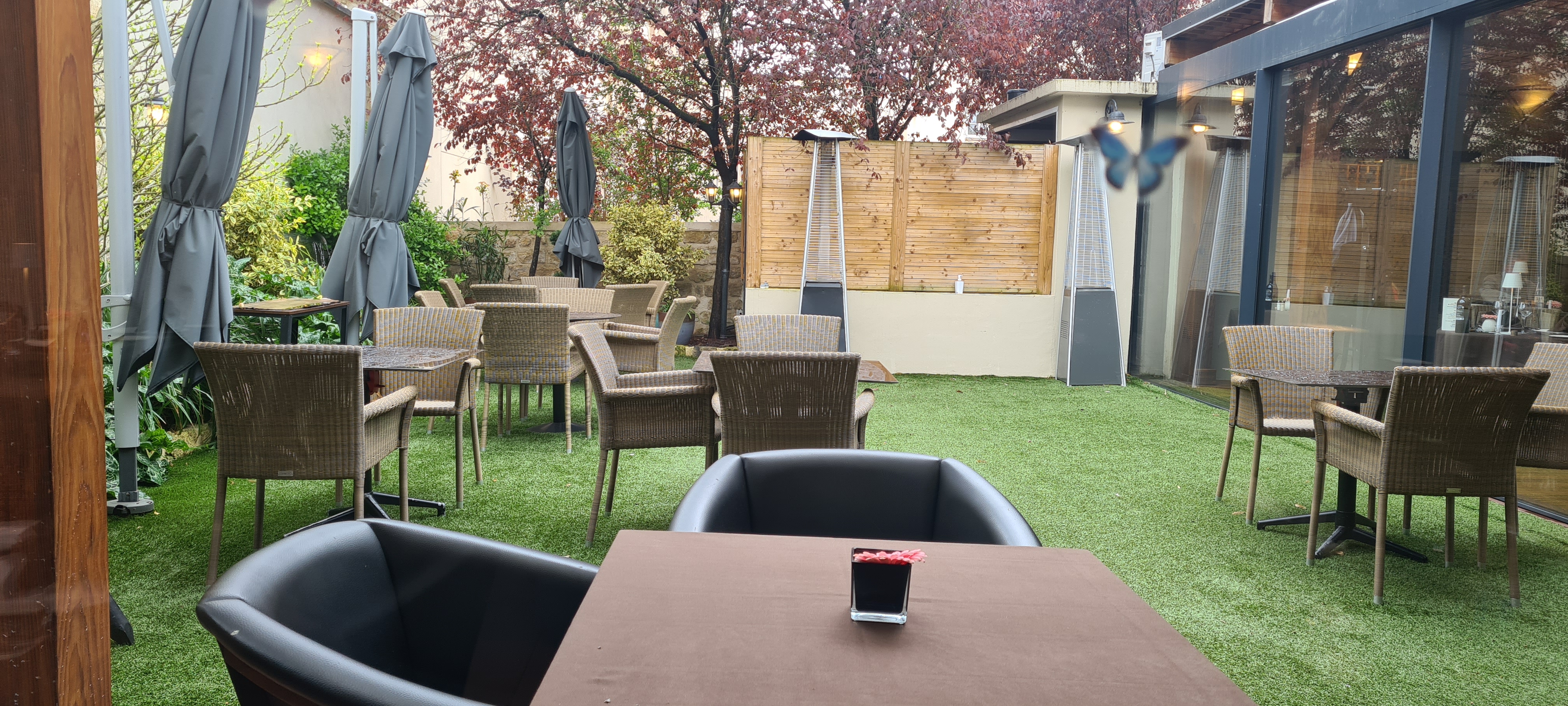 Les plats sont absolument délicieux mais le diner romantique a malheureusement été gâché par un cadre qui n'est pas à la hauteur et surtout un service à la limite de l'amateurisme. Dans le détail, que ce soit pour l'entré ou le plat principal, la première impression est visuelle : une assiette travaillée, agréable à regarder sans nécessairement être exceptionnelle. Au niveau du goût il n'y a rien à redire, les légumes en accompagnement auraient même presque tendance à éclipser l'ingrédient principal. Le dessert est lui aussi exquis. Dans l'ensemble je trouve qu'il y a un bon équilibre entre les différentes saveurs, la quantité est raisonnable et les sauces sont ajoutées de manière raisonnable. Au niveau du cadre, on commence par être enchanté de ce petit jardin clos, à l'aspect romantique, mais quelques détails m'ont déçu. La terrasse couverte est impeccable, la partie centrale est un petit jardin légèrement arborée qui donne un ressentis très agréable. Bien que je comprenne les inconvénients que pourrait avoir du vrai gazon, le choix du gazon synthétique fait bas de gamme. Les bouteille de gaz négligemment recouvertes d'une bâche ainsi que les divers outils de jardinage et autres matériels ça et là le long des murets donnent une impression bâclée à la décoration. La petite fontaine peut être un plus charmant pour les tables les plus éloignées, mais gêne énormément au niveau sonore pour les tables à proximité. Mes plus grandes critiques vont au service : dès l'accueil le sourire y est forcé (peut-être une soirée difficile ?). La personne à l'accueil qui nous a placé nous à distancé de plusieurs mètres dès les trois premiers pas. Je n'ai pas habitude de critiquer les tenues vestimentaires, mais dans l'ensemble nous étions dans plus dans le style bistro parisien que restaurant romantique. Le serveur est revenu à deux reprises à notre table suite à des oublis sur notre commande, ce qui aura au moins eu le mérite de nous faire rire. Nous avons reçu l'addition de la table voisine pendant le dessert, avons reçus 2 café pour un seul commandé et 3 sur la facture... En dernier point, et sans remettre en cause le besoin pour les serveurs de faire une pause, je pense qu'il est possible de se mettre ailleurs qu'à côté de l'entrée pour fumer sa clope ! En synthèse, je suis un peu agacé par le service et je ne peux qu'espérer être passé un mauvais jour. Je garde cependant un avis positif sur la qualité des plats qui valent la peine de découvrir ce restaurant.