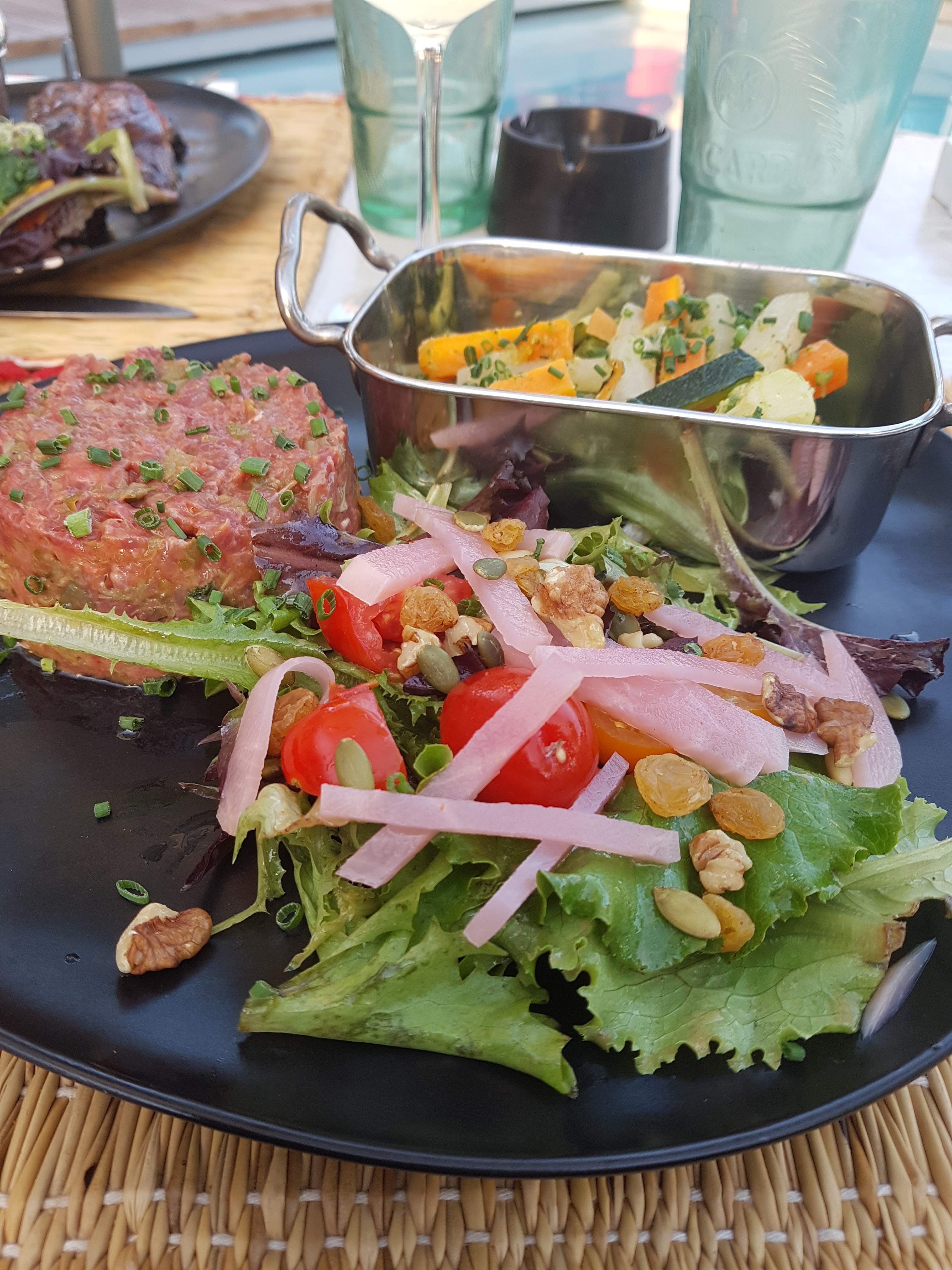 Très belle terrasse près de la piscine. Serveuse très agréable. Mais pour les végétariens, pas grand chose. Prix élevés. Bon, on paye le cadre mais il faut reconnaître que la salade n'était pas mauvaise. Pas de quoi sauter au plafond mais bonne. Carte des vins assez pauvre.