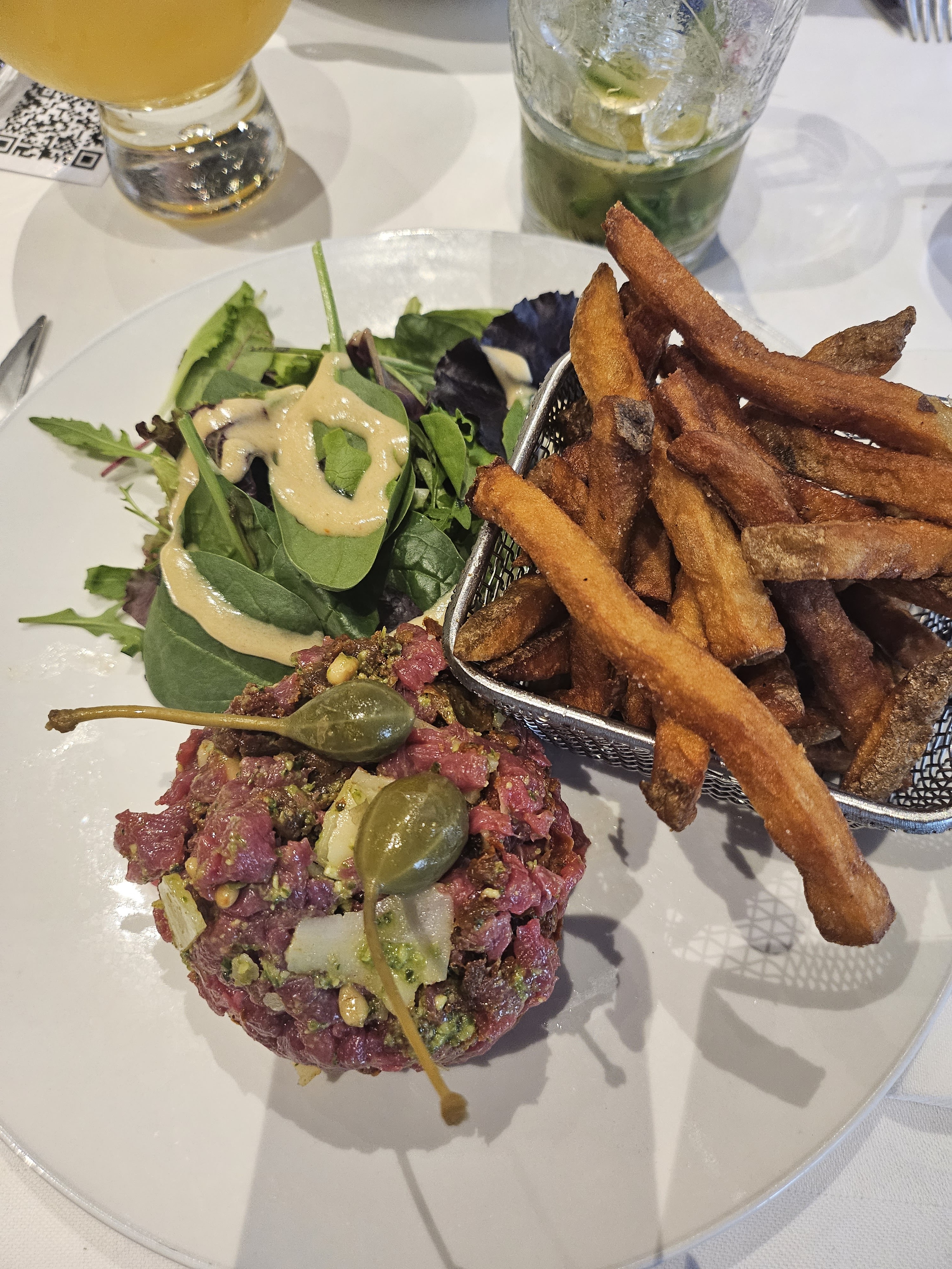 Le cadre est sympa mais le service n'est pas terrible, erreur sur la commande et sur la note, plus les serveurs qui se font des blagues au milieu des clients, pas très pro. Les plats n'ont aucune originalité, mon tartare de saumon était fade et simplement mélangé avec de l'aneth. Il est indiqué sur la carte qu'il et servit avec de la salade, j'ai eu frites (surgelées) salade, sans aucun intérêt, la salade m'aurait suffit.