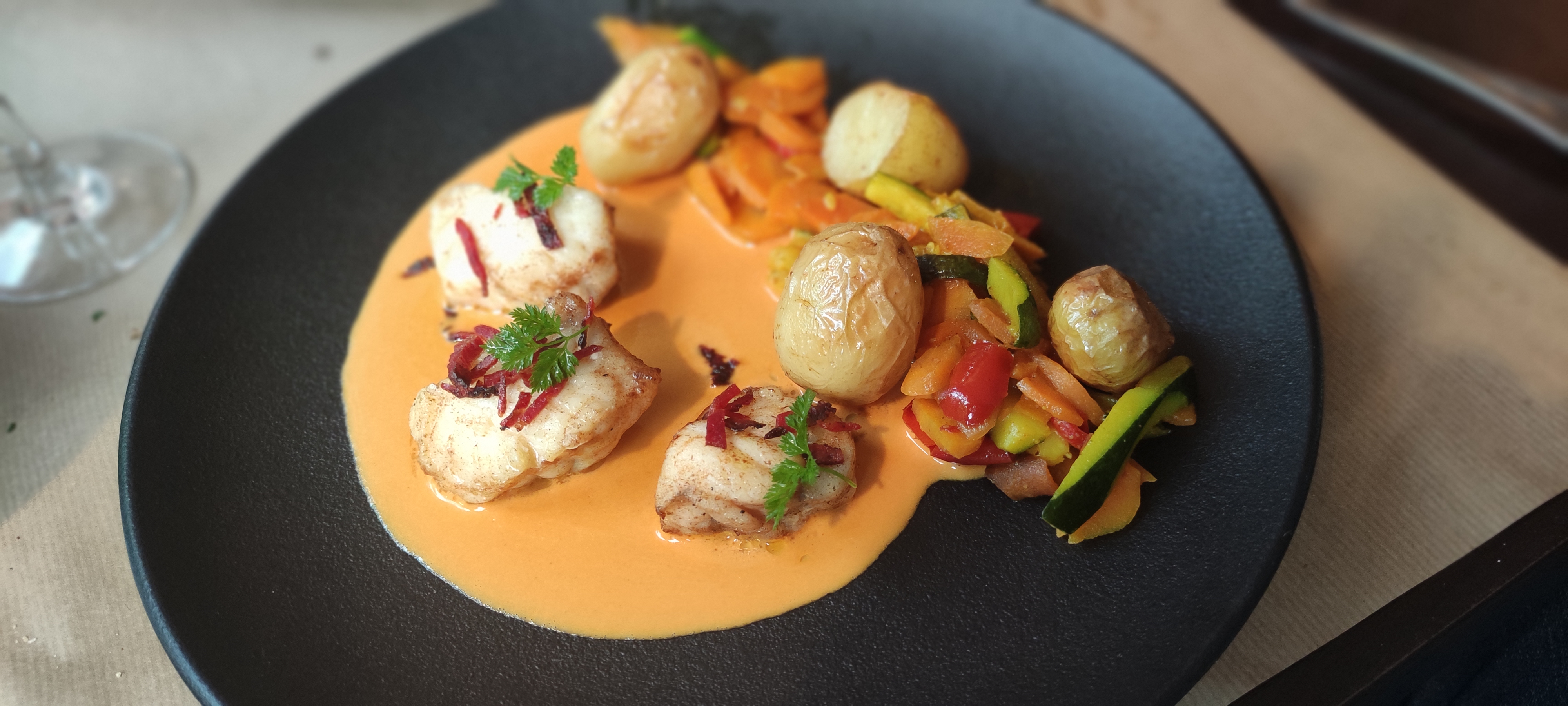 Très bonne cuisine pour ce petit restaurant qui ne paie pas de mine vu de l'extérieur. Très bon accueil, cuisine fine et savoureuse. Arrivés à 19h car restau annoncé complet au téléphone pour les services plus tardifs, nous avons pu profiter du restaurant vide pendant près d'1h et donc pu manger au calme ma femme et moi, ce qui était très appréciable. Le ketchup aux poivrons légèrement relevé pour les accras de gambas en entrée était vraiment bon et se mariait très bien avec ce met. J'ai regretté le manque de chorizo dans la lotte au chorizo. Trop discret à mon goût, il aurait mérité plus de présence sinon très bon plat lui aussi. En résumé, une bonne découverte, nous étions ravis de notre repas et une note peu élevée au final, 59€ pour 2.