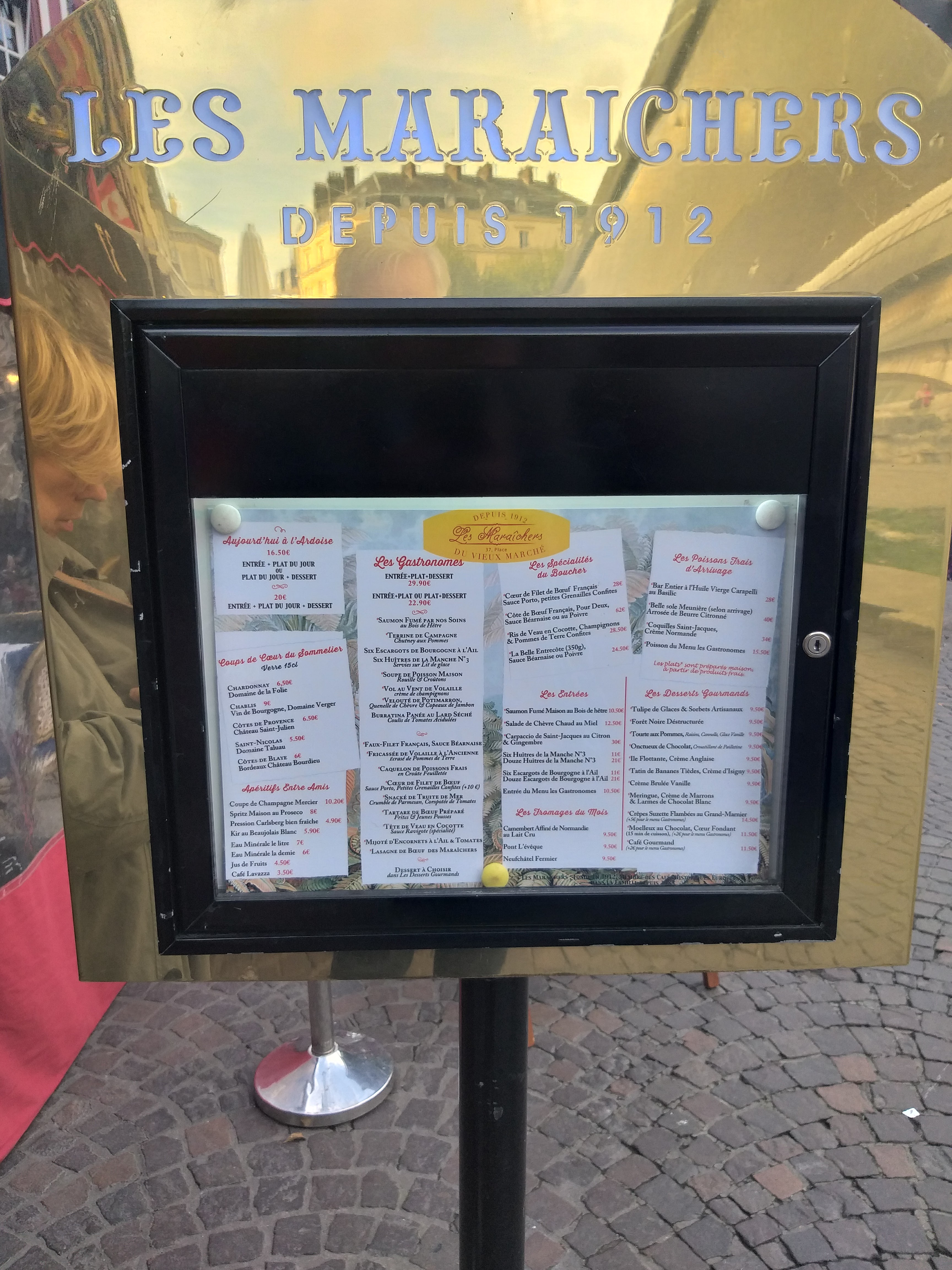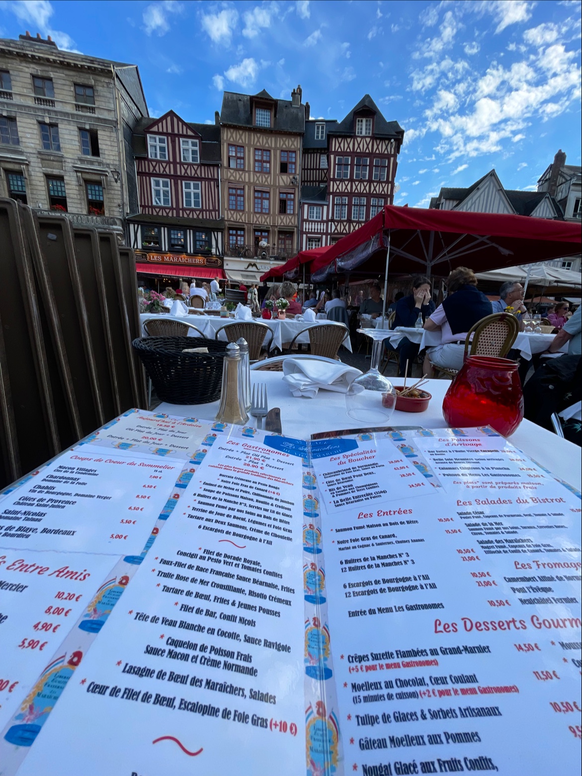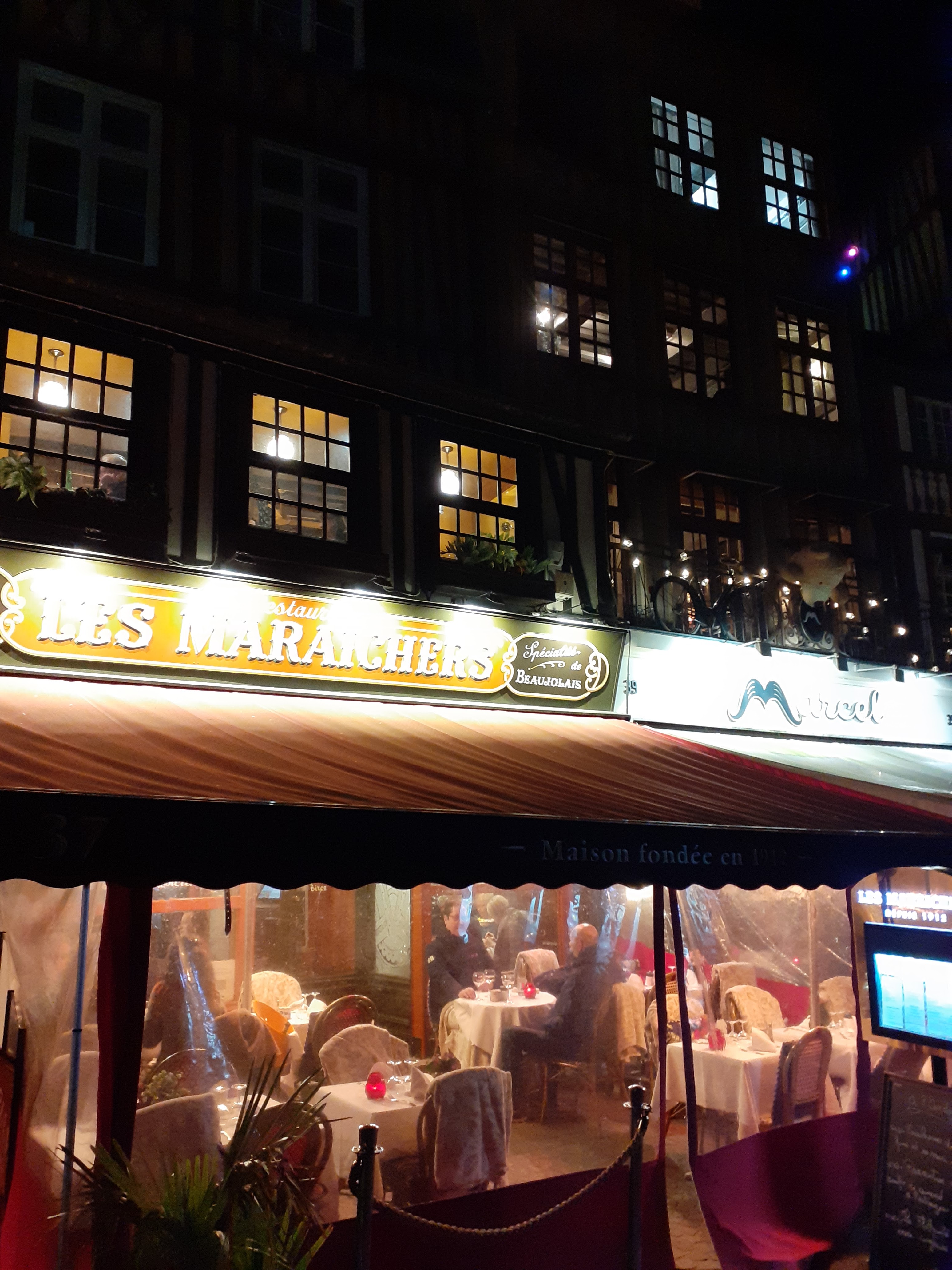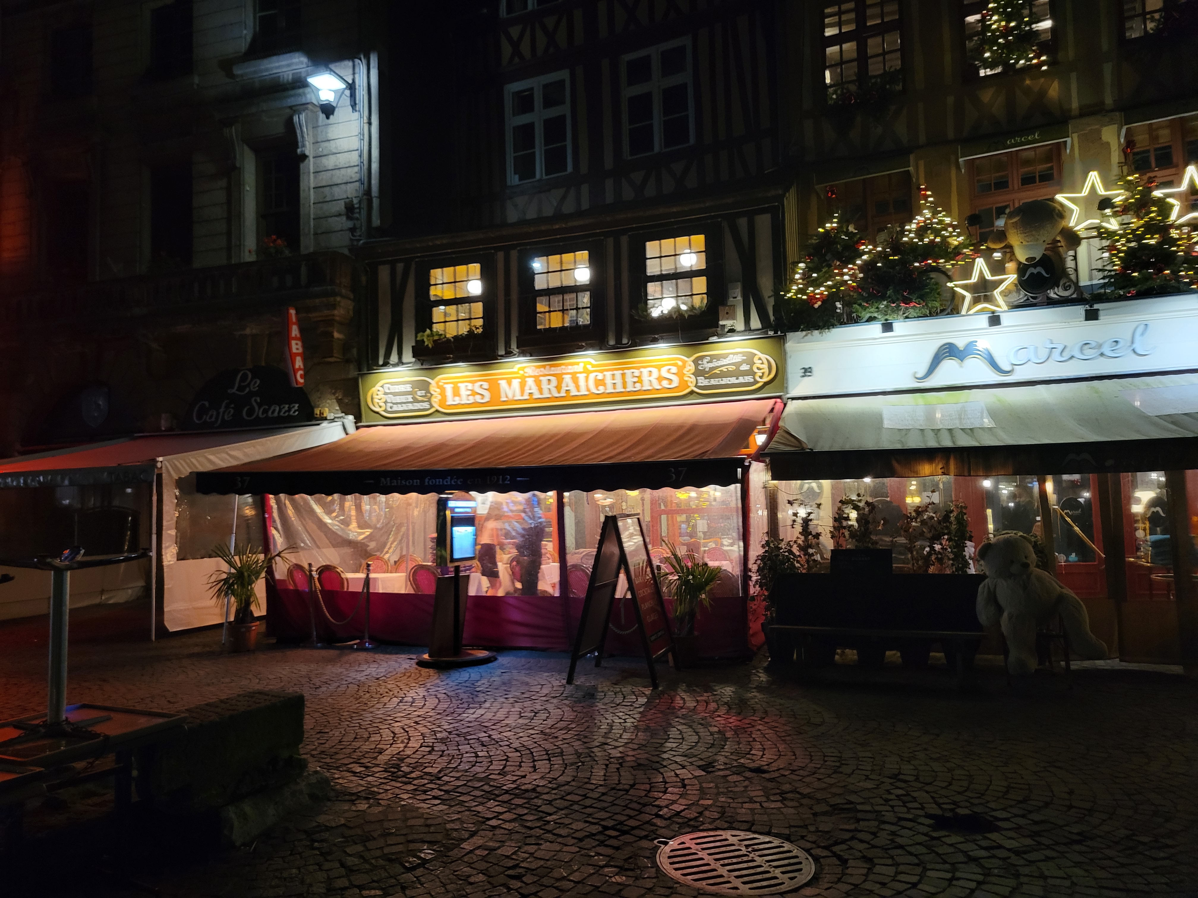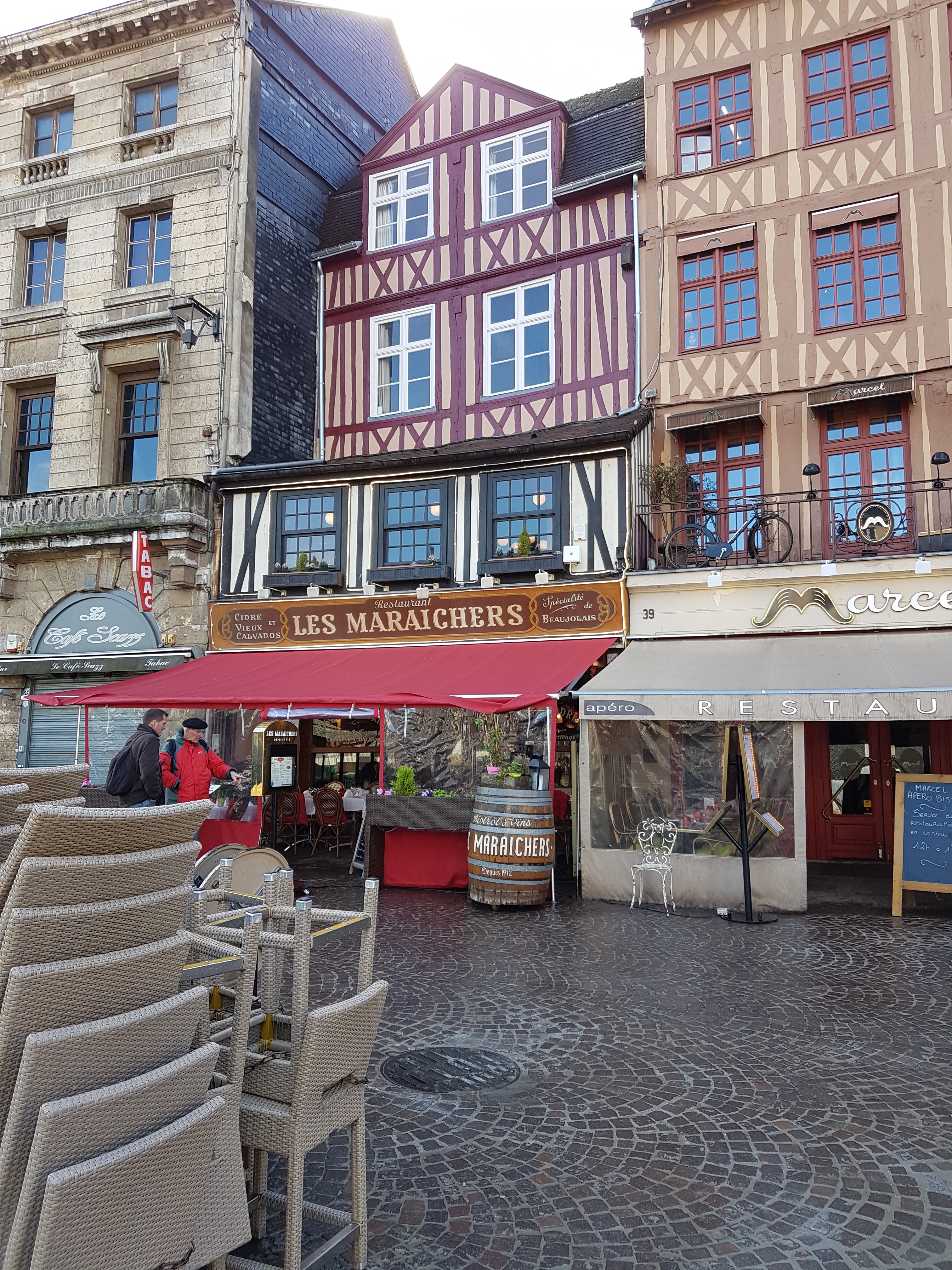 Les maraîchers est l'un des restaurants historiques de la Place du Vieux Marché à Rouen. Il fait partie du décor si j'ose dire. Mais j'avoue que c'était mieux avant ou avant le Covid peut-être? Ce n'était pas mauvais, loin de là, mais peut nettement mieux faire! L'entrée, un vol au vent n'était guère qu'un amuse bouche, mais pas une entrée vu la quantité servie, le plat, un encornet était un calmar en rondelles mais pas vraiment fidèle à la description du menu, et le dessert (un sur deux convives) le café gourmand n'était pas suffisamment gourmand. Le vin, un Macon blanc était décevant pour 32€ quand même. Enfin, l'addition n'était pas fair play puisque l'on m'a facturé 2 menus à 2 plats à 22,90€ x2 plus le café gourmand à la carte à 11,50€ au lieu de l'intégrer au menu à trois plat à 29,90€ où il est prévu avec un supplément de 2€ au menu soit 31,90€. Bref un total à 92,80€ au lieu de 90,30€. Alors je n'ai rien dit parce que je n'avais pas envie de perdre du temps à discuter, mais ce n'est commerçant. Réduire les quantités et calculer la note à l'avantage du vendeur ne sont pas des méthodes qui vont fidéliser les clients. Du coup pas de pourboire et nous testerons l'un des restaurants voisins la prochaine fois, il y en a en enfilade dur toute la place !