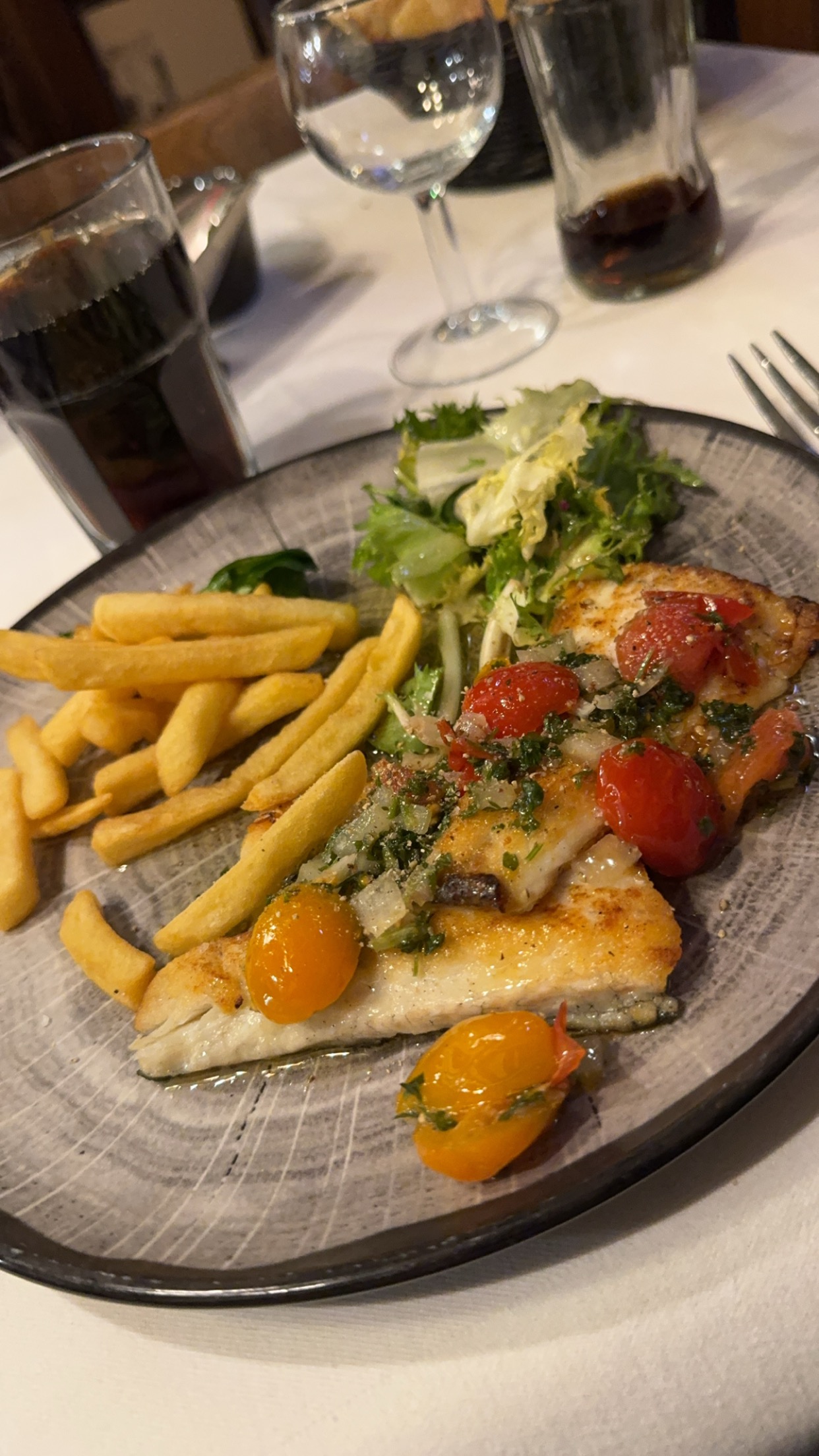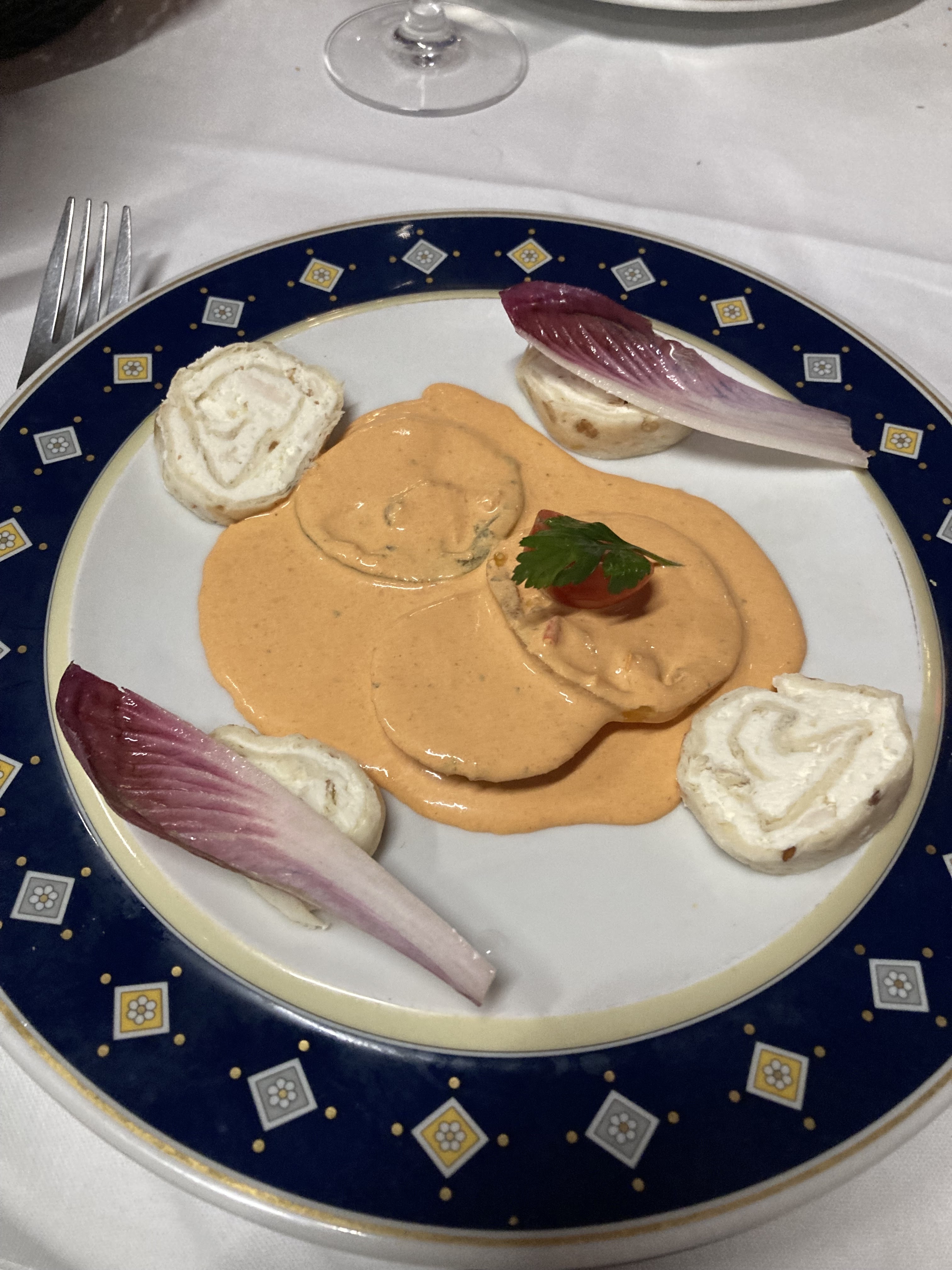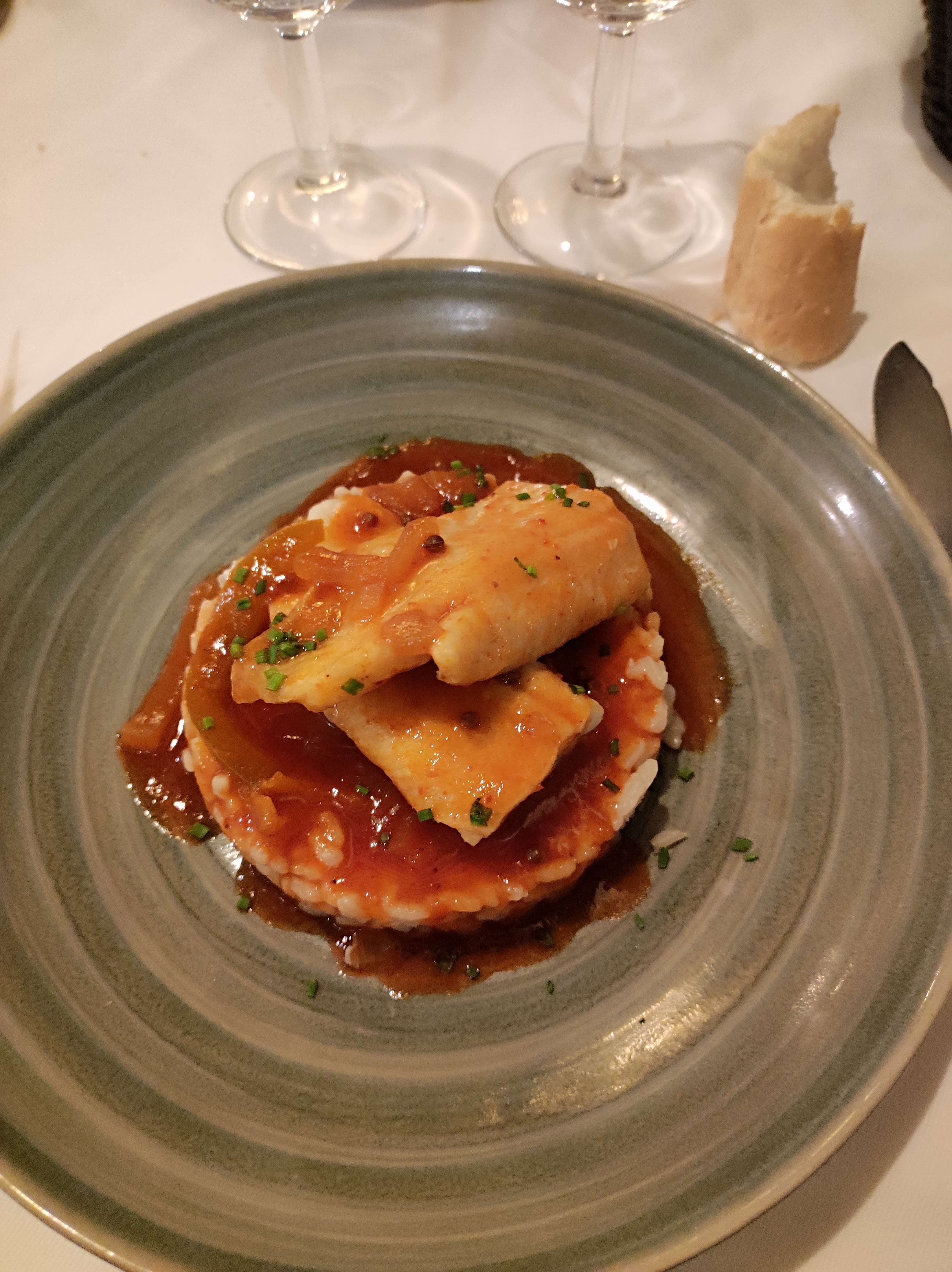 Apéritif olives sauce tomate qui ne semble pas frais et venir d'un mélange des autres tables. Pain mou. Bon saumon fumé. Soupe de poisson bonne mais qui ne semble pas faite maison avec croutons qui sont en fait des rondelles de pains non mangés par les clients et qu'on a grillé afin de ne pas les perdre. Entrées et plats à manger rapidement car c'est juste chaud (service plutôt long). Dessert meringue beaucoup trop sucré. Petite forêt noire qui n'a aucun goût, sauf les 3 cerises bien aromatisées.