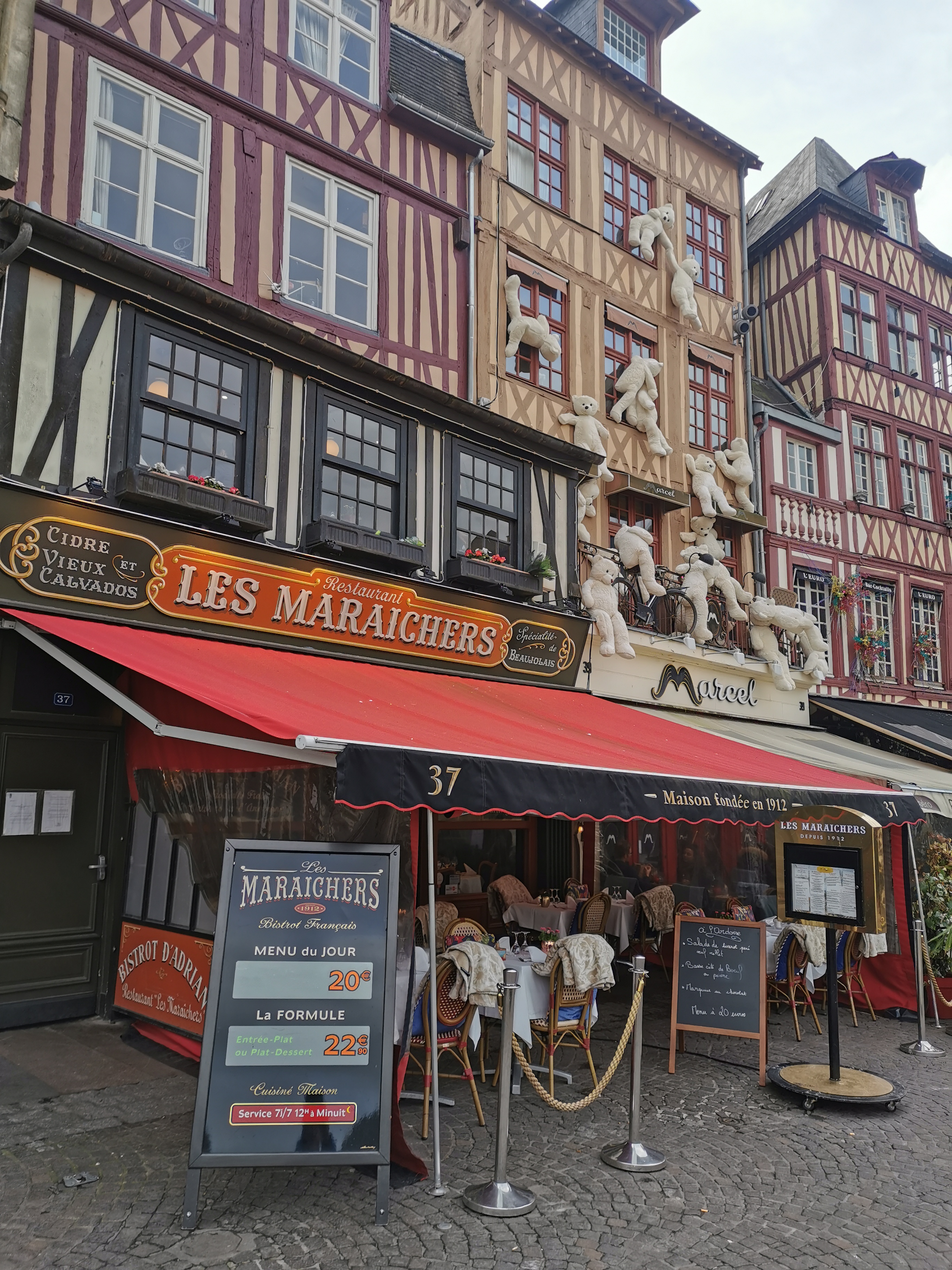 TRES BEAU RESTAURANT SUR LA PLACE DU VIEUX MARCHE A ROUEN DEPUIS 1912 AVEC POUTRES APPARENTES ET ON Y MANGE TRES BIEN