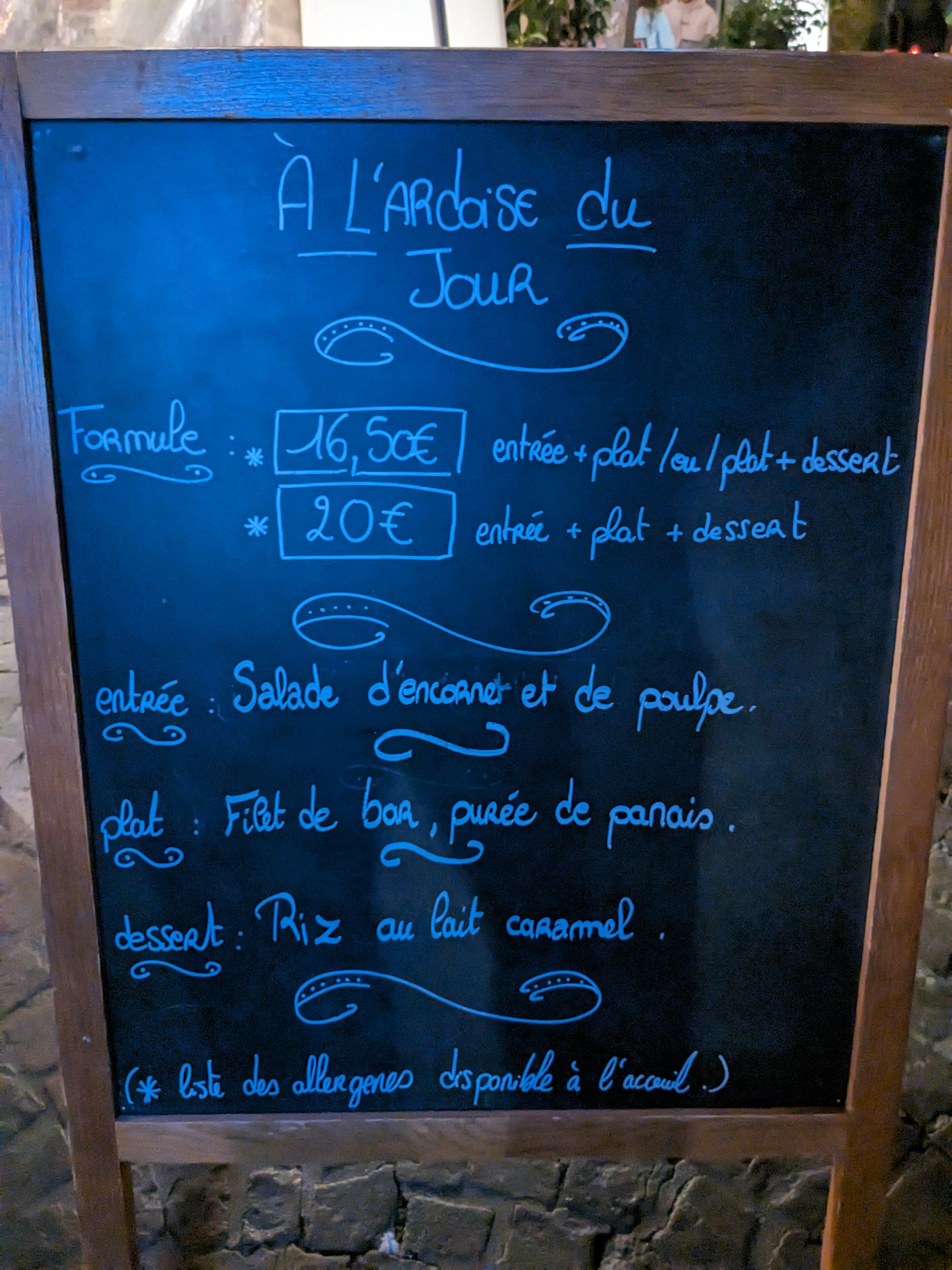 Visite dimanche midi 12/09 en fond de terrasse. Formule ardoise avec un très bon rapport qualité/prix. Le poisson accompagné de riz noir était très bon. La salade de chèvre un peu légère. Par contre 2 heures pour un repas composé de 2 entrées, 3 plats et 3 desserts. Une véritable blague. Et le serveur qui a toujours la phrase pour remettre de l'huile sur le feu au lieu d'apaiser. D'autres tables se sont également plaintes du service. En cas de problème d'effectif, il vaut mieux réduire sa capacité.