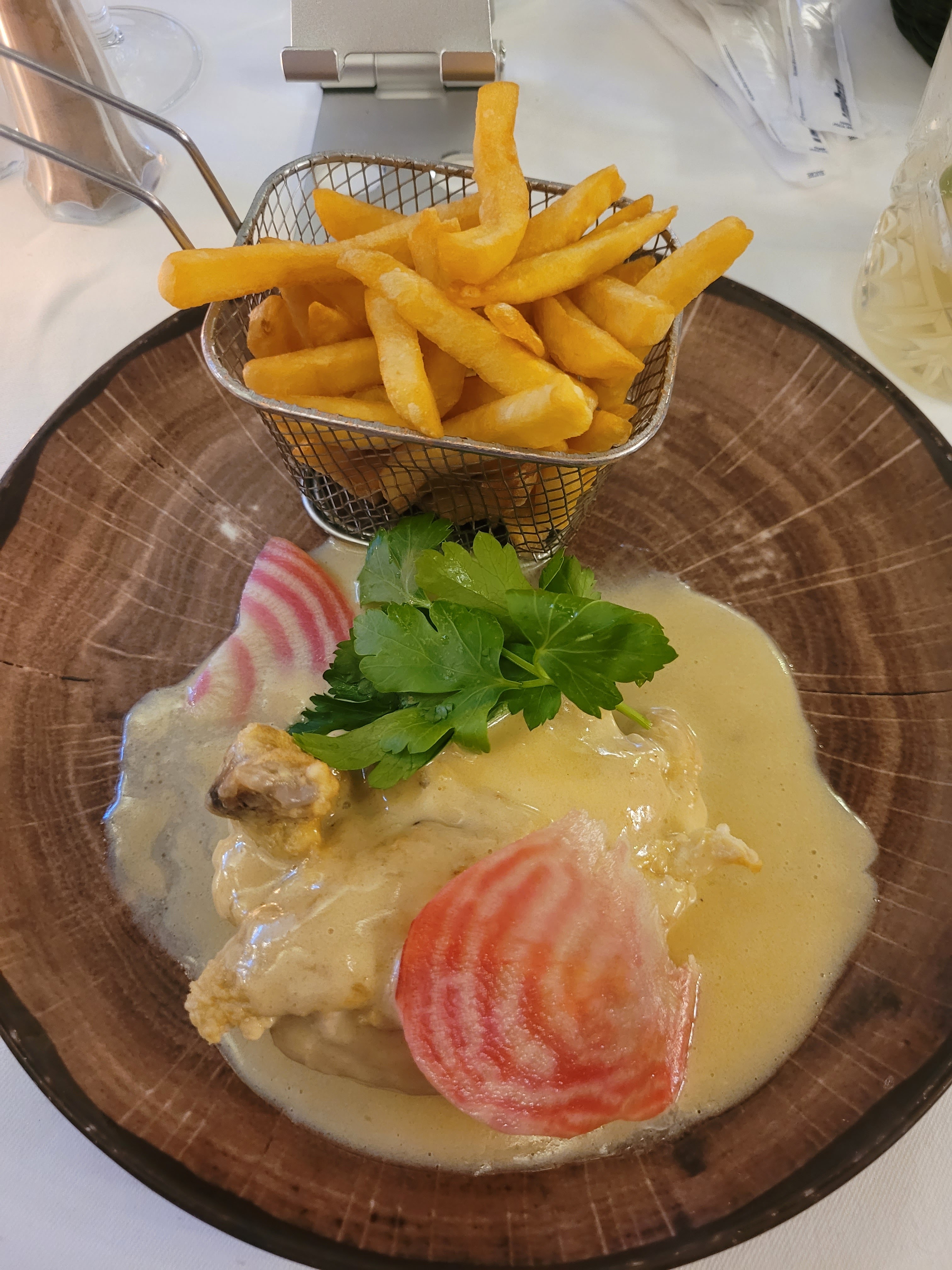La cassolette de la mer au menu était plus attrayante et meilleure que la tourte de la mer à aujourd'hui... les filets de poisson étaient entiers et moins en morceaux à aujourd'hui, et il y avait du haddock...Pourquoi mettre des haricots verts et des petits pois à présent, en supplément des pommes de terre carottes ? Une bonne adresse néanmoins