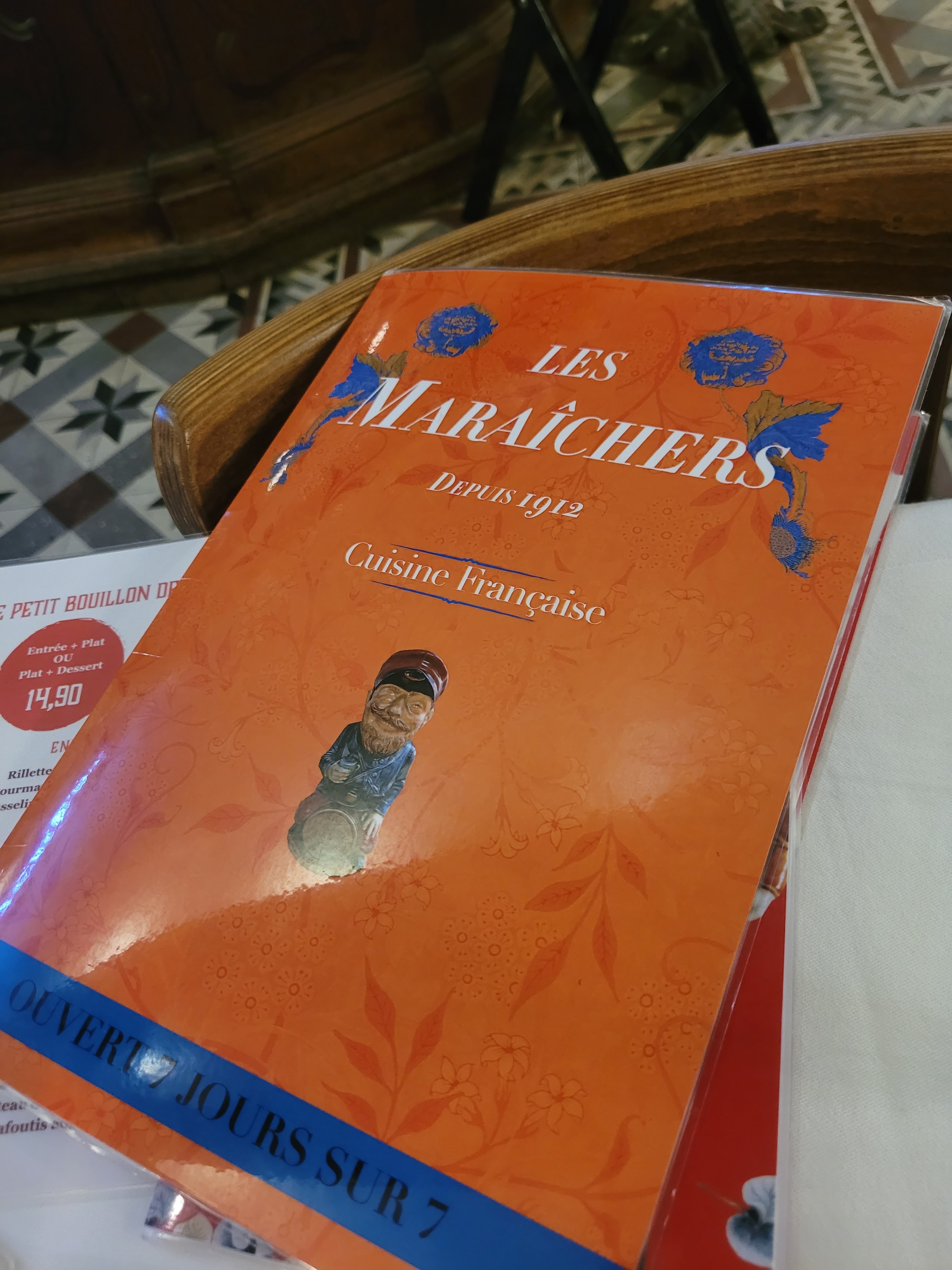 Nous avons pris les petits bouillons qui sont les premiers menus accessibles. Les repas, entrées -plats- desserts étaient bons, bien assaisonnés, mais pas suffisamment copieux. Notre principal regret est l'absence de légumes. C'est dommage pour un resto qui s'appelle les Maraîchers.