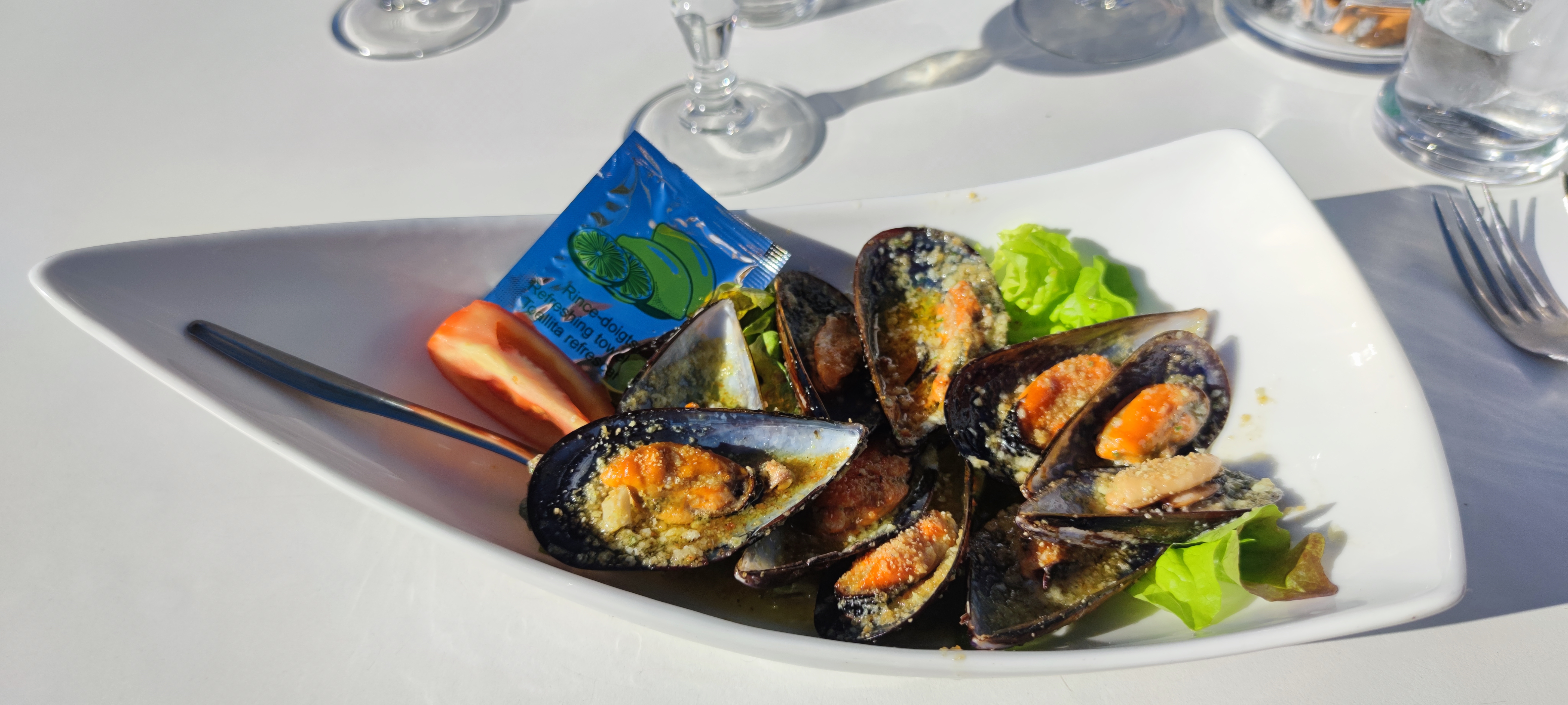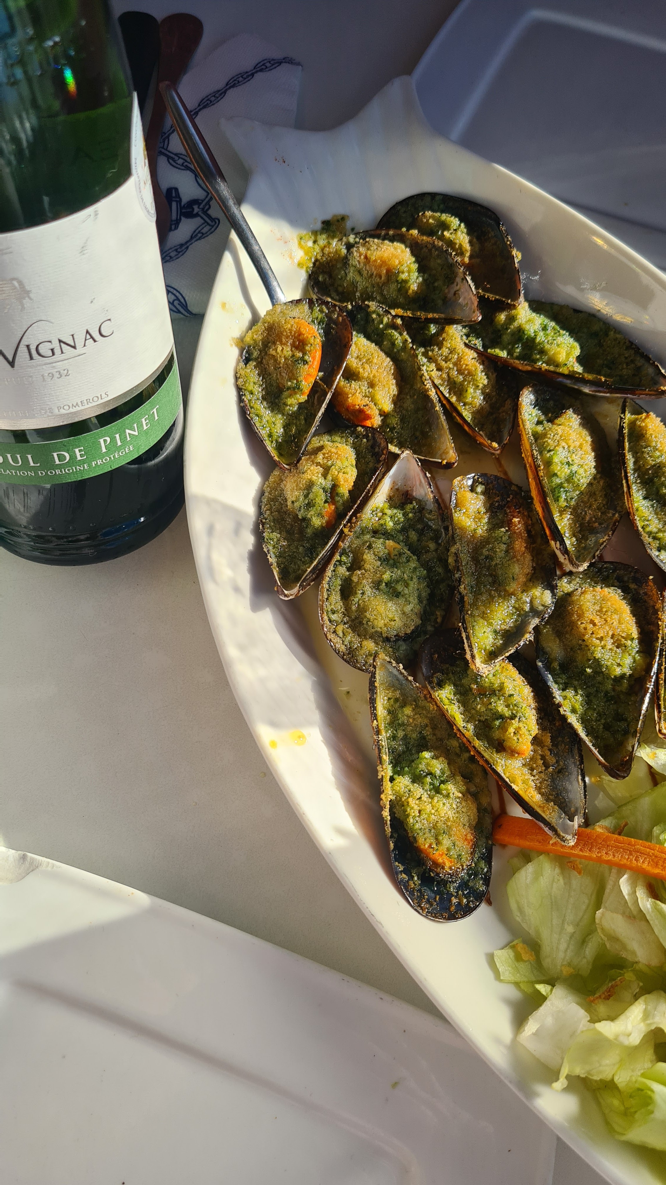 Personnel agréable. Moules farcies fades. Salade du pêcheur avec beaucoup de salade...