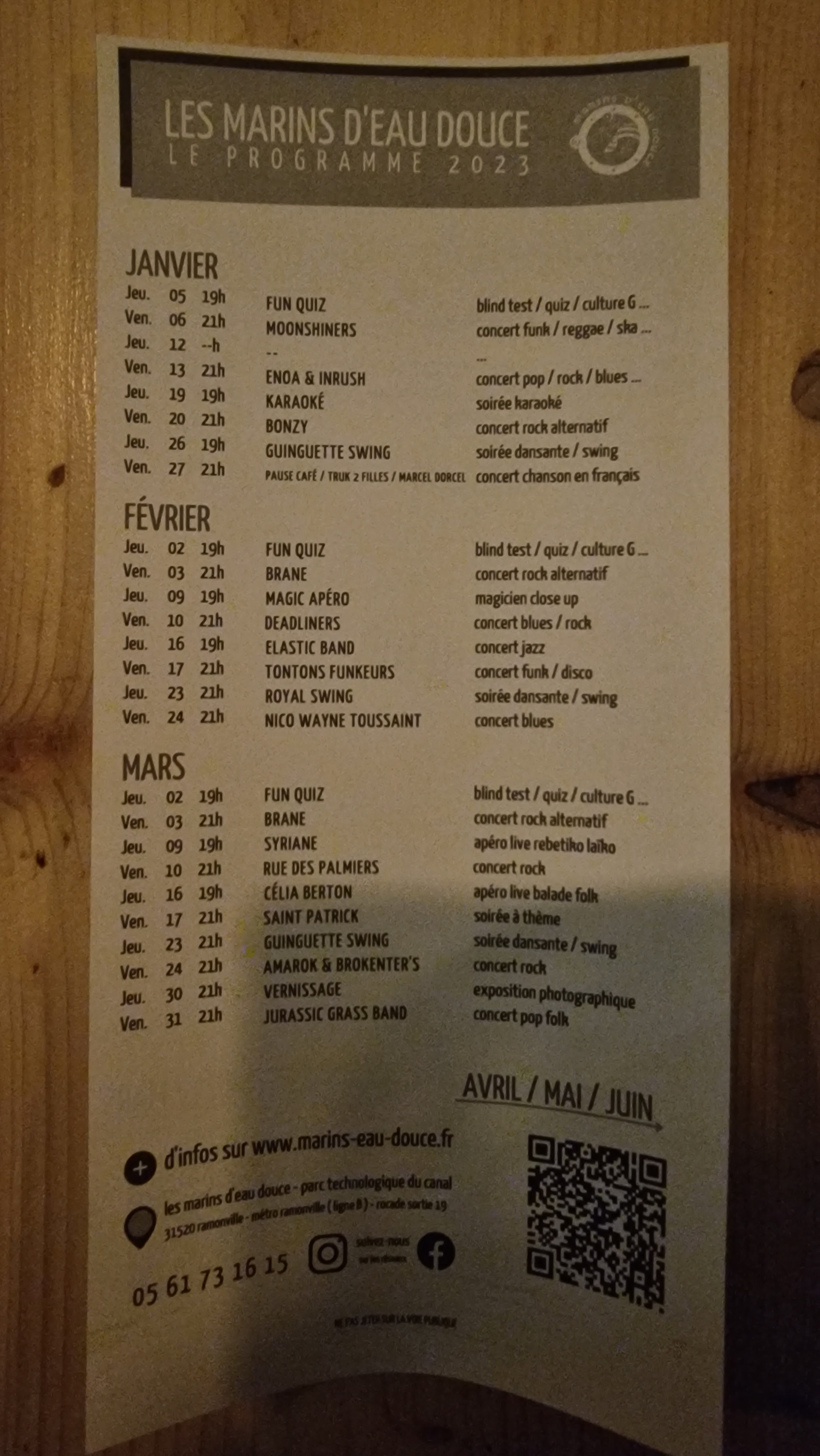 Super concert ce soir aux Marins D'eau Douce dans un cadre magnifique. De très bons tapas préparés et servis par une équipe aux petits soins! On adore et on attend la prochaine avec impatience. Merci!