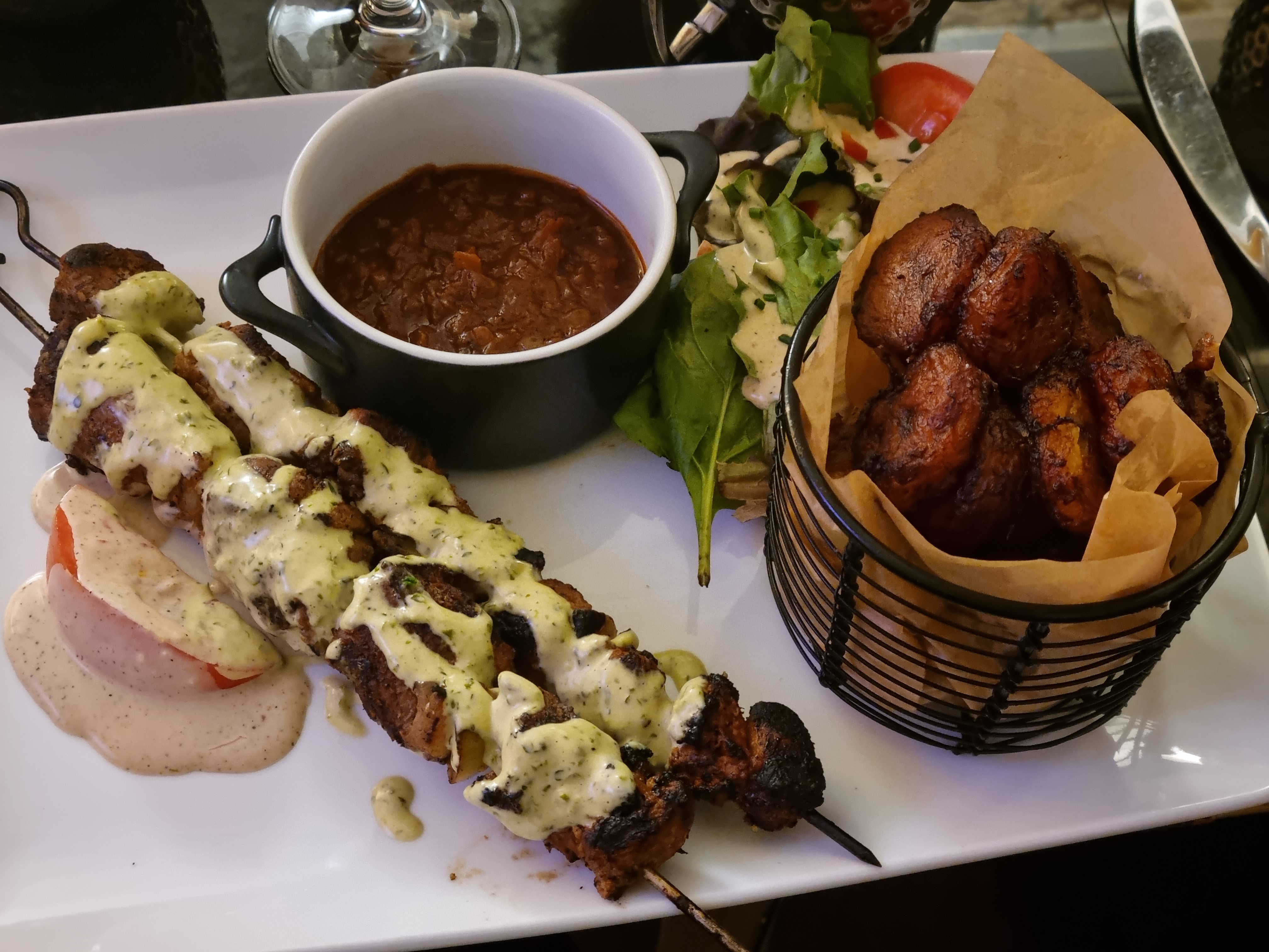 Sympa niveau accueil et endroit , de la musique un peu fort tout le temps , les plats bon mais sans plus , ca vaut pas les plats de daronne. Je sais que cest la mode mais les prix sont excessifs par rapport au contenu 16€ pour 4 accras + 2 pastels … et 1 demi feuille de salade cest presque drole . j’y retournerais pas