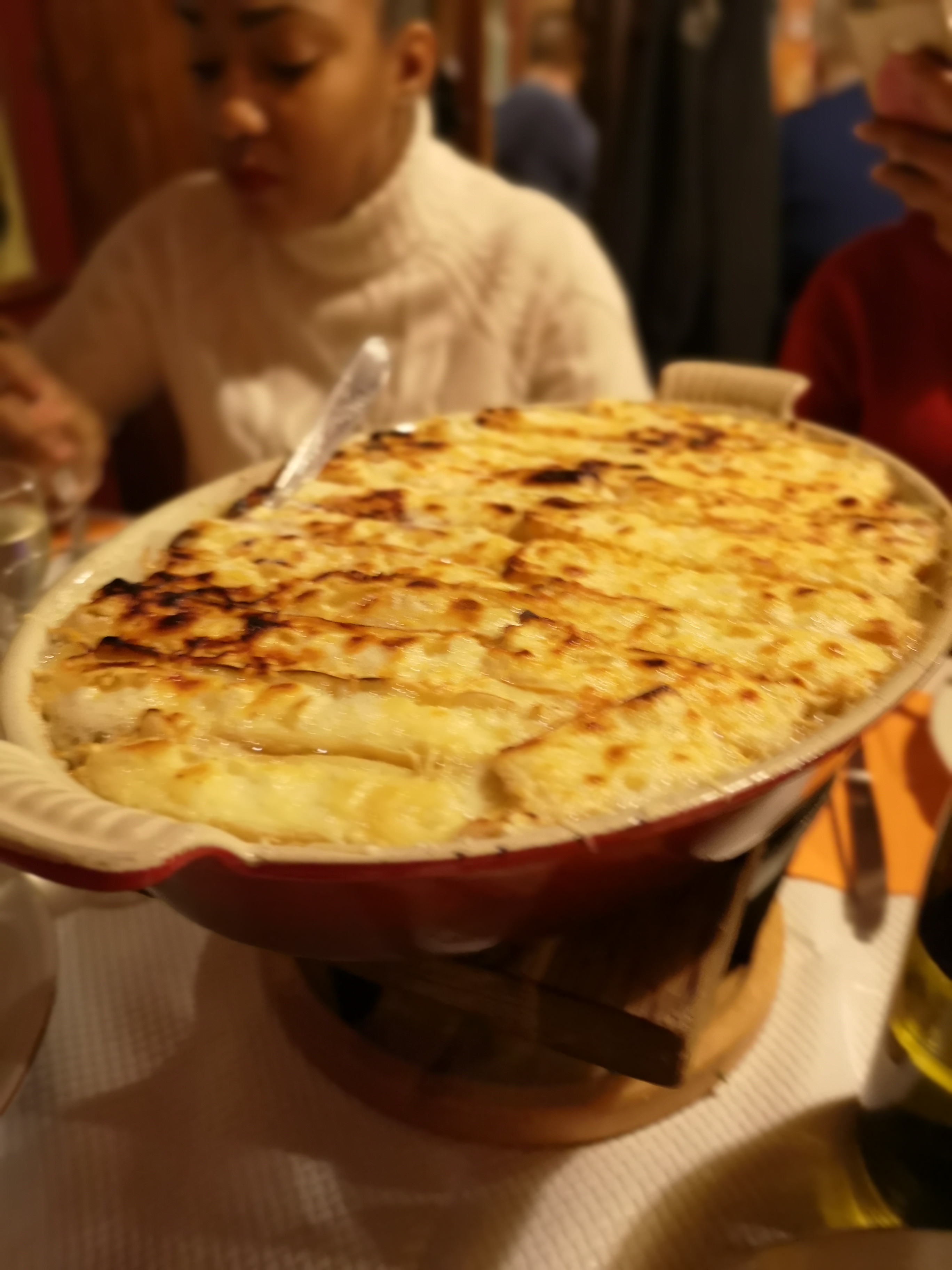En deux mots ? A fuir. Si vous n'êtes pas savoyard/haut savoyard et que vous rêvez de vivre une expérience culinaire à la hauteur de ce que ces régions ont à vous offrir : ouvrez Marmiton et faites-le vous mêmes. Quant aux pures souches, la déception sera d'autant plus grande ... Nous sommes venus à 5, soit : 1 gratin de crozet aux cèpes, 2 tartiflettes classique et 2 tartiflettes aux cèpes. Je n'ai pas pu finir le gratin, et pour + de 20€ le plat, j'étais vraiment embêtée. C'est fade, manque de sel, et les cèpes... bien qu'il y en avait 3 tonnes, ils n'apportaient rien. Pour mes amis, même chose. Les tartiflettes sont servis dans 1 plat taille moyenne en fonte, pour 2 personnes.... 2 personnes ?! Pour les plus gourmands d'entre vous, cela ne vous suffira pas. Et le problème reste le même : fade. Classique ou aux cèpes, vous aurez beau vous endormir sur le sel, cela n'y changera pas grand chose (à part boire 3L d'eau). La finalité ? 2 d'entre nous sont tombés malades (intoxication alimentaire pour la team tartiflette aux cèpes) Et pour ceux qui souhaitent partir sur une raclette, sachez qu'il vous faudra faire le déplacement pour vous servir en fromage. En peak time, je n'ose même pas imaginer l'attente ... C'est bien dommage.