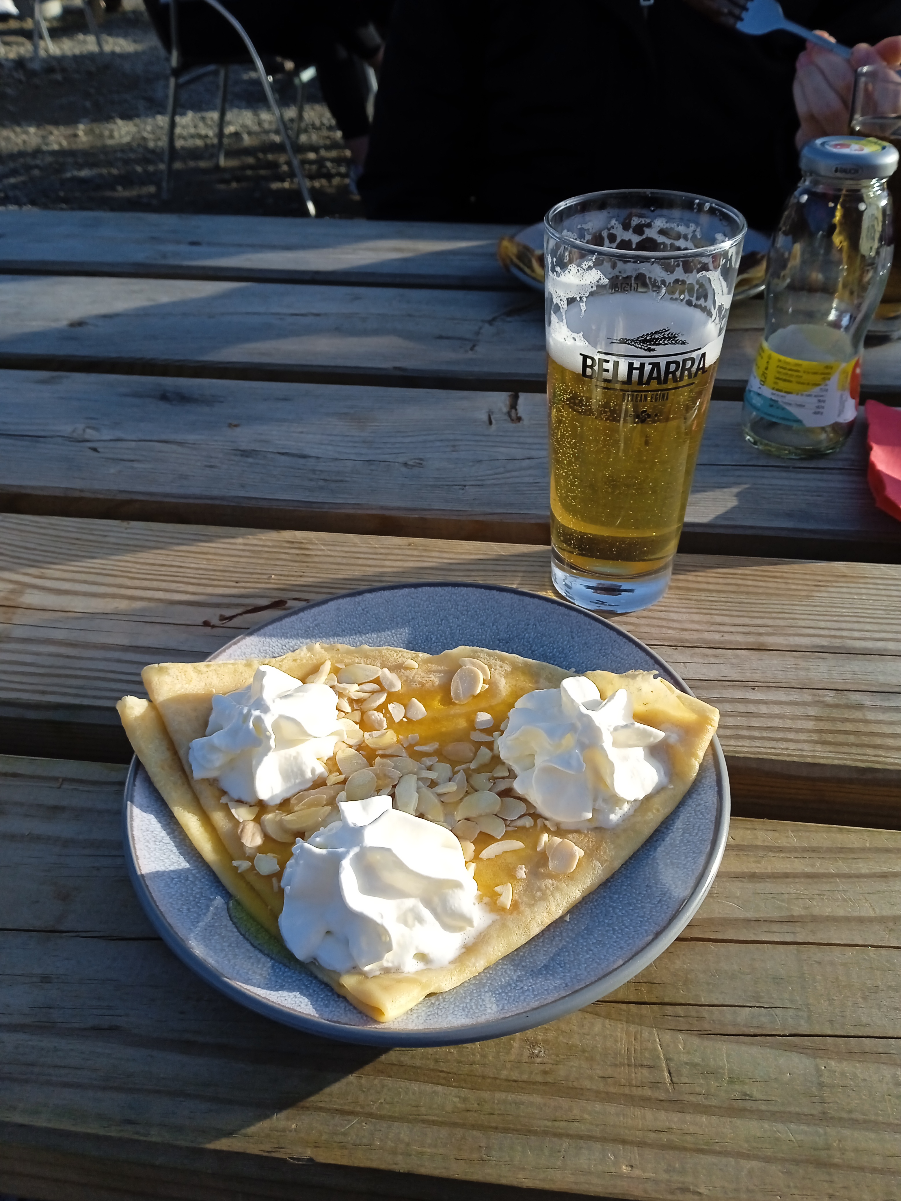 Nous nous sommes arrêtés en terrasse pour manger une crêpe et boire un café. Le ciel en a profité pour nous tomber sur la tête et le patron (et la patronne) des plus sympathiques nous ont offert l'hospitalité le temps que nous puissions repartir sur nos motos. Merci encore à eux, et amis motards n'hésitez pas à vous y arrêter, ils le méritent !